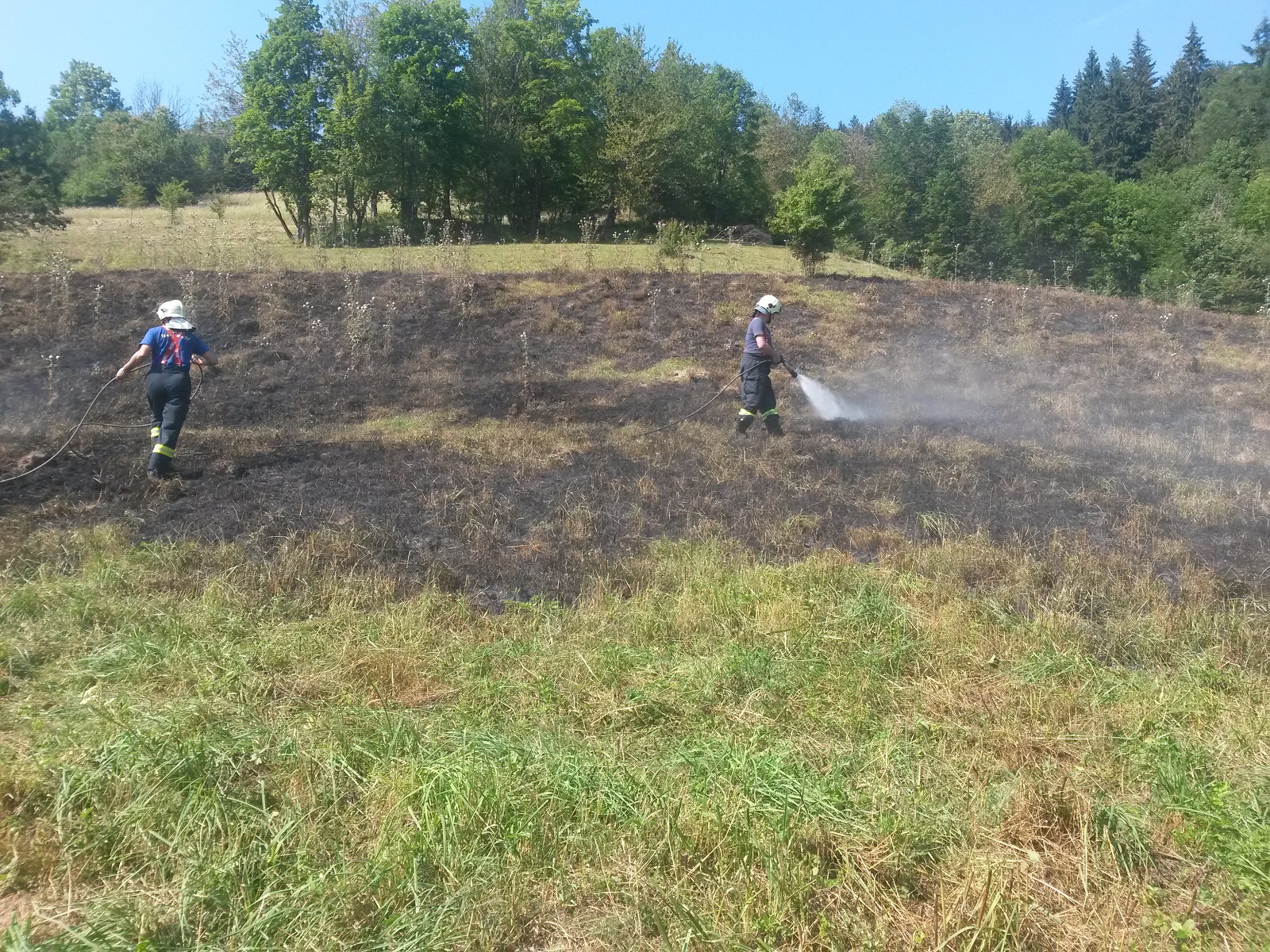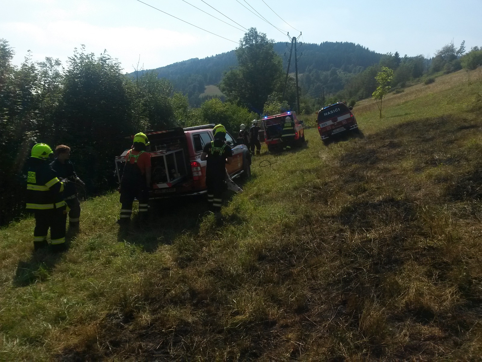 V době příjezdu dobrovolných hasičů hořela louka ve svažitém terénu na ploše asi 5 000 metrů čtverečních. K uhašení požáru stačilo pouze 750 litrů vody, které dohromady převážely terénní vozy.
