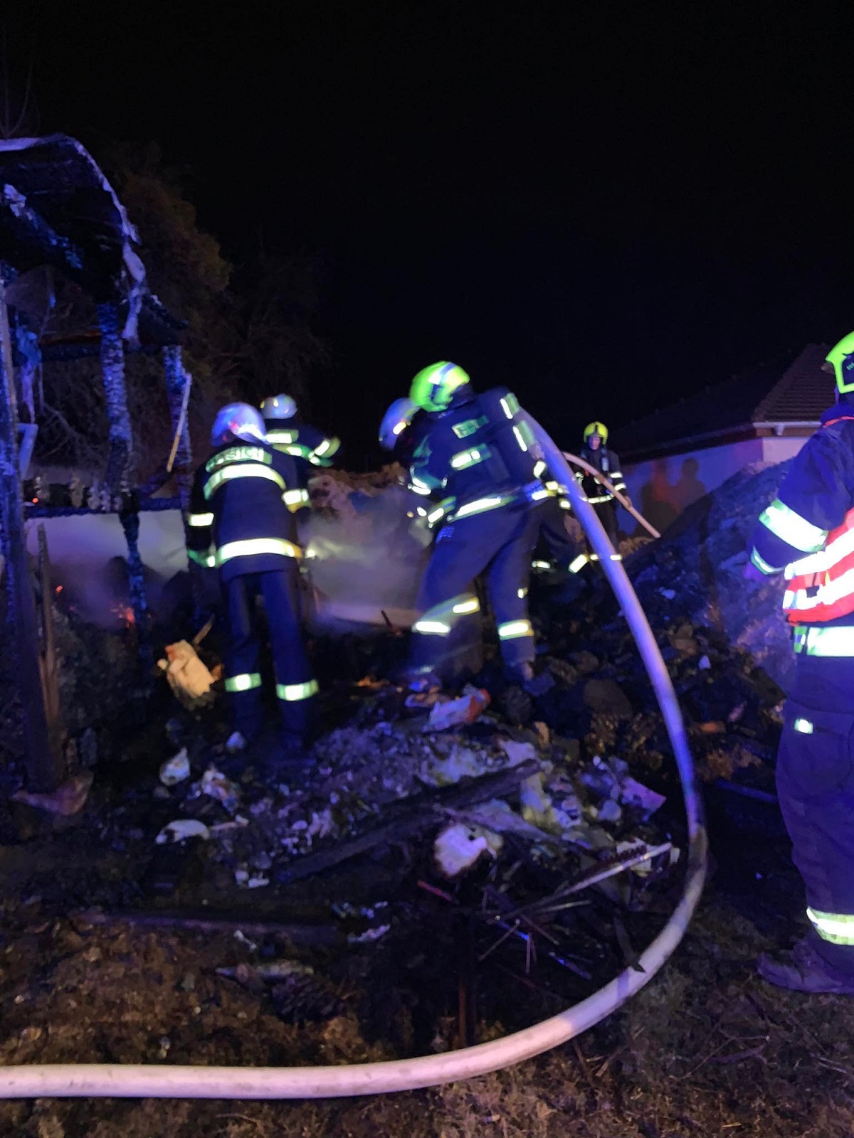 Průzkumem v dýchacích přístrojích jsme zjistili, že hoří malý sklad na stavební materiál v blízkosti rekonstruovaného rodinného domu. K uhašení požáru jsme použili dva útočné proudy C. Doplňování vody k hašení bylo prováděno z místního vodovodního řadu. Bylo odebráno asi 7 000 litrů vody.