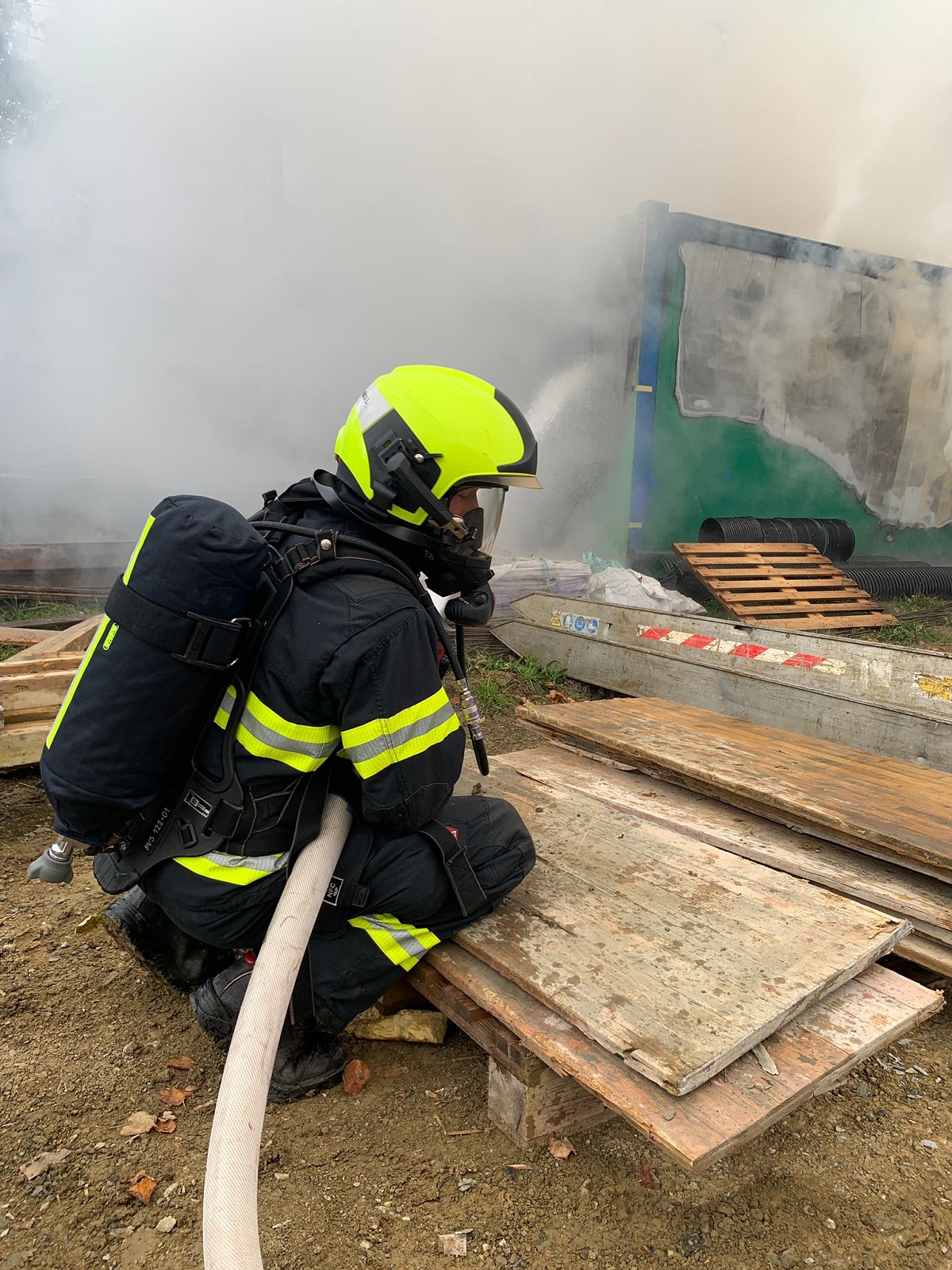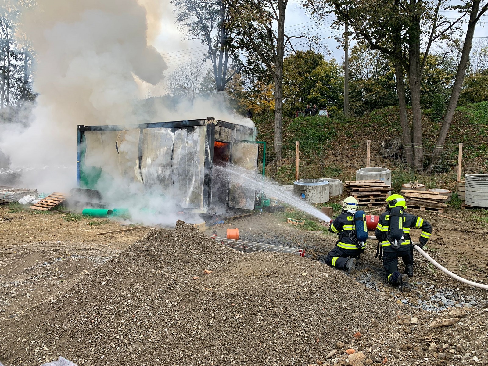 Požár stavební buňky nám byl ohlášen v 11:40 hodin. Požární poplach byl vyhlášen jednotce profesionálních hasičů z požární stanice Valašské Meziříčí a jednotkám Sboru dobrovolných hasičů města Vsetín a obce Lhota u Vsetína.