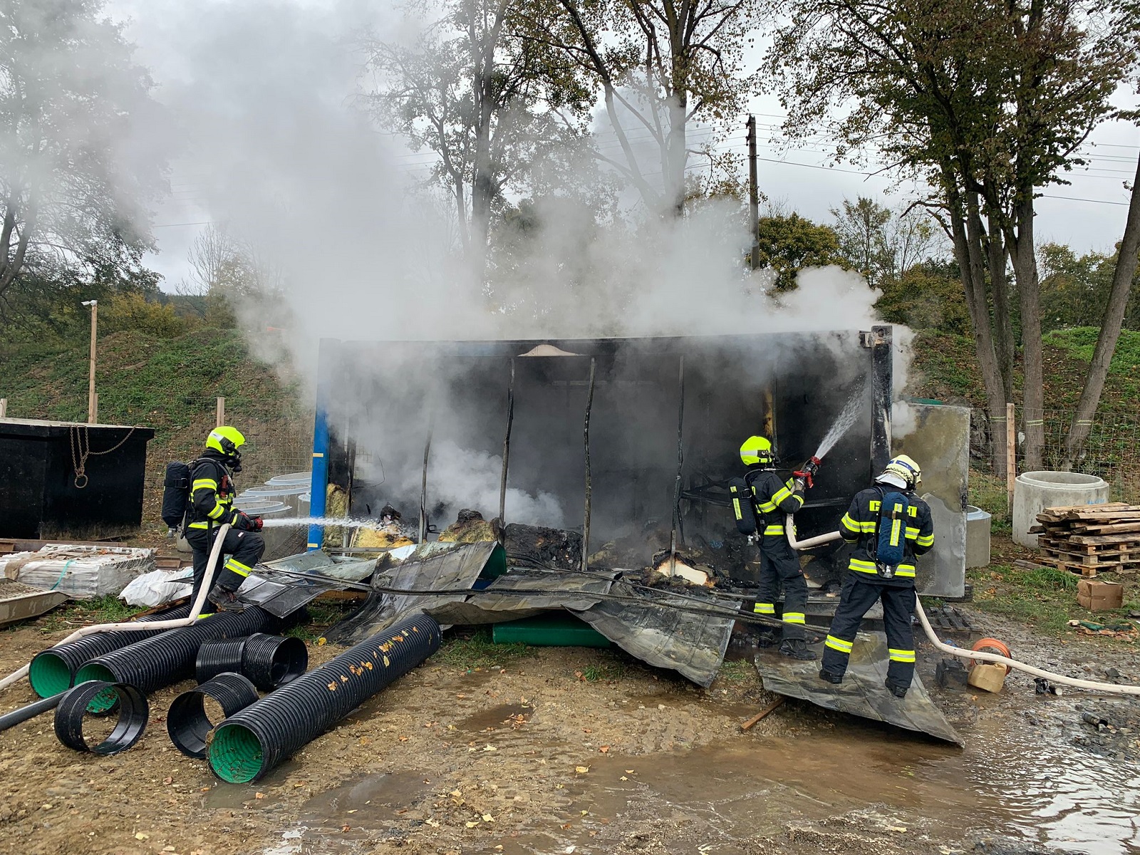 (13. 10. 2021) Před polednem došlo k požáru mobilní buňky v blízkosti stavby stadionu.