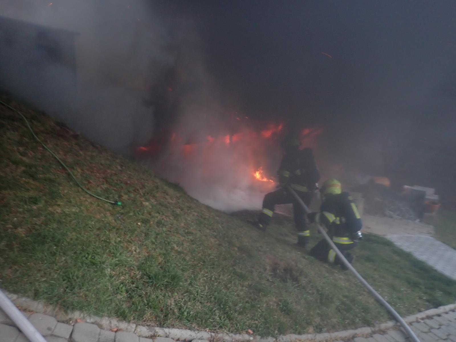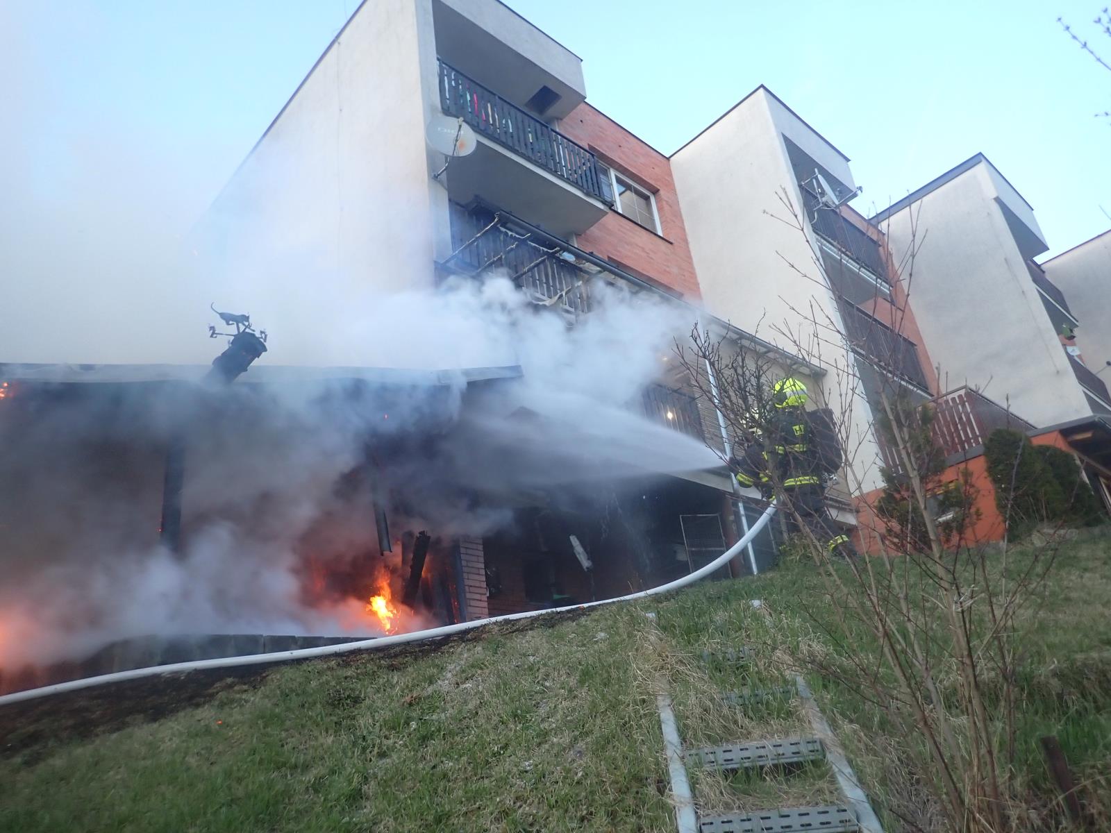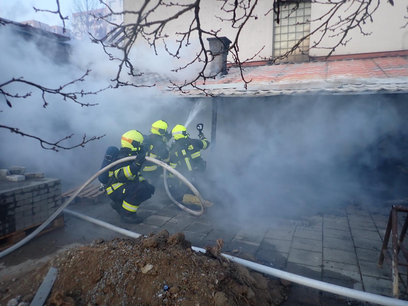 Po příjezdu na místo hasiči průzkumem zjistili, že došlo k požáru v prostoru přístřešku, stojícího těsně vedle rodinného řadového domu. Při požáru byli zraněni obyvatelé zasaženého objektu, kteří se nažili před příjezdem hasičů požár uhasit. Muže i ženu si do péče převzala posádka zdravotnické záchranné služby, která oba ošetřila na místě. Převoz do nemocnice nebyl potřeba.