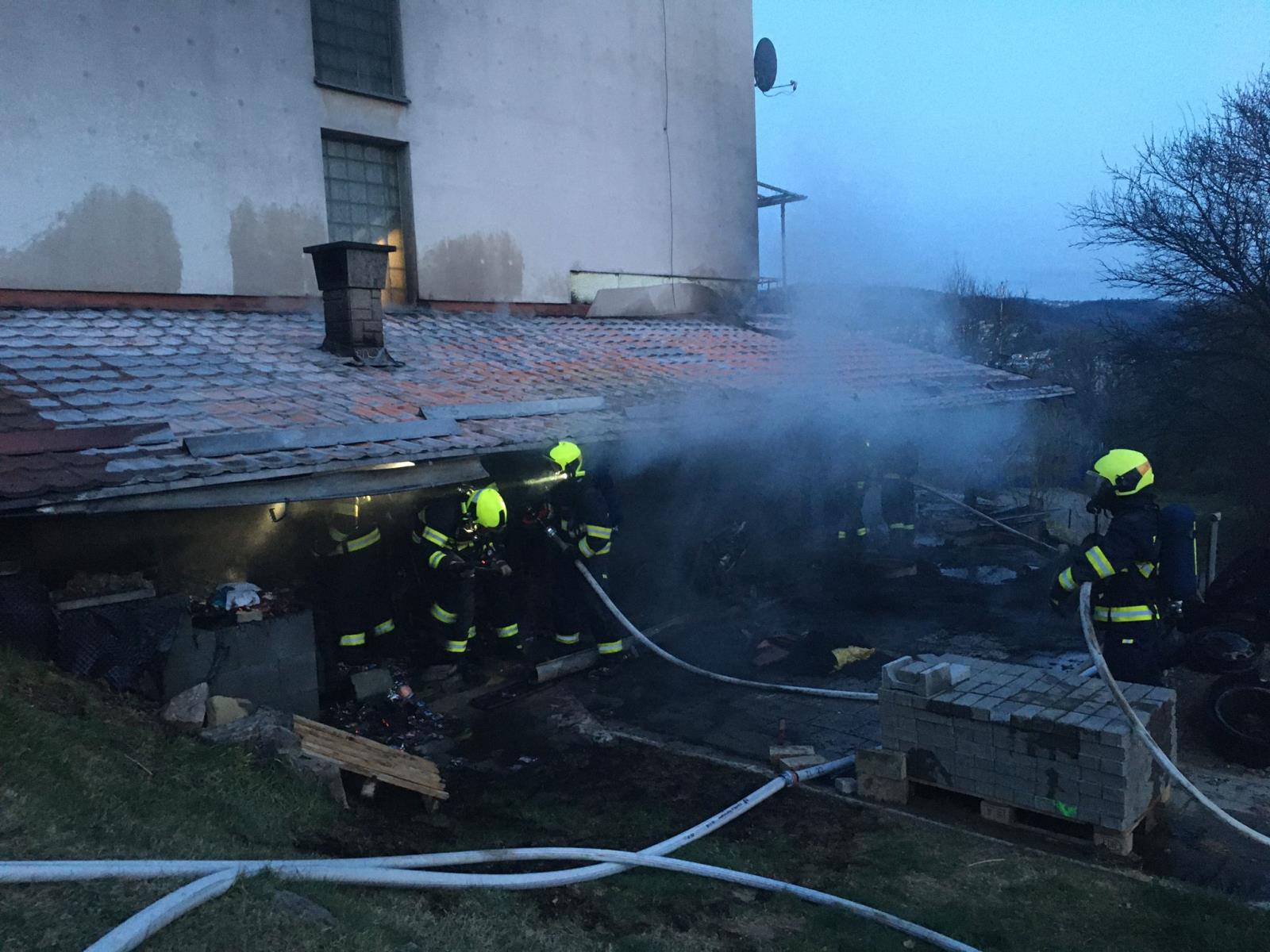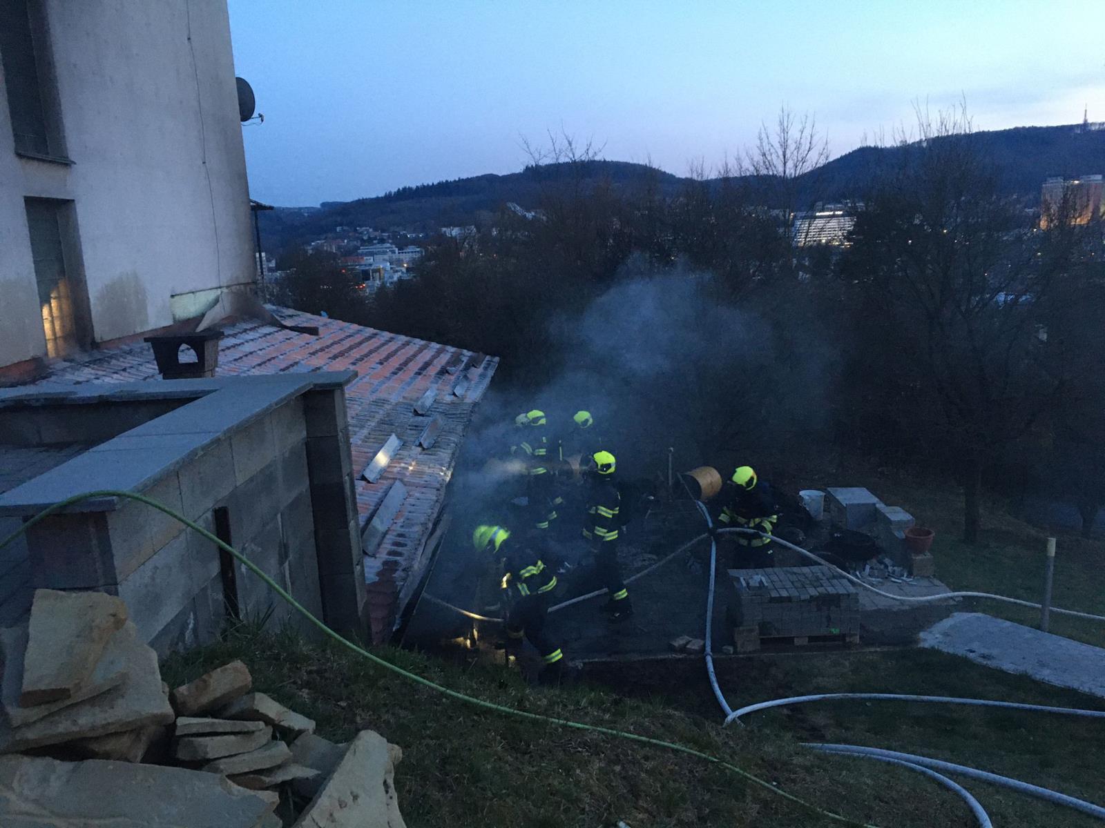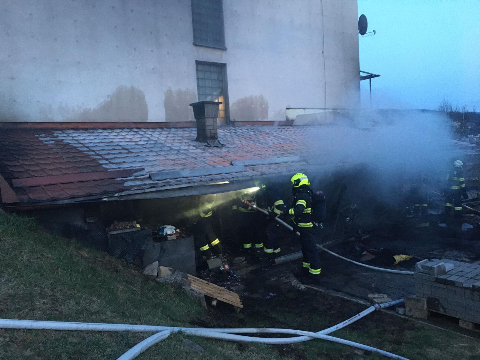Hasiči při likvidaci požáru přístřešku