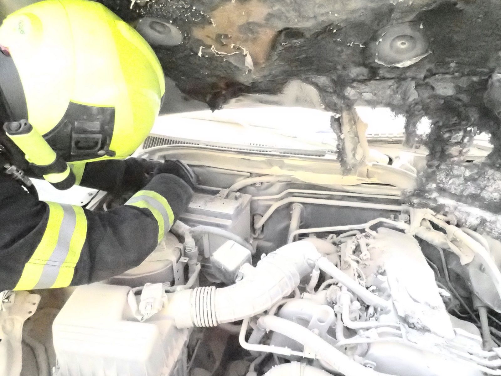 V době našeho příjezdu byl požár uhašen šesti hasicími přístroji a automobily, které stály u hořícího auta, už byly přeparkovány. Provedli jsme proto odpojení akumulátoru a termokamerou překontrolovali teploty. Požár se nerozšířil do kabiny vozu. K zranění osob nedošlo.