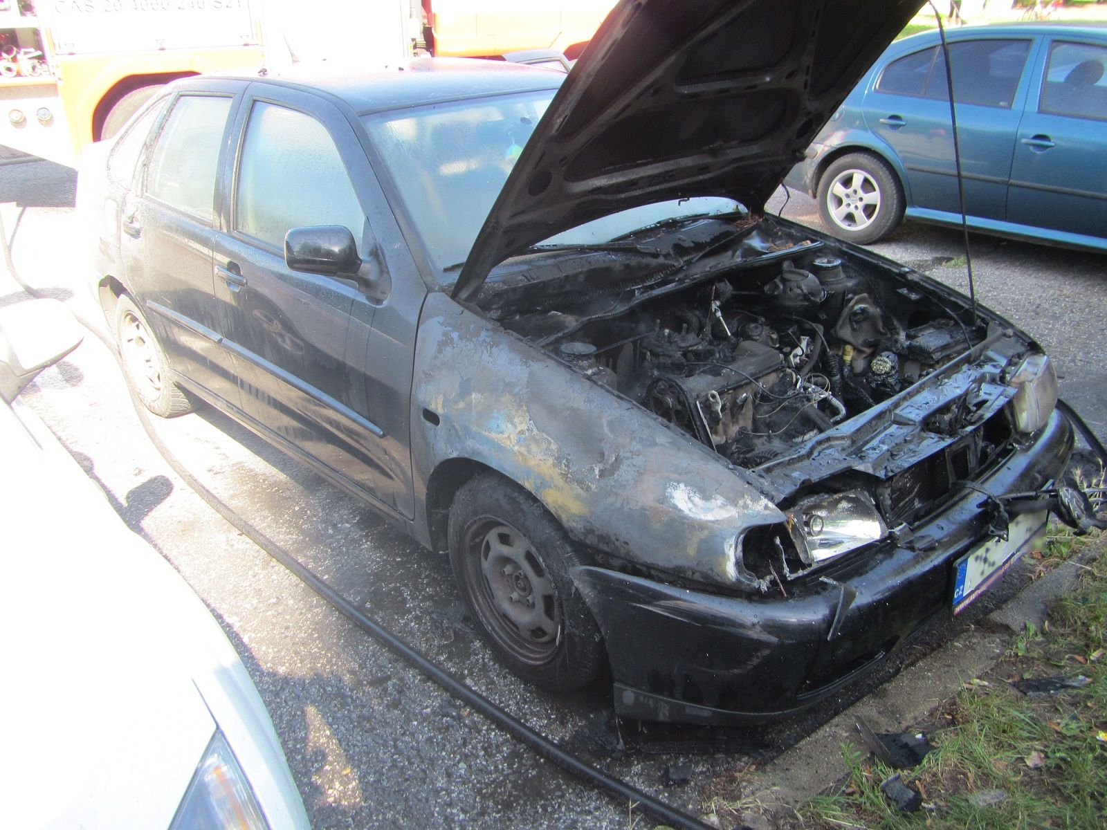 Hořící automobil Volkswagen Polo stál na parkovišti v blízkosti prodejny Albert mezi dalšími zaparkovanými