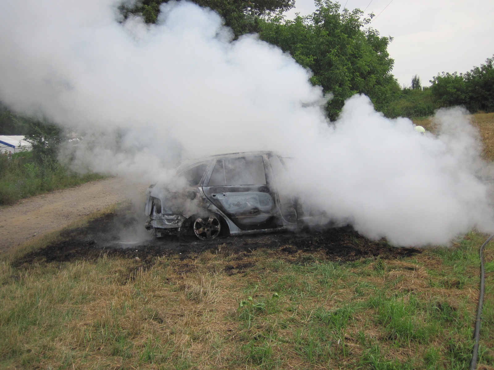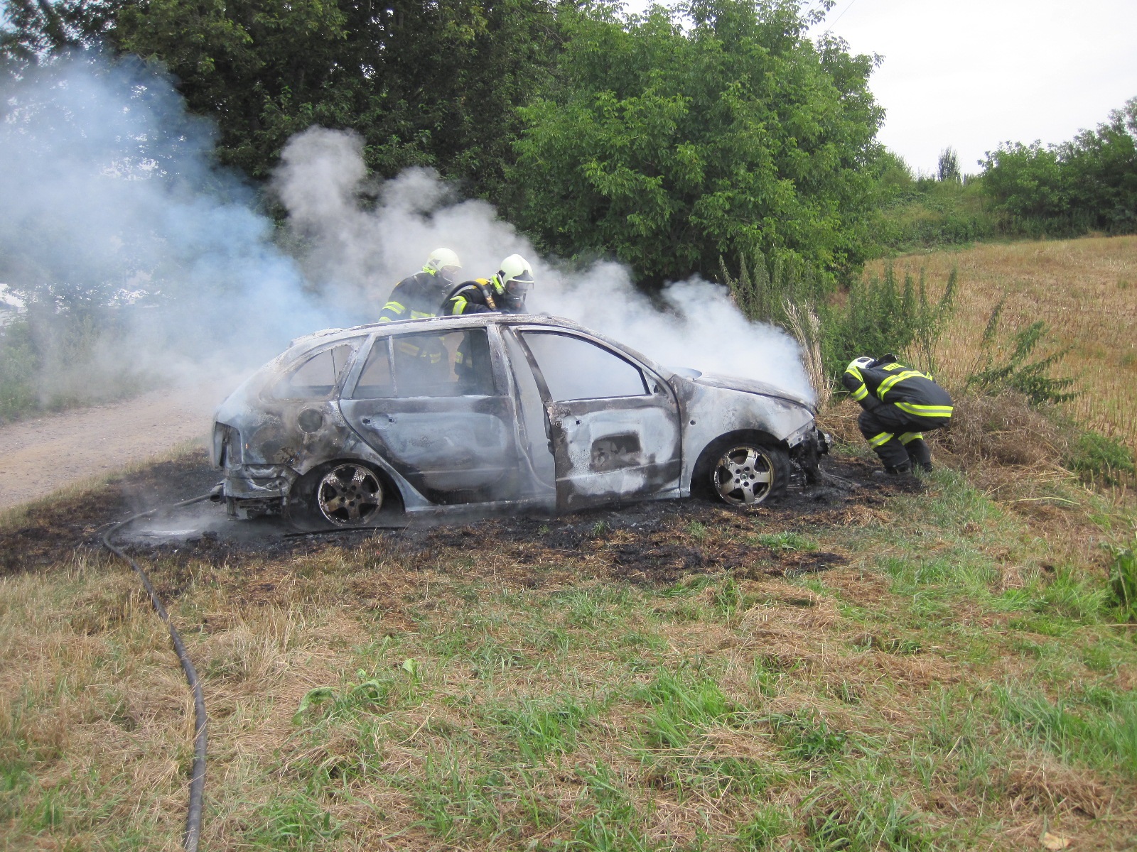 Hasiče navigoval k místu požáru šedý dým. U hořícího automobilu byli jako první dobrovolní hasiči z Bílovic, kteří v dýchacích přístrojích začali požár hasit s jedním vysokotlakým proudem vody. Jak hasiči zjistili, hořící automobil byl v místní části Bůrovce, kde přes víkend probíhá 19. ročník motosrazu. Okolo stojící vozidla byla ještě před příjezdem hasičů přemístěna, takže nedošlo k větším škodám.
