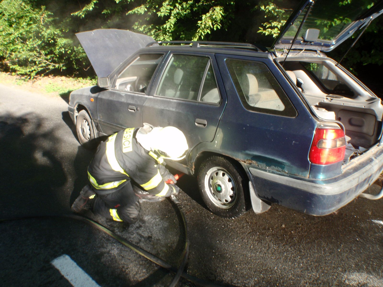 Po příjezdu bylo zjištěno, že k požáru došlo ve spodní části vozidla u výfukového potrubí. Pomocí vysokotlakého proudu hasiči požár rychle zlikvidovali a zasažený prostor ochladili. Díky rychlé likvidaci požár nezpůsobil  větší škodu.