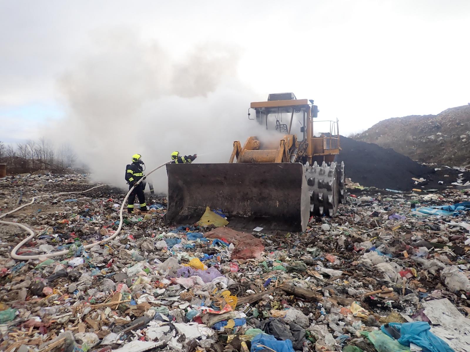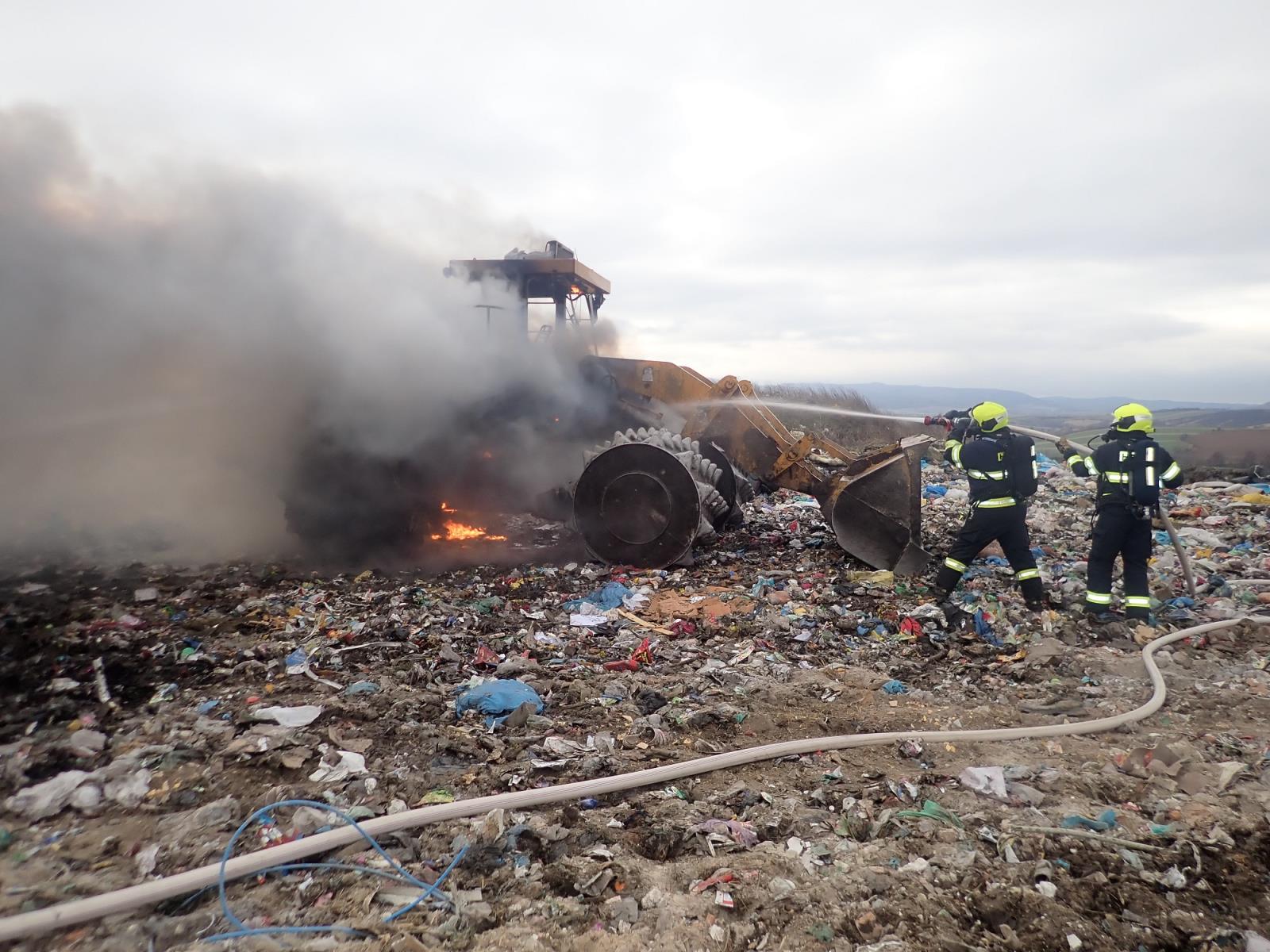 Při příjezdu k požáru byl celý pracovní stroj v plamenech. Požár jsme hasili v dýchacích přístrojích dvěma proudy vody B se smáčedlem. Požár se nerozšířil na těleso skládky. K lokalizaci požáru došlo v 10:33 hodin.