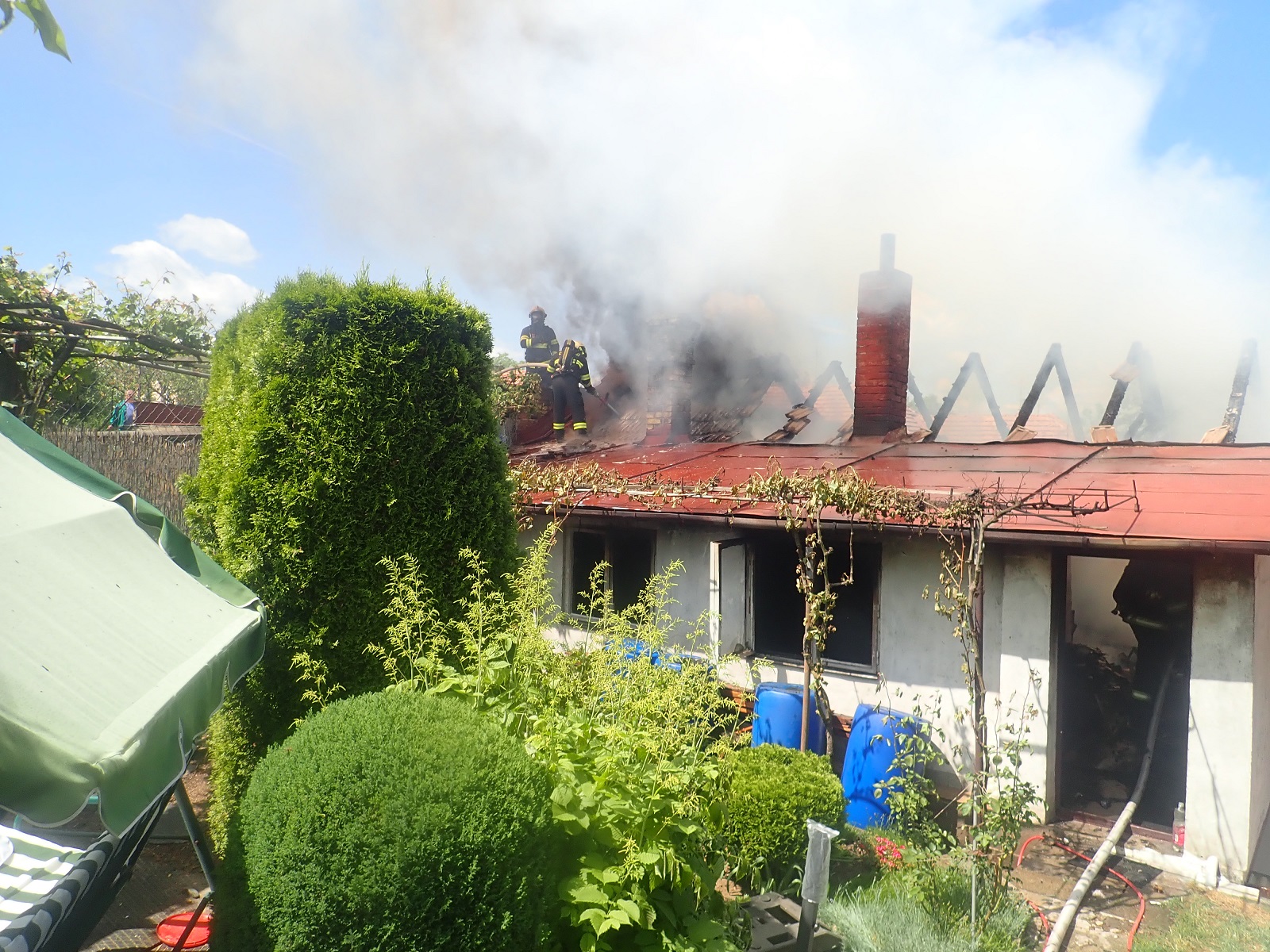 Při našem příjezdu už byla celá střecha v plamenech. Majitel objektu byl v péči Zdravotnické záchranné služby Zlínského kraje. Sanitka zraněného muže odvezla do nemocnice. Ten se později vrátil zpět. V dýchacích přístrojích jsme provedli vypnutí elektřiny. K uhašení nasadili dva útočné proudy vody C a jeden vysokotlaký proud vody. Zároveň jsme prováděli i ochlazování sousedního domu.