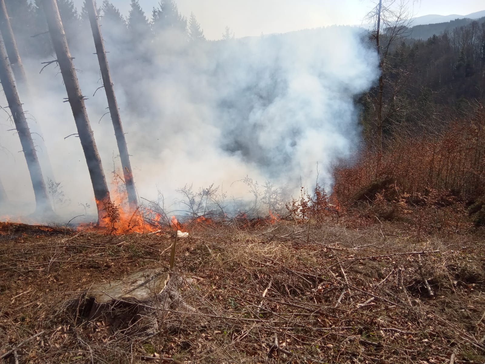Vsetínští profesionální hasiči společně s hasiči dobrovolných jednotek z Jablůnky, Vsetína, Lhoty u Vsetína, Halenkova a Karolinky hasí rozsáhlý požár, který díky větru utekl dělníkům, likvidujícím zbytky klestí. Požár je však ve velmi těžko dostupném místě a hasiči mají problém dopravit na požářiště vodu. Blíže k plamenům s cisternami nepřijedou. Hasí dvěma proudy vody a vysokotlakem z menších vozidel dobrovolných hasičů. Kde se s vodou nedostanou, je nutné hasit ručně z vaků. K zamezení dalšího šíření ohně do širšího okolí obkopávají zasažené místo. Prolévání tak bude trvat ještě minimálně po zbytek dopoledne.