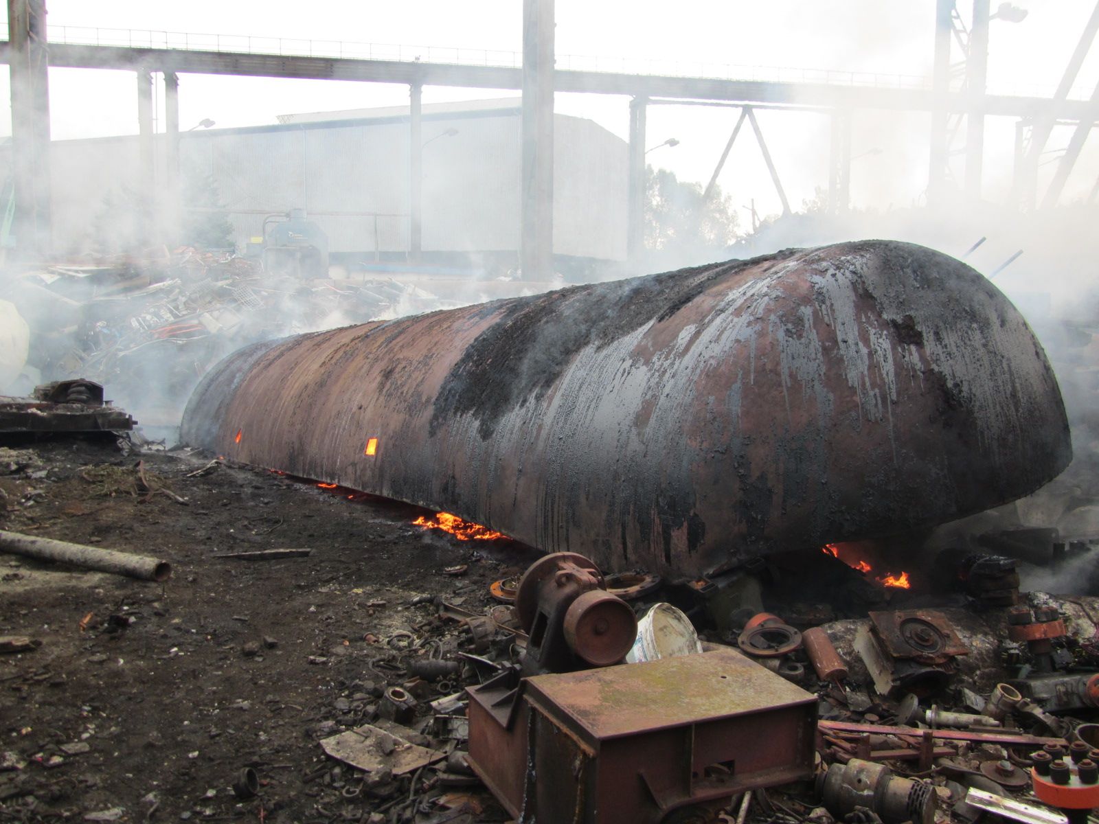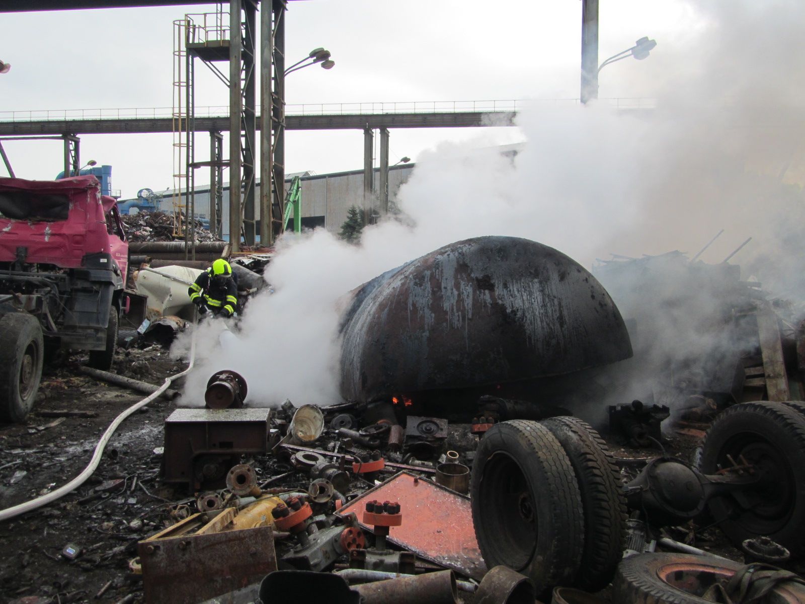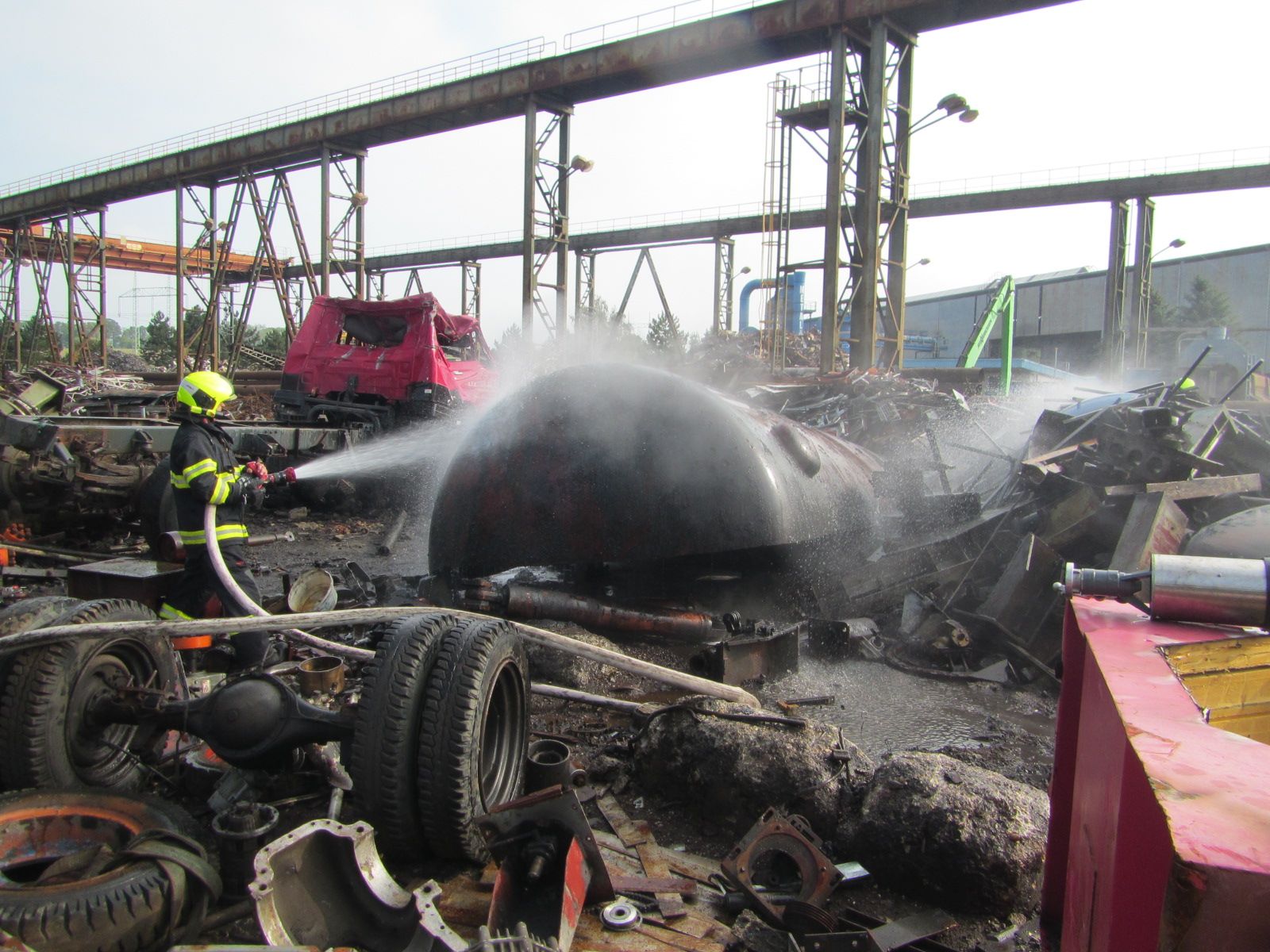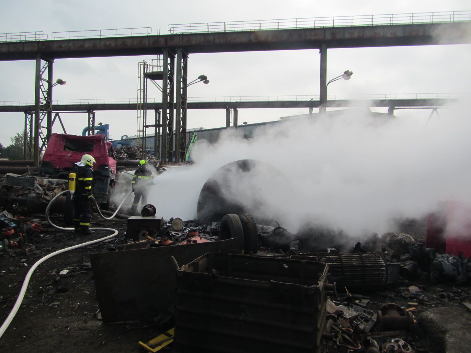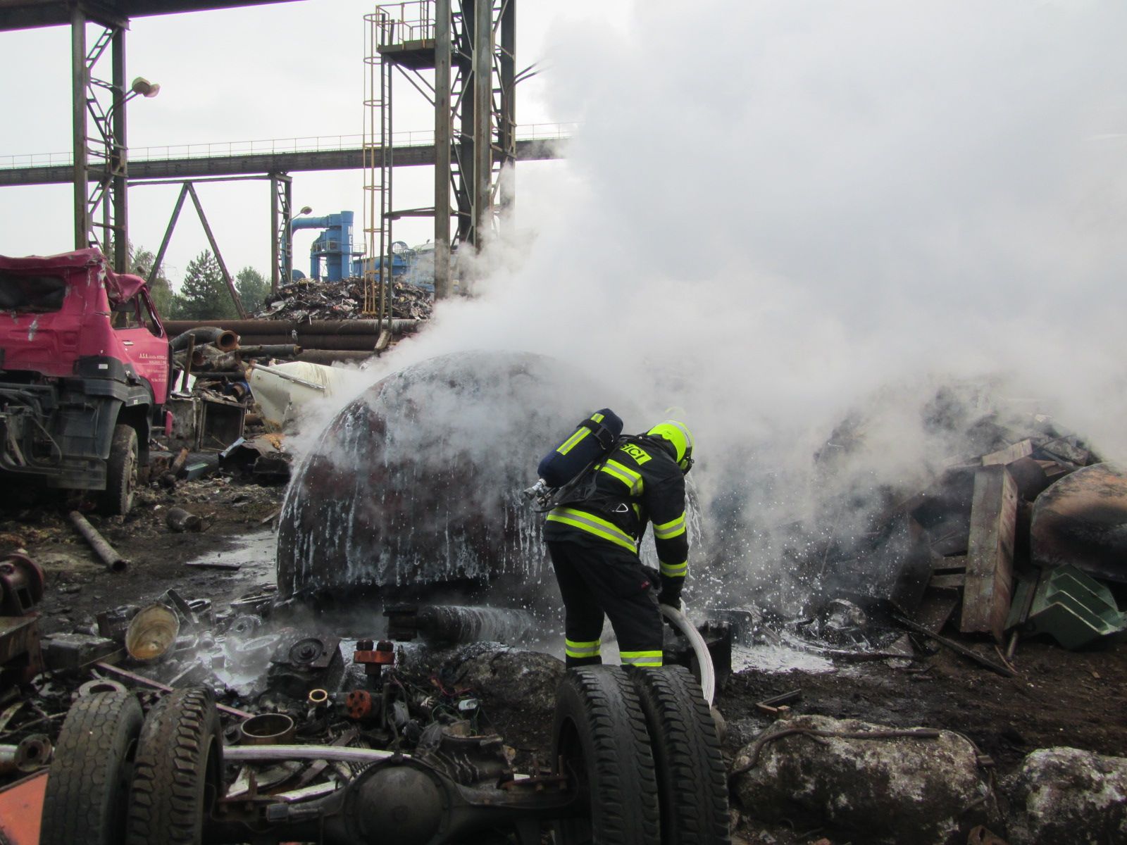 Požár staré nádrže cisterny v areálu kovošrotu v Tlumačově na Zlínsku. Na místo byly vyslány tři jednotky hasičů