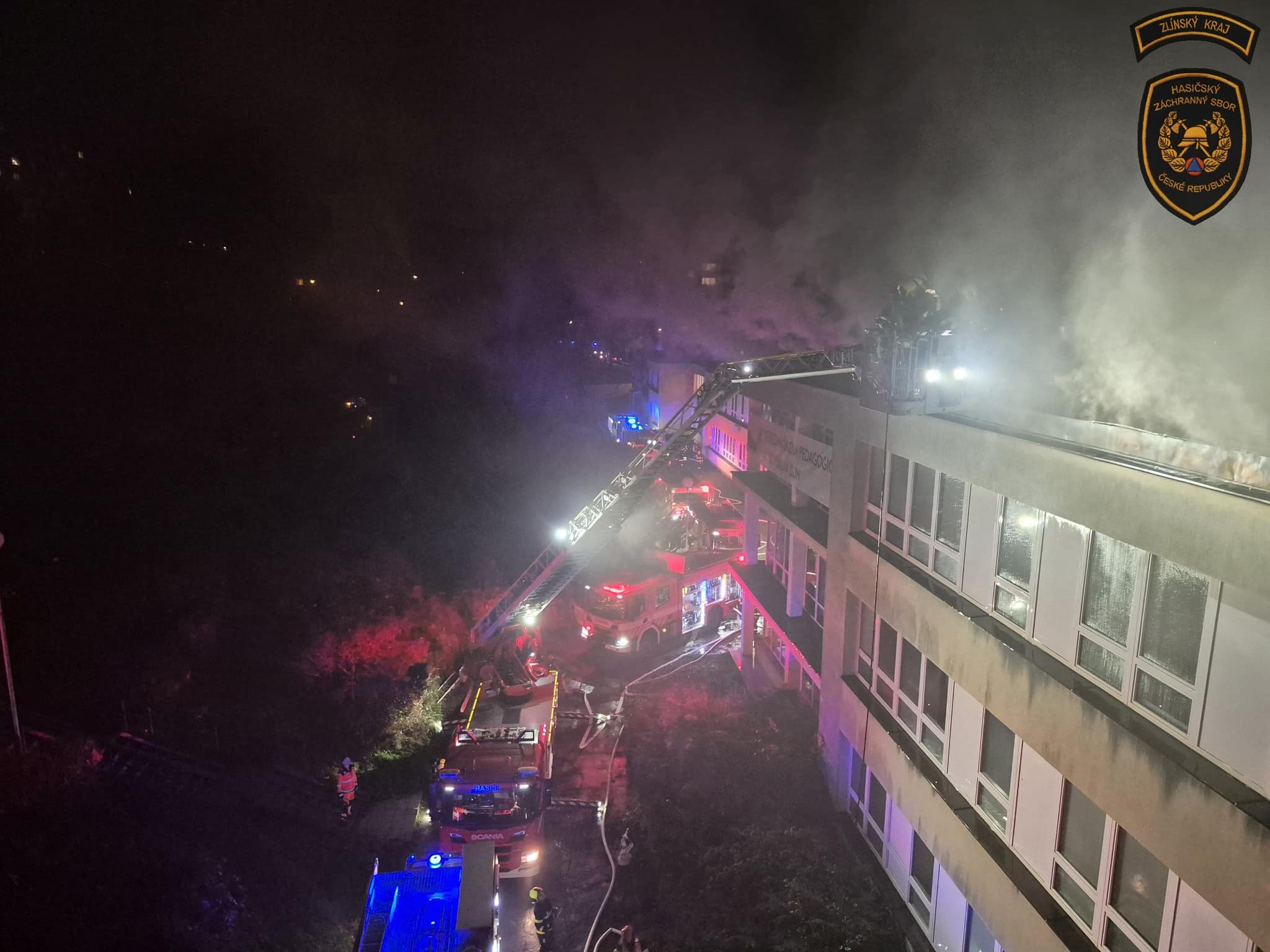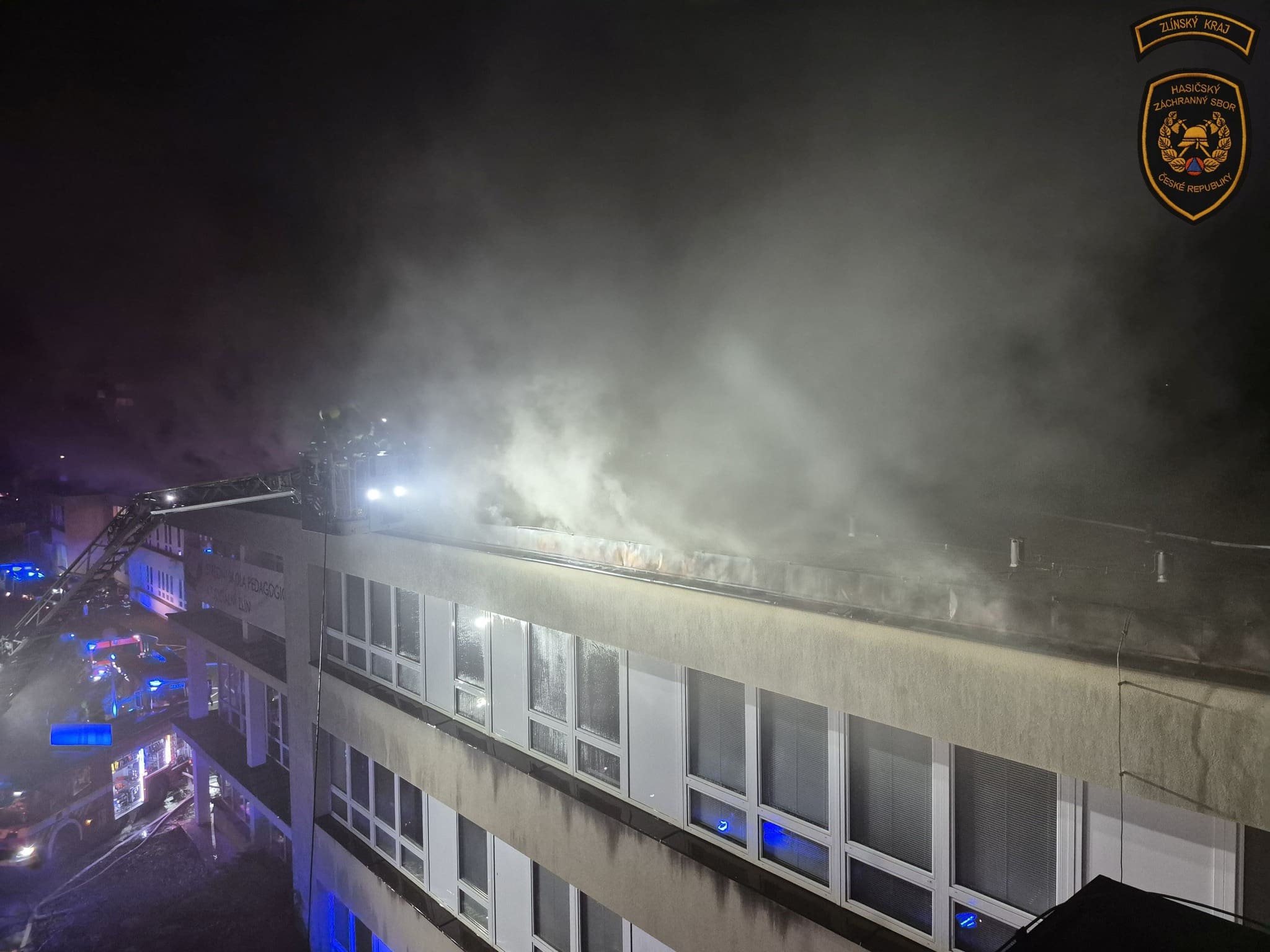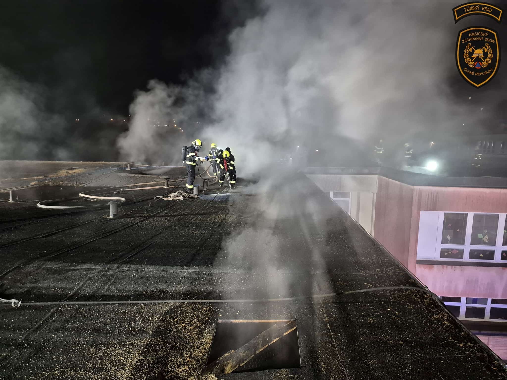 Požár střechy školy si vyžádal zásah třinácti jednotek. Hasiči pracovali až do noci