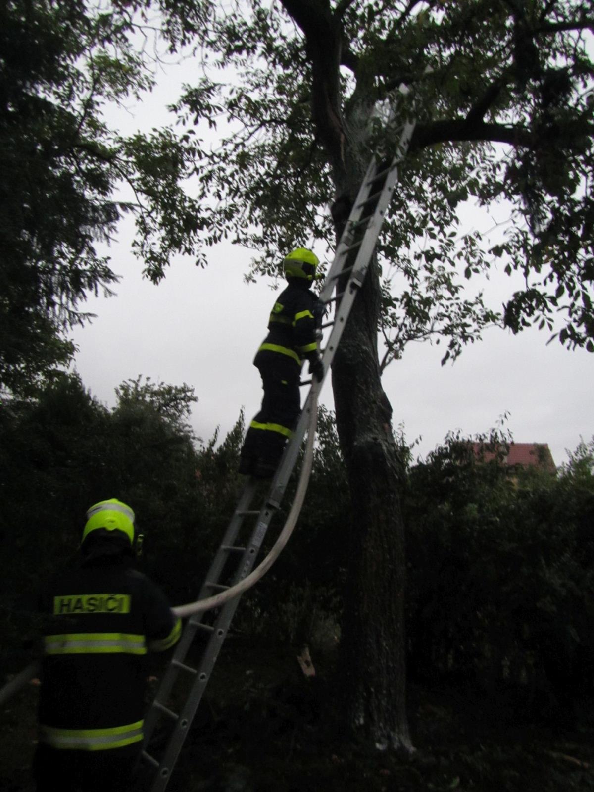 K hoření v koruně stromu došlo po úderu blesku. Hasiči ke stromu přistavili nastavovací žebřík a pomocí vysokotlakého proudu doutnající místa uhasili.