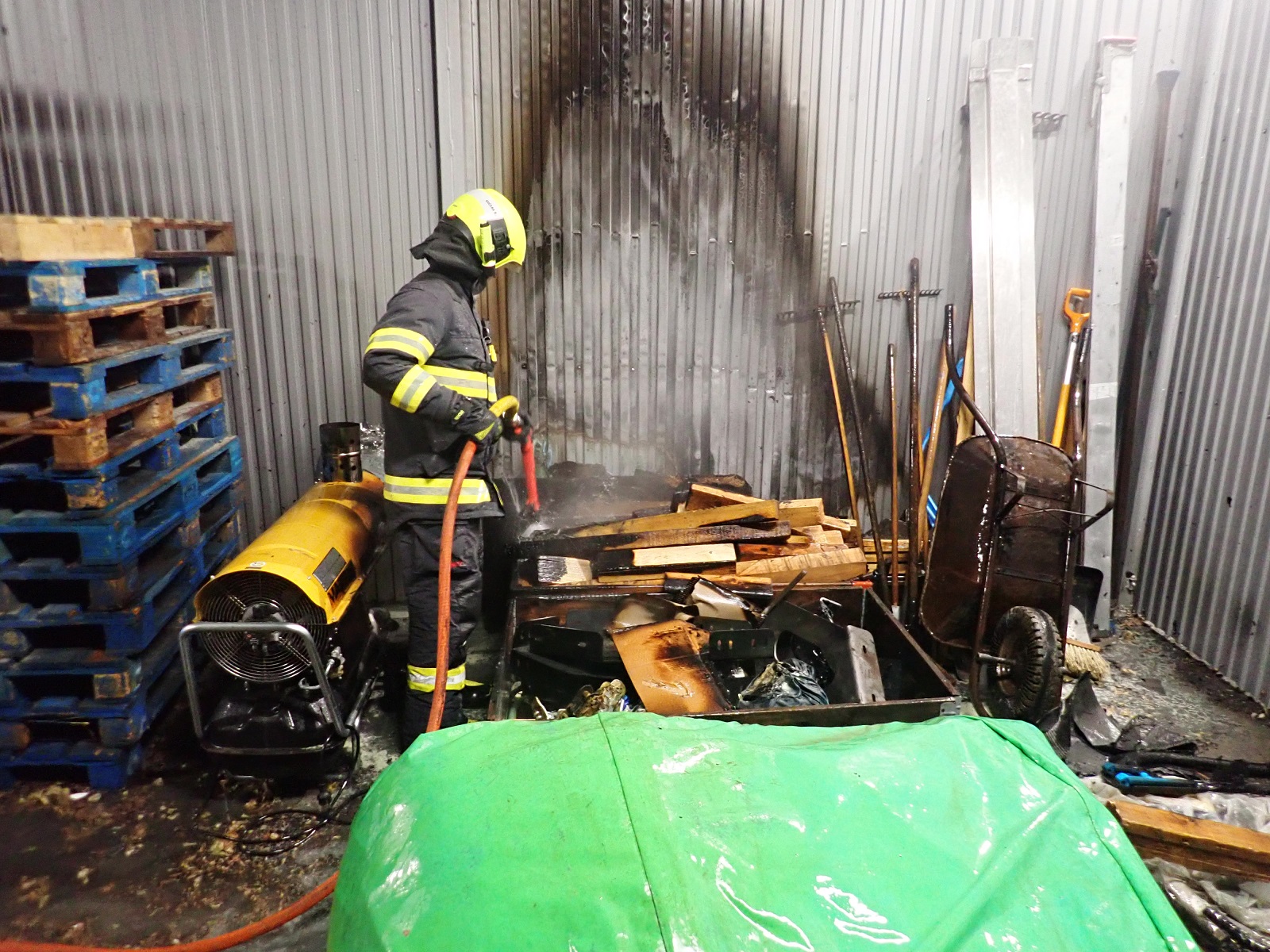 Průzkumem bylo zjištěno, že došlo k požáru ve dvou kontejnerech v blízkosti skladovací haly. Požár byl zčásti lokalizovaný před naším příjezdem. K lokalizaci byly použity dva práškové hasicí přístroje. Požár jsme dohasili s jedním vysokotlakým proudem vody. Následně byla provedena kontrola teplot obvodové stěny haly a provedena částečná demontáž vnitřního obložení haly.