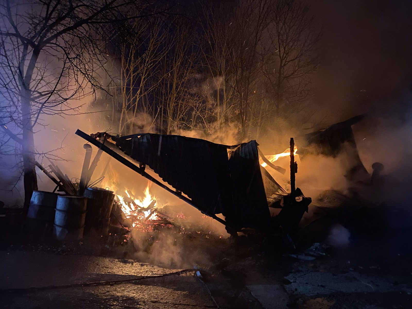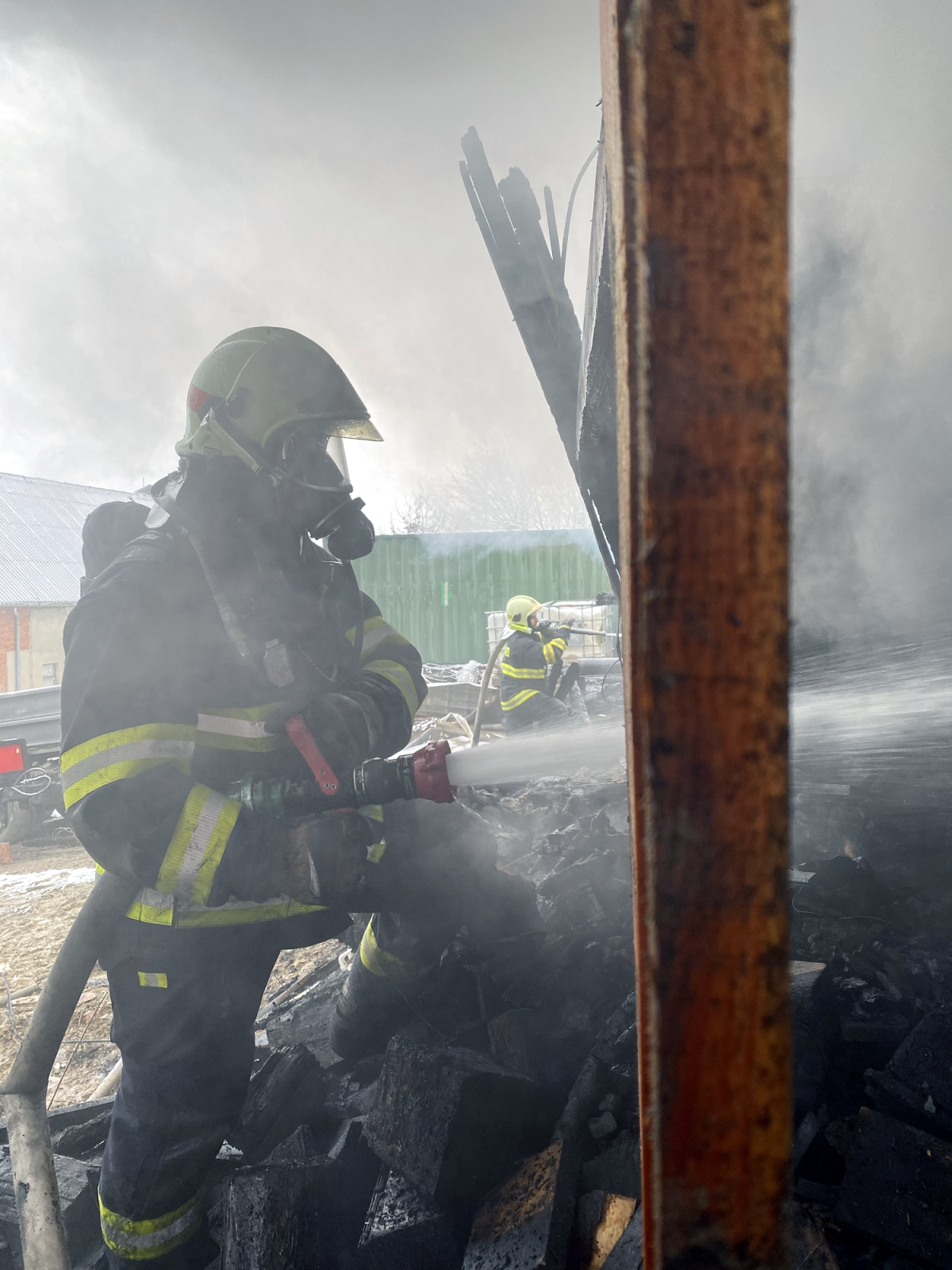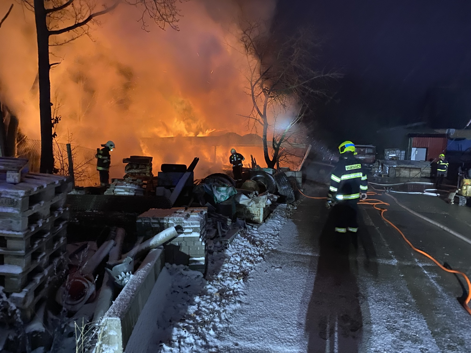 Jako první se na místo dostavili profesionální hasiči ze Slavičína, kteří potvrdili rozsáhlý požár dřevěné budovy a přístřešku. Celý objekt, využívaný jako šatny a zázemí firmy, byl kompletně v plamenech. Na pokyn velitele bylo proto okamžitě nataženo několik útočných proudů, a do půl hodiny se podařilo dostat požár pod kontrolu. Z důvodu absence požární vody byla zřízena její kyvadlová doprava až ze Slavičína.