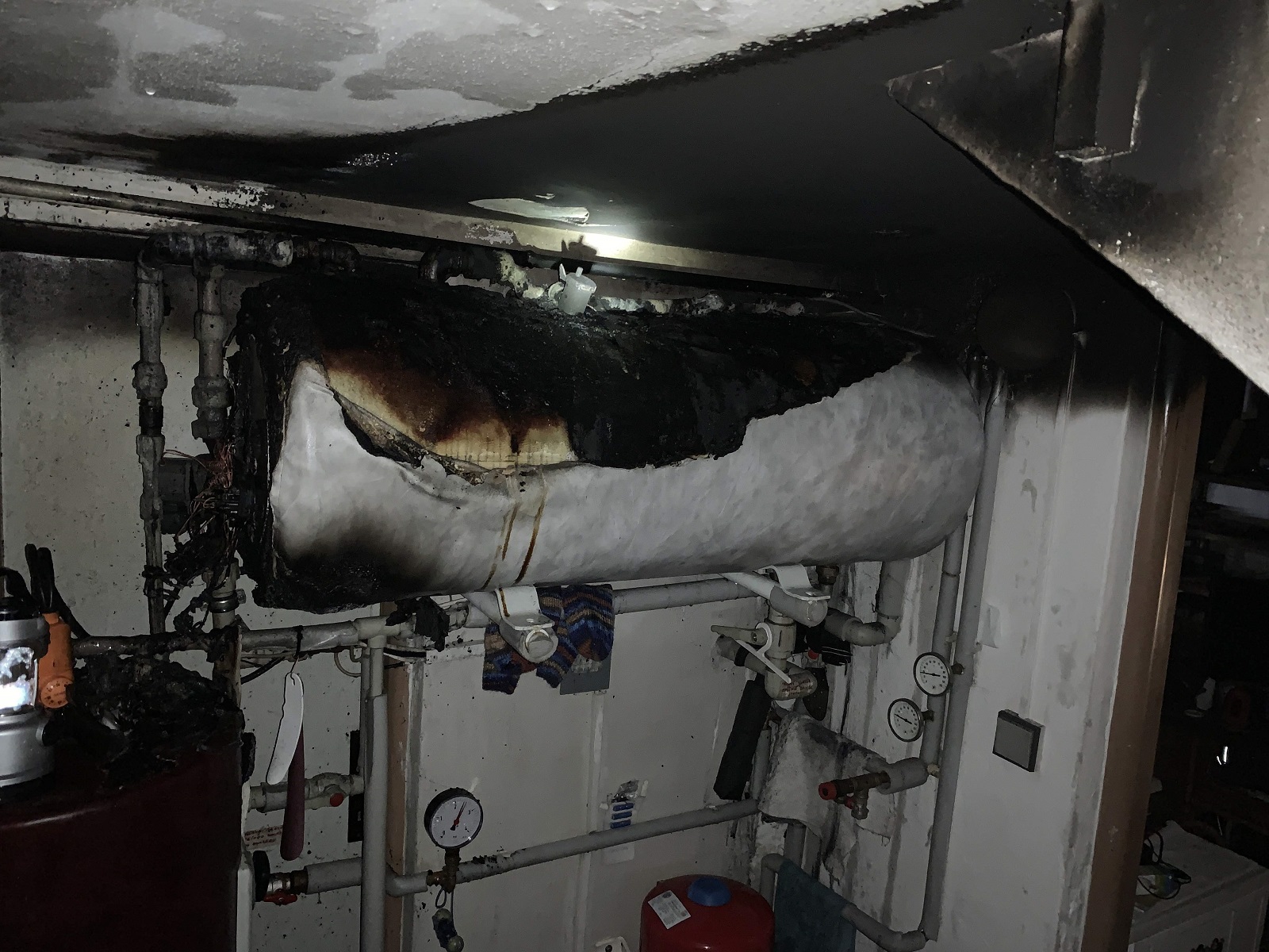 Hasiči v dýchacích přístrojích průzkumem zjistili, že hoří v místnosti s bojlerem. K uhašení plamenů použili jeden vysokotlaký proud...
