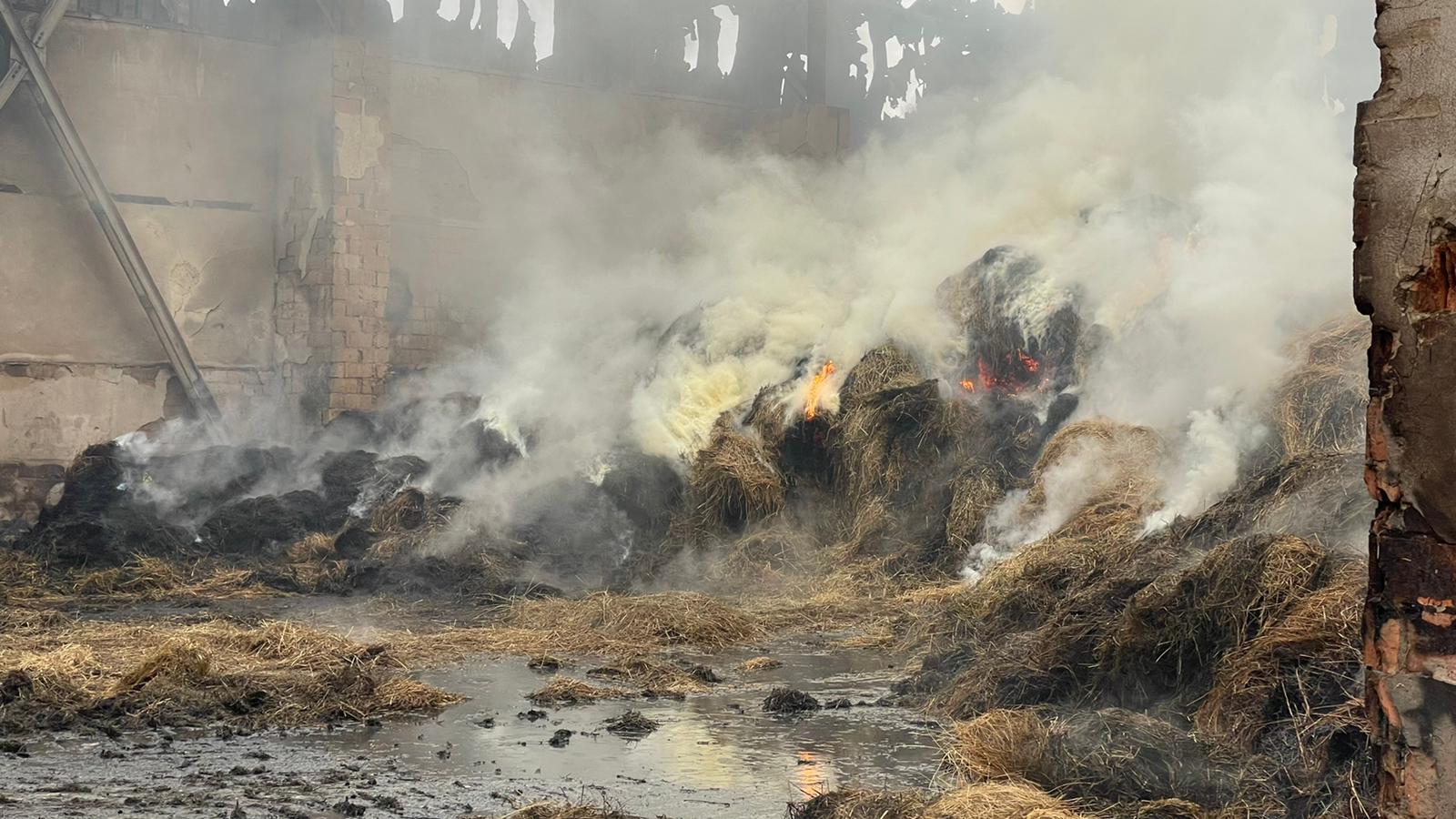 Uvnitř seníku tak začalo hořet 500 ks balíků slámy a stejný počet balíků sena. Rychle šířící se požár značně poškodil celý objekt. Velitel zásahu si proto na místo povolal statika, který zakázal vstup dovnitř, neboť hrozí zřícení budovy. Hasiči proto provádí hasební práce pouze z vnějšku, kdy ochlazují obvodový plášť budovy a hasí pomocí výškové techniky.