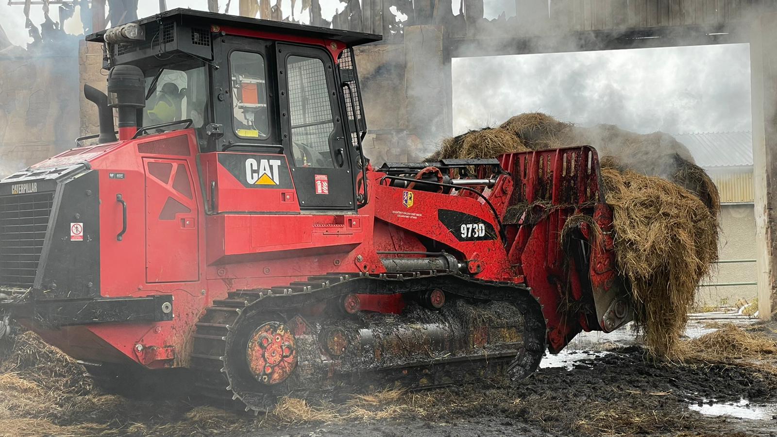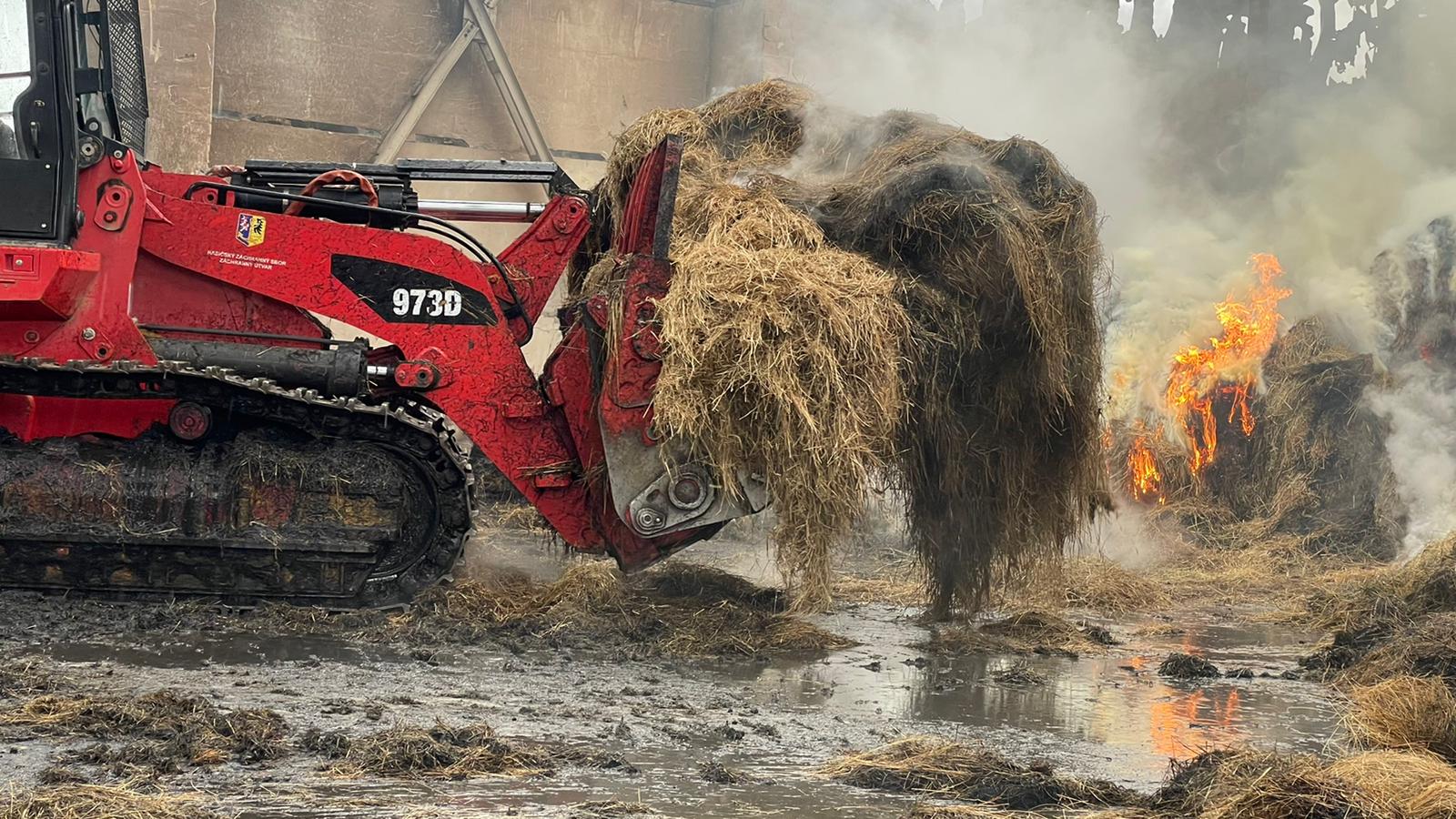 Dnes nám na pomoc přijeli kolegové ze Záchranného útvaru HZS ČR Hlučín. Ti s pomocí pásového bagru se zodolněnou konstrukcí vyvážejí z objektu hořící slámu a seno. Hasiči vyvezený materiál prolévají vodou a uskladňují do silážní jámy, kde vše dohašují. Kromě bagru do poškozené budovy nikdo nesmí. Stoj je možné ovládat i pomocí dálkového ovládání, díky čemuž lze hořící materiál vyvážet ven ze seníku bez ohrožení zasahujících hasičů.