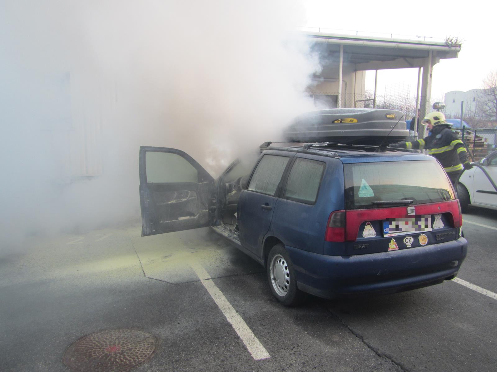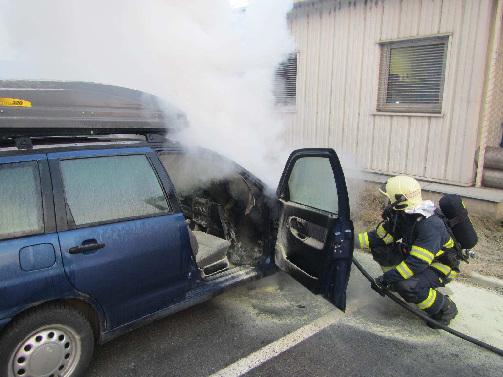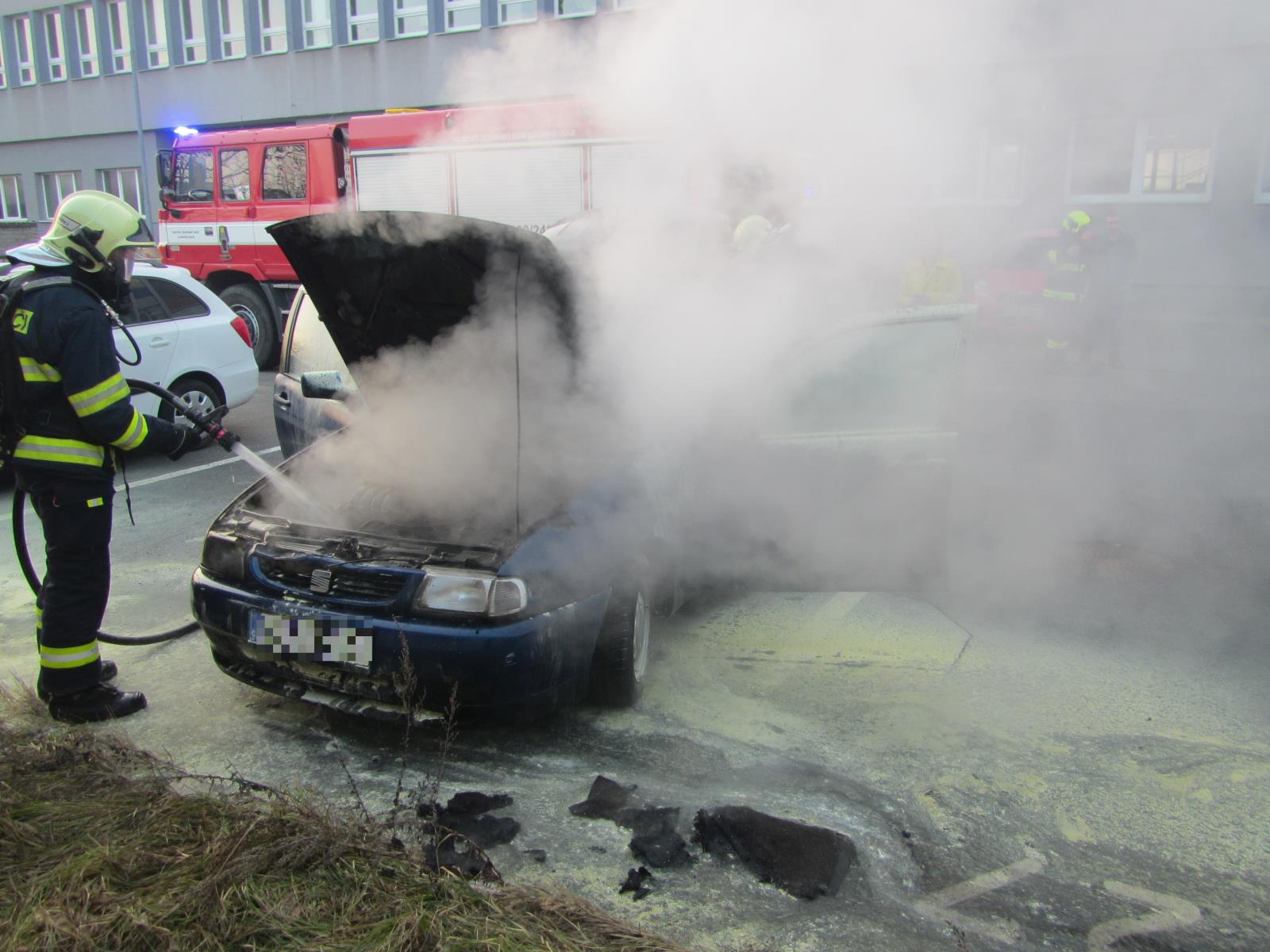 Po příjezdu na místo velitel zásahu průzkumem zjistil, že u osobního vozidla tovární značky Seat Cordoba došlo k požáru v motorovém prostoru, odkud se dál rozšířil do interiéru vozu. Před příjezdem hasičů se svědci snažili požár uhasit dvěma práškovými hasicími přístroji. Hasiči k lokalizaci požáru použili vysokotlaký proud a během chvíle měli požár pod kontrolou.  Pár minut před osmou hodinou již velitel zásahu vyhlásil likvidaci požáru. Nakonec hasiči vozidlo zkontrolovali termokamerou. Poté se vrátili zpět na svou stanici.