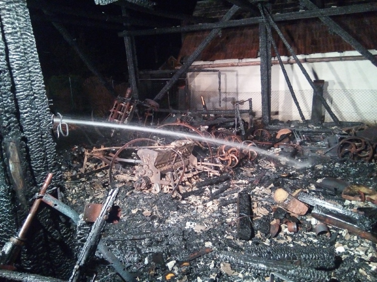 Hasební zásah byl prováděn v stížených podmínkách v dýchacích přístrojích. Hasiči rozebírali konstrukce a dohašovali skrytá ohniska. V objektu byla uskladněna muzejní zemědělská technika a dřevěné pódium. Všechny tyto věci museli hasiči z hořícího objektu vynést.