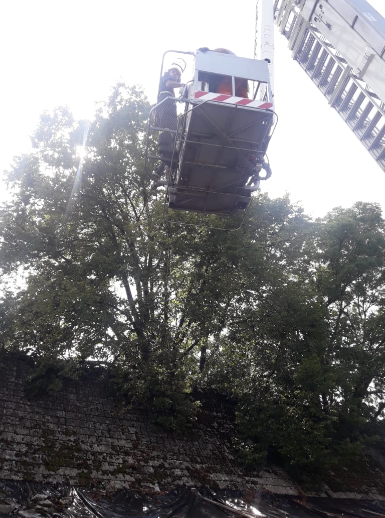 Celý zásah komplikuje velikost a košatost stromu. Práce s motorovou pilou z koše plošiny je velmi fyzicky náročná, proto se na místě přítomní hasiči při řezání střídají.