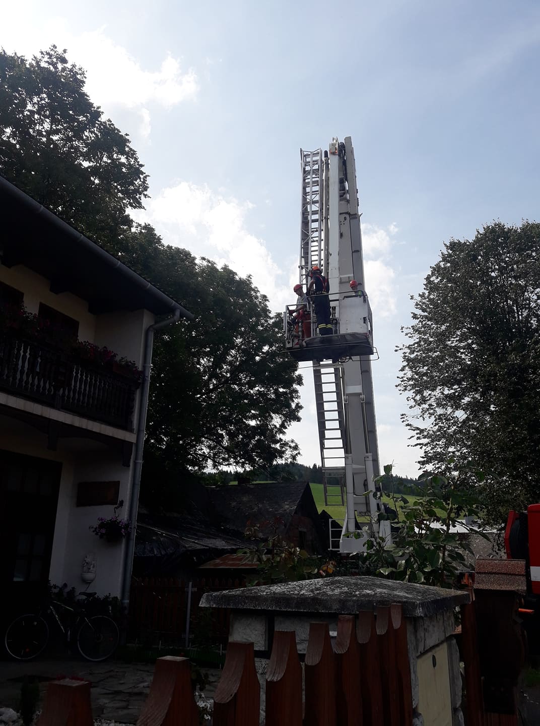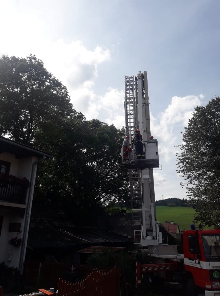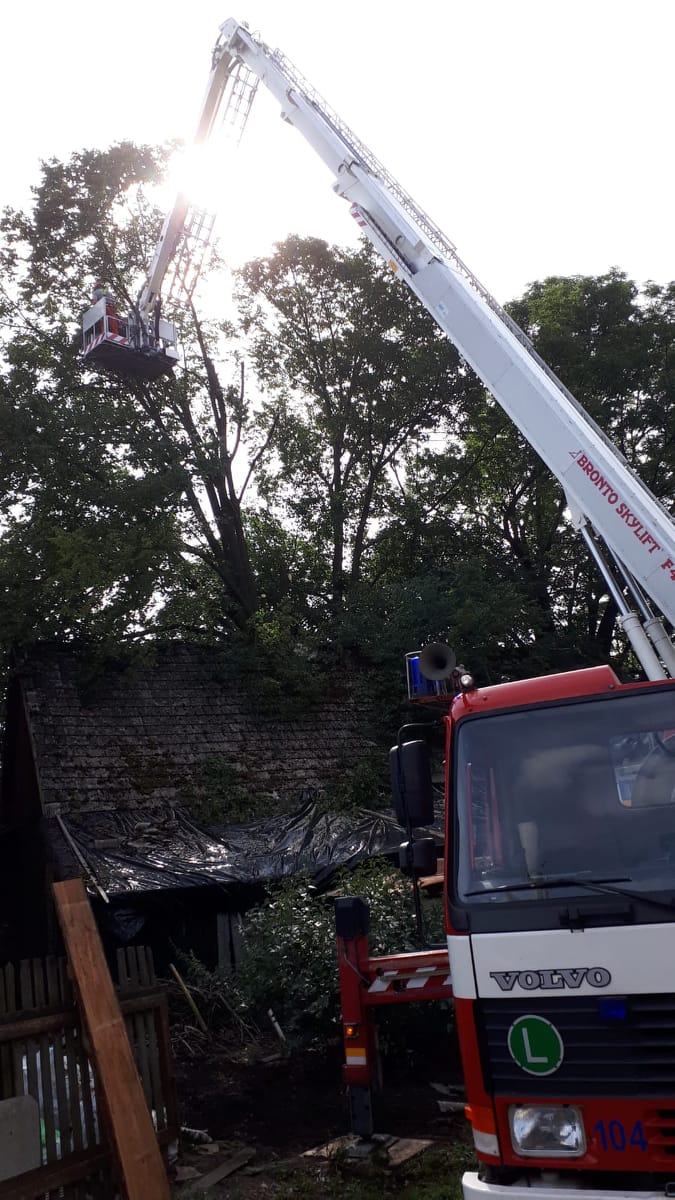 Po příjezdu na místo hasiči zjistili, že je v místě špatná dostupnost k odstranění prasklého stromu. Velitel zásahu si tak na pomoc vyžádal hasiče lezce ze stanice Zlín, kteří provedli provizorní zajištění stromu proti jeho pádu na stodolu a tím i větší bezpečnost pro zasahující hasiče při likvidaci stromu. Následně byla ze Zlína povolána i automobilová plošina s dosahem 42 metrů. S pomocí plošiny hasiči postupně strom ořezávají.