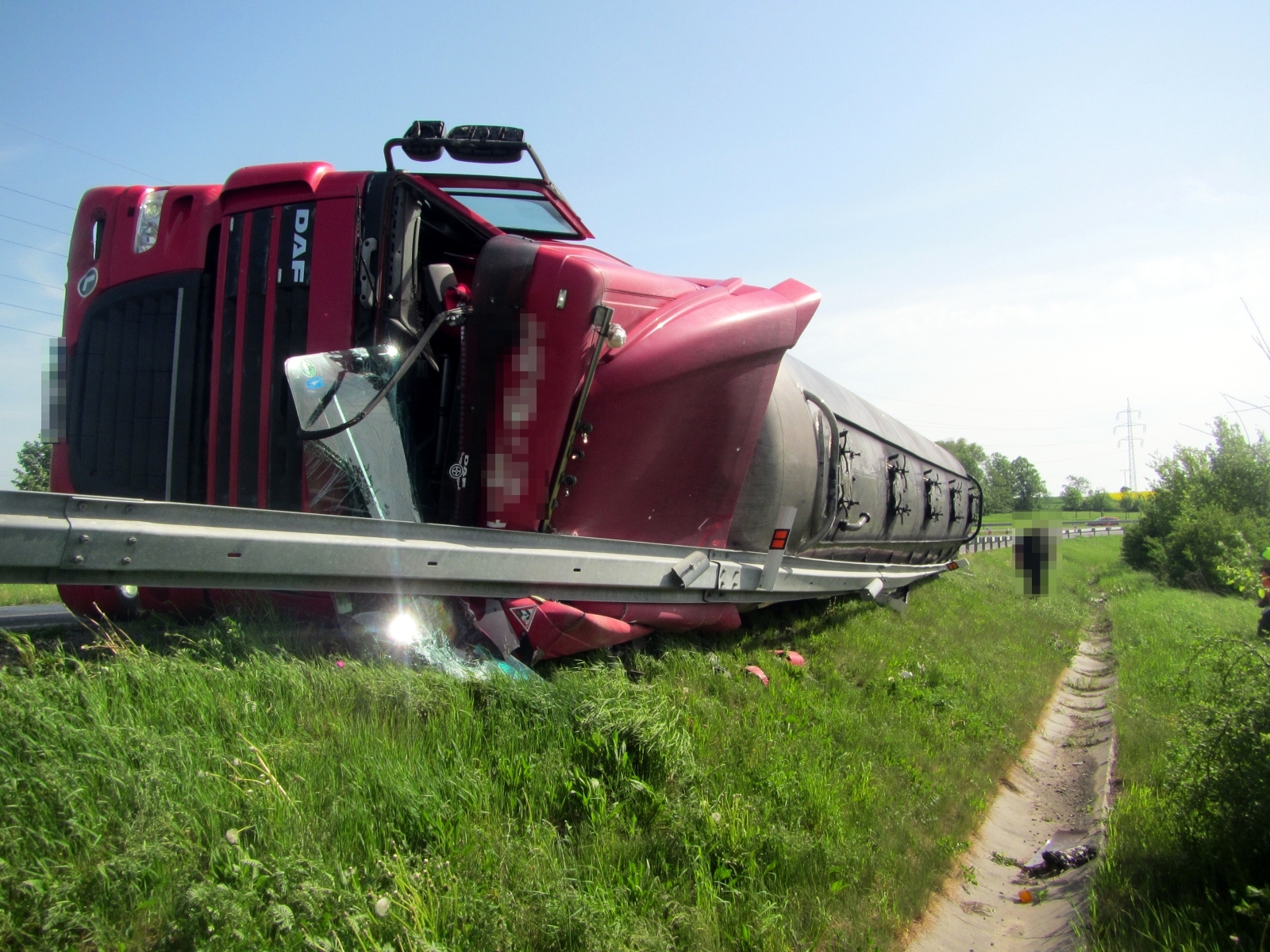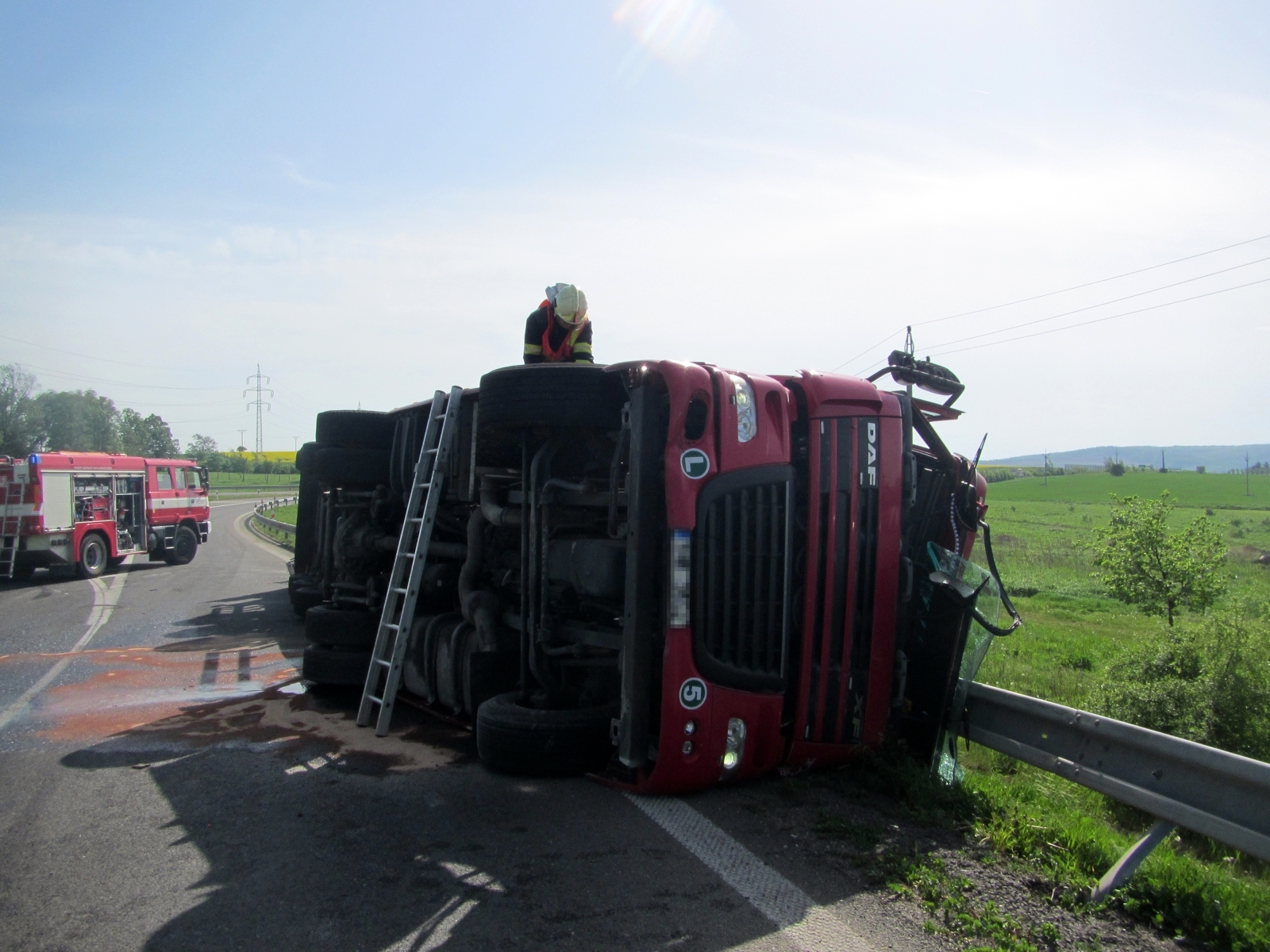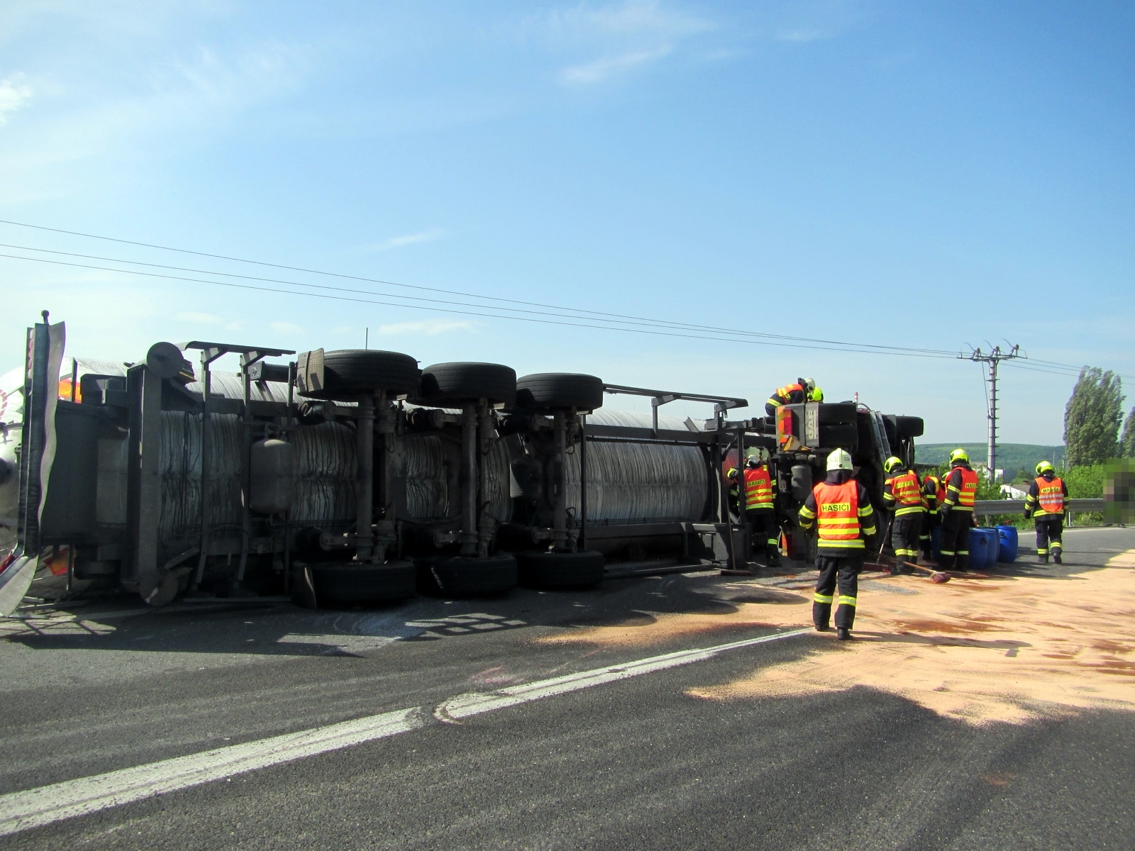 Z místa bylo velitelem potvrzeno, že došlo k převrácení cisterny převážející saze. Řidič se nacházel mimo vozidlo a na místě ho prohlédla posádka zdravotnické záchranné služby. K úniku převáženého nákladu nedošlo, při nehodě však byly poškozeny nádrže na provozní kapaliny. Jednotky proto okamžitě zajistily vůz proti nebezpečí vzniku požáru a unikající provozní náplně byly zachyceny a přečerpány do náhradních nádob. Kvůli úniku na komunikaci a do přilehlé kanalizace byl na místo povolán také zástupce odboru životního prostředí z Otrokovic a odborník ze Správy a údržby silnic.