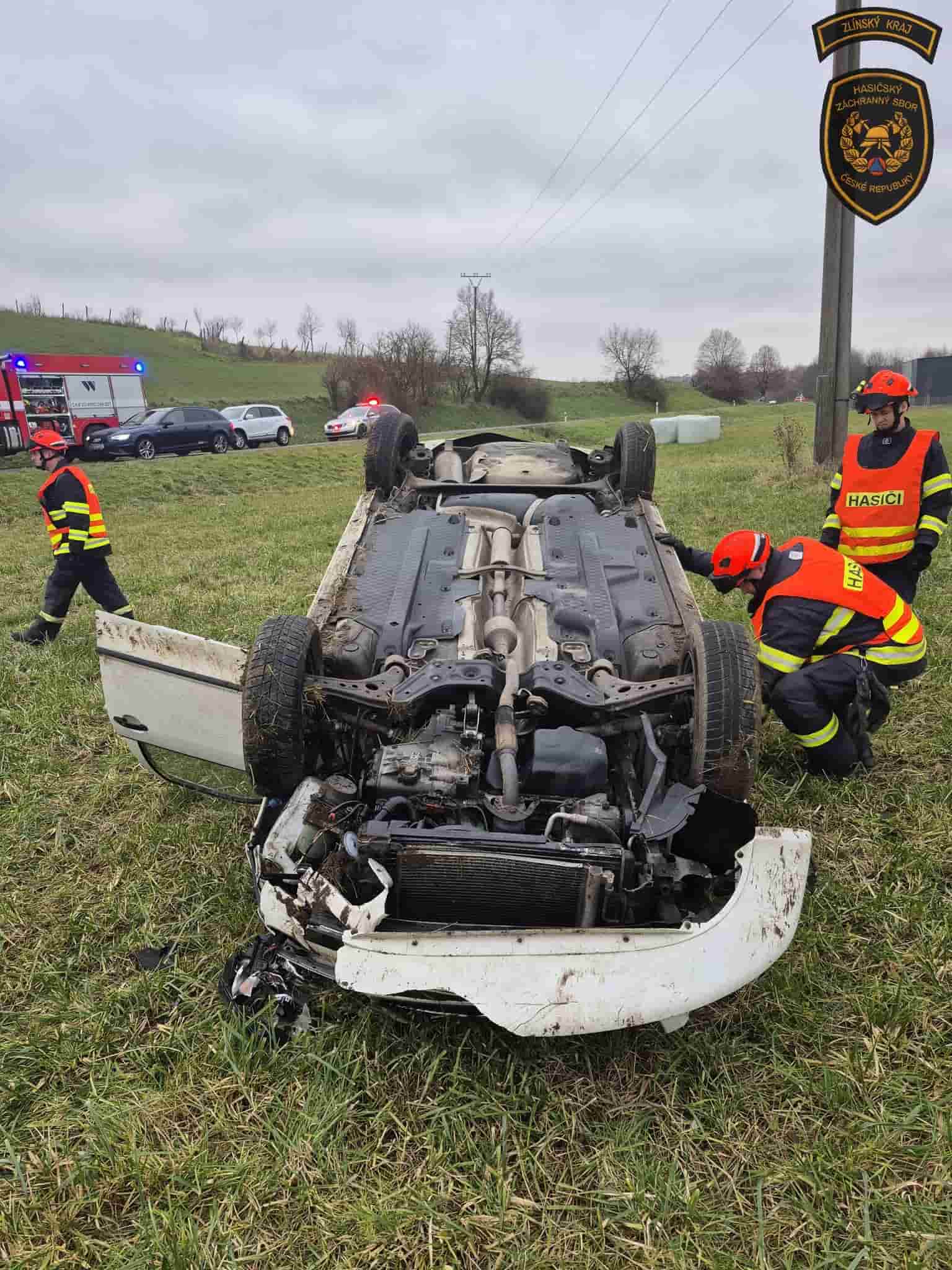 Převrácené auto způsobilo zranění. Zásah hasičů zabránil dalšímu riziku