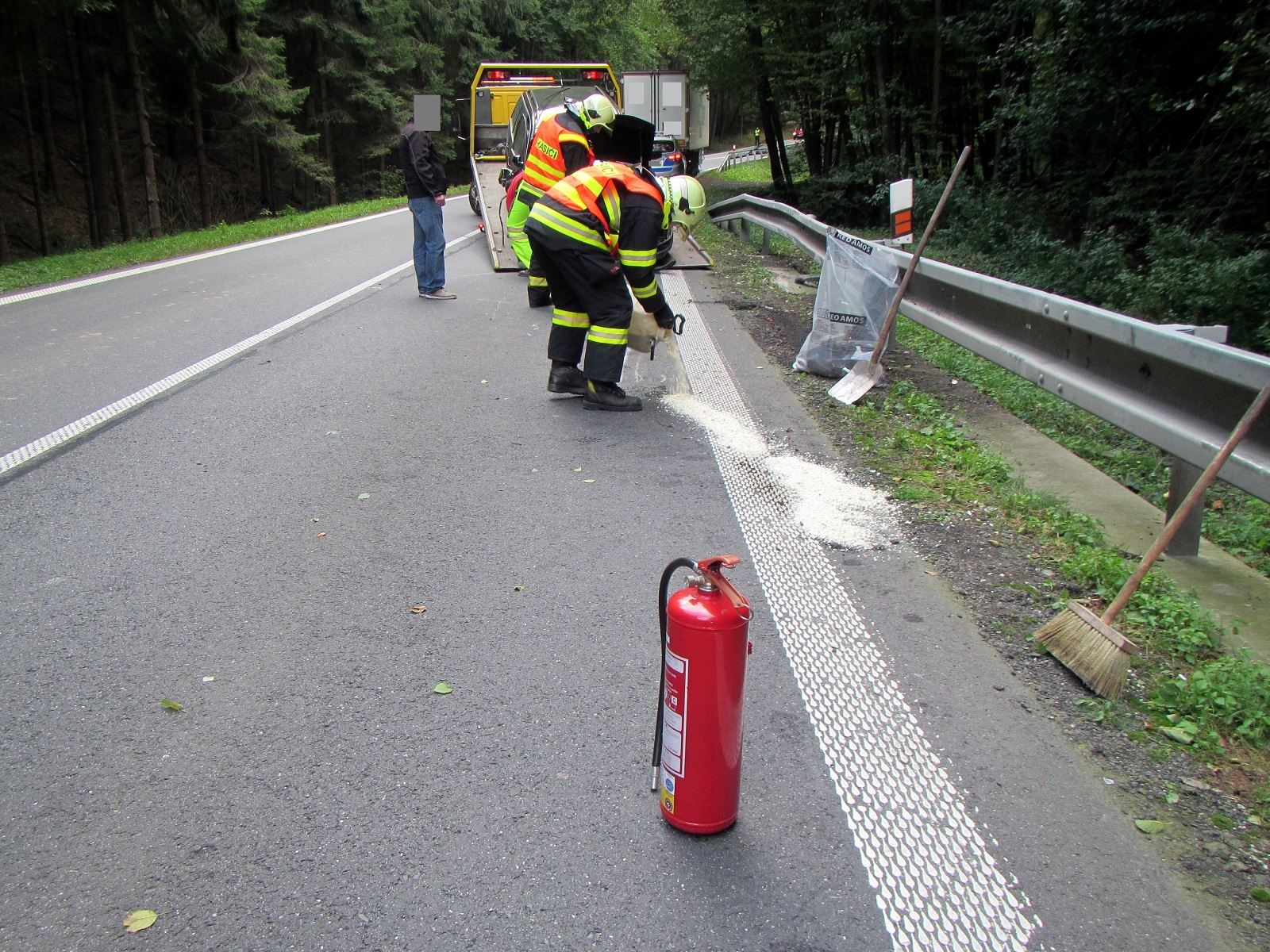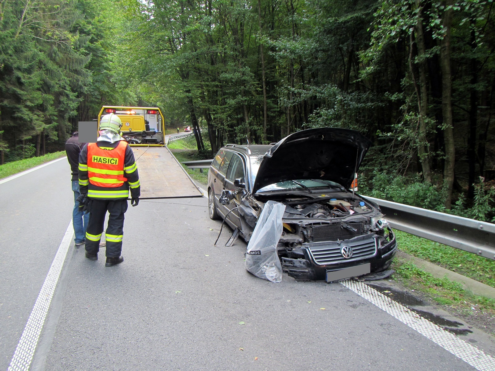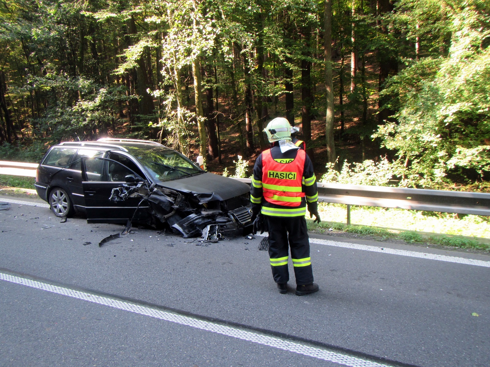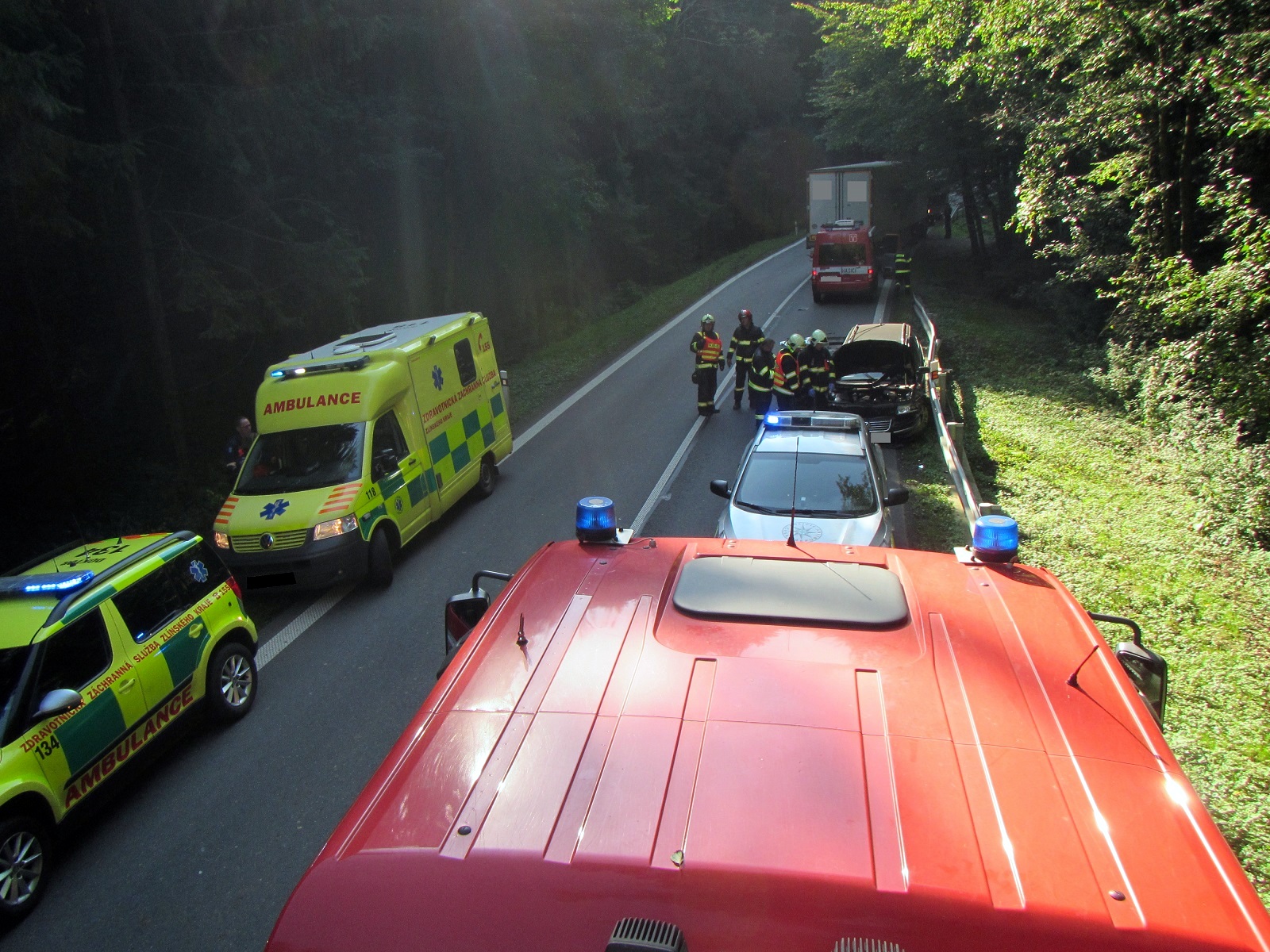 Ihned po příjezdu byla na operační středisko potvrzena havárie osobního a nákladního automobilu. Ve voze Volkswagen Passat došlo ke zranění jedné dospělé osoby a jednoho dítěte, ale oba se již nacházeli mimo vozidlo v péči zdravotníka, který jel náhodou kolem. Po příjezdu posádky zdravotnické záchranné služby byli předáni do jejich péče a odvezeni do nemocnice. Řidič nákladního vozu zraněn nebyl.