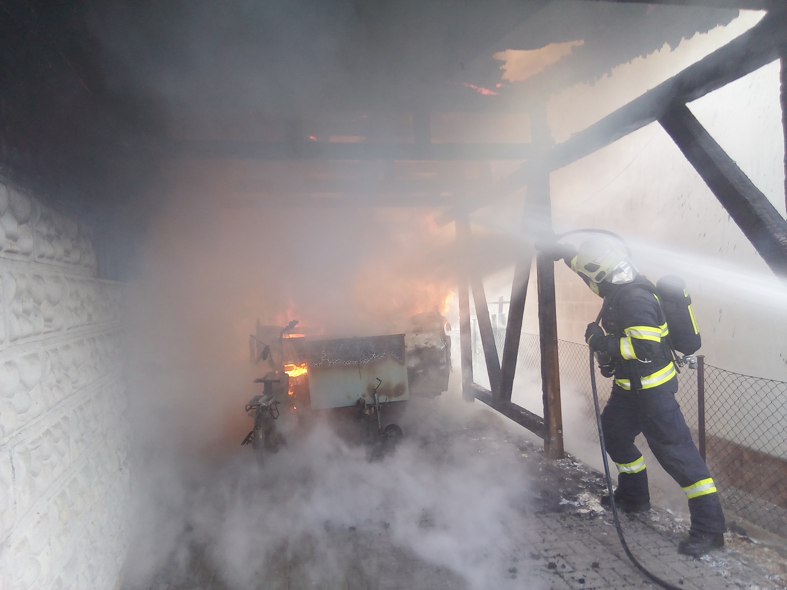 Tři jednotky hasičů zasahovaly dnes dopoledne u požáru karavanu pod přístřeškem u rodinného domu ve Valašských Kloboucích v okresu Zlín.