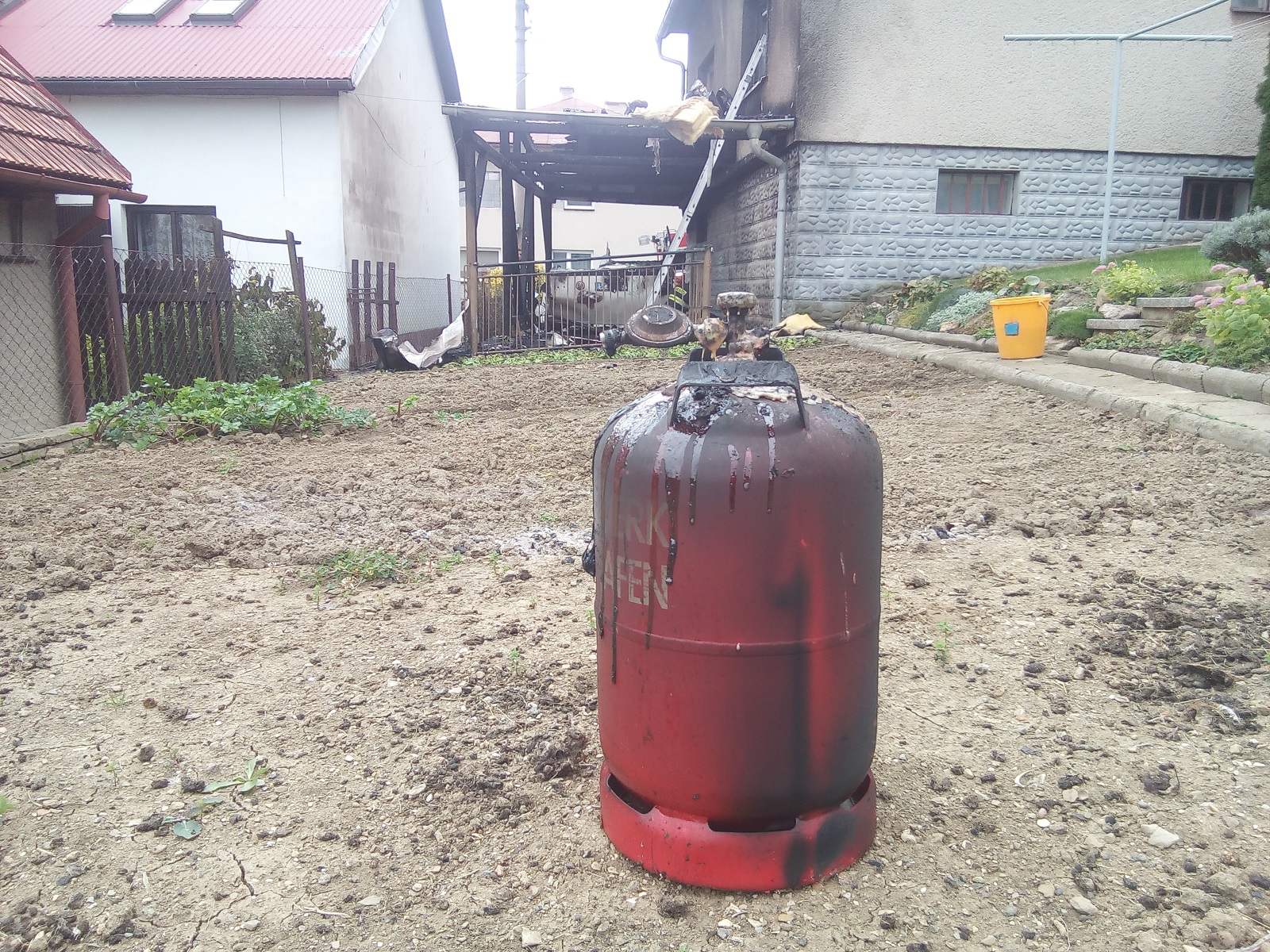 Hasiči po příjezdu k požáru zjistili, že hoří karavan s dřevěným přístřeškem u rodinného domu. Před rodinným domem byl popálený muž. U něj byla jeho žena. Obě osoby byly předány do péče Zdravotnické záchranné služby Zlínského kraje. Popálený muž byl později transportován vrtulníkem do nemocnice. V rodinném domě už nebyly další osoby. Hasiči v dýchacích přístrojích požár uhasili dvěma vysokotlakými proudy vody. Požár se z přístřešku přenesl na okno do ložnice, které je nad přístřeškem. V ložnici hasiči prováděli odvětrání přetlakovým ventilátorem. Ve vzdálenosti asi 2 metry od přístřešku stojí sousední rodinný dům. Ten hasiči ochlazovali vodou, aby se plameny nepřenesly na jeho střechu. S termokamerou hasiči provedli kontrolu teploty stavebních konstrukcí obou domů. Museli odstranit z střešního pláště obou domů pás střešních tašek a podbití ochlazovali. V karavanu byla nalezena 10 kilogramová tlaková láhev na propan-butan, kterou hasiči vynesli na volnou plochu a následně ji ochlazovali vodou.