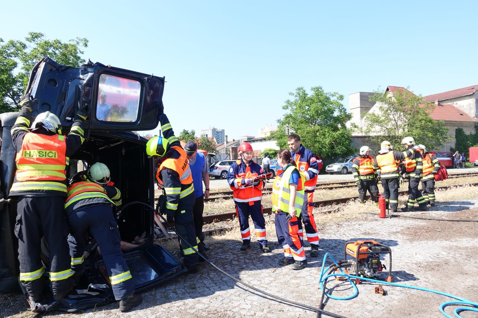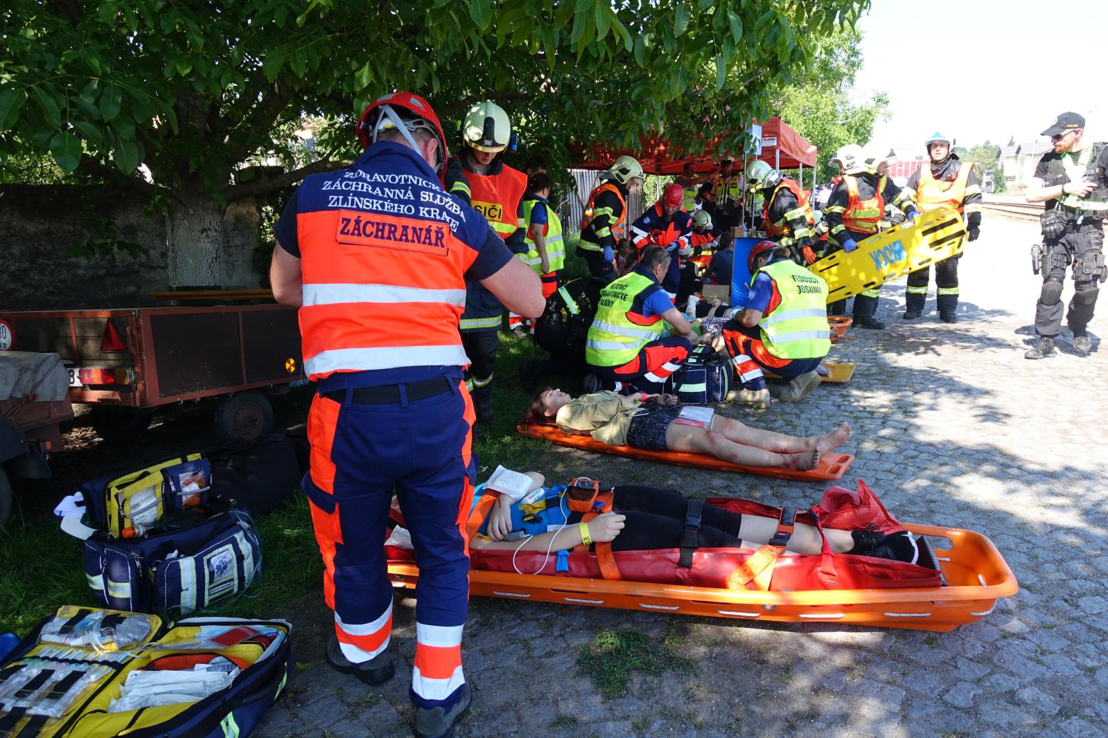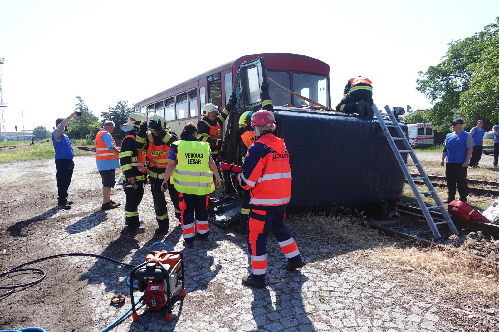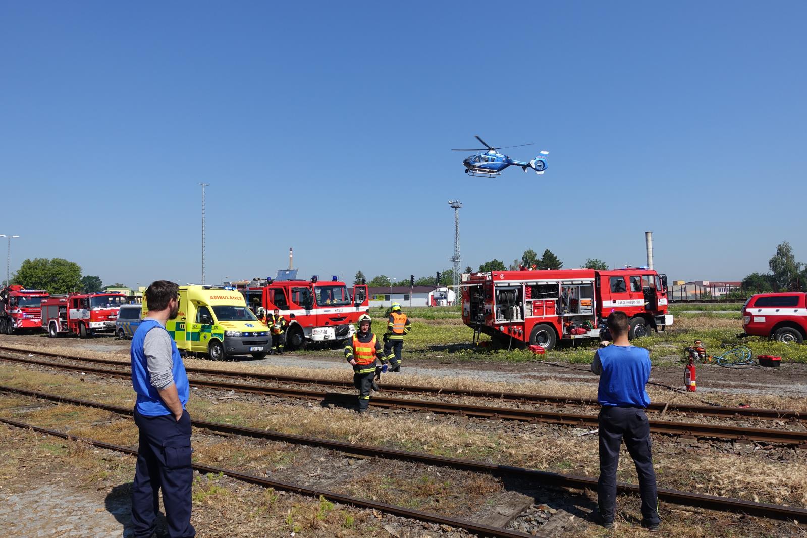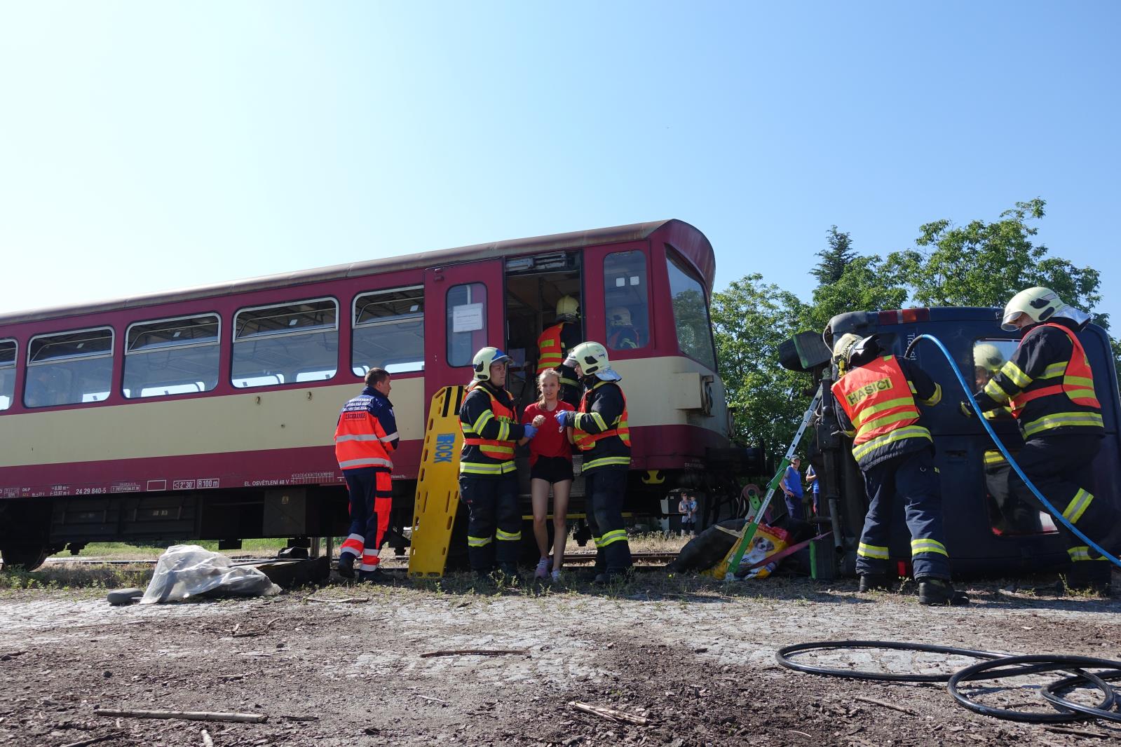 (5.6.2019) Vážně vypadající dopravní nehoda osobního vlaku a dodávky byla v tomto případě jen simulovaná událost v rámci taktického cvičení složek integrovaného záchranného systému, které se sjely na vlakovém nádraží v Kroměříži.