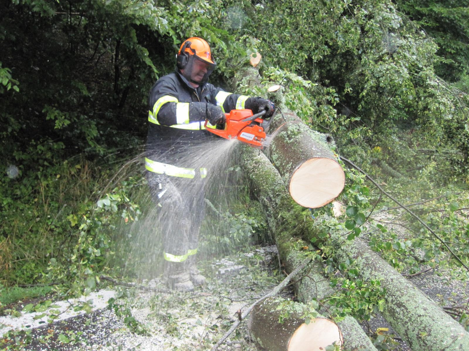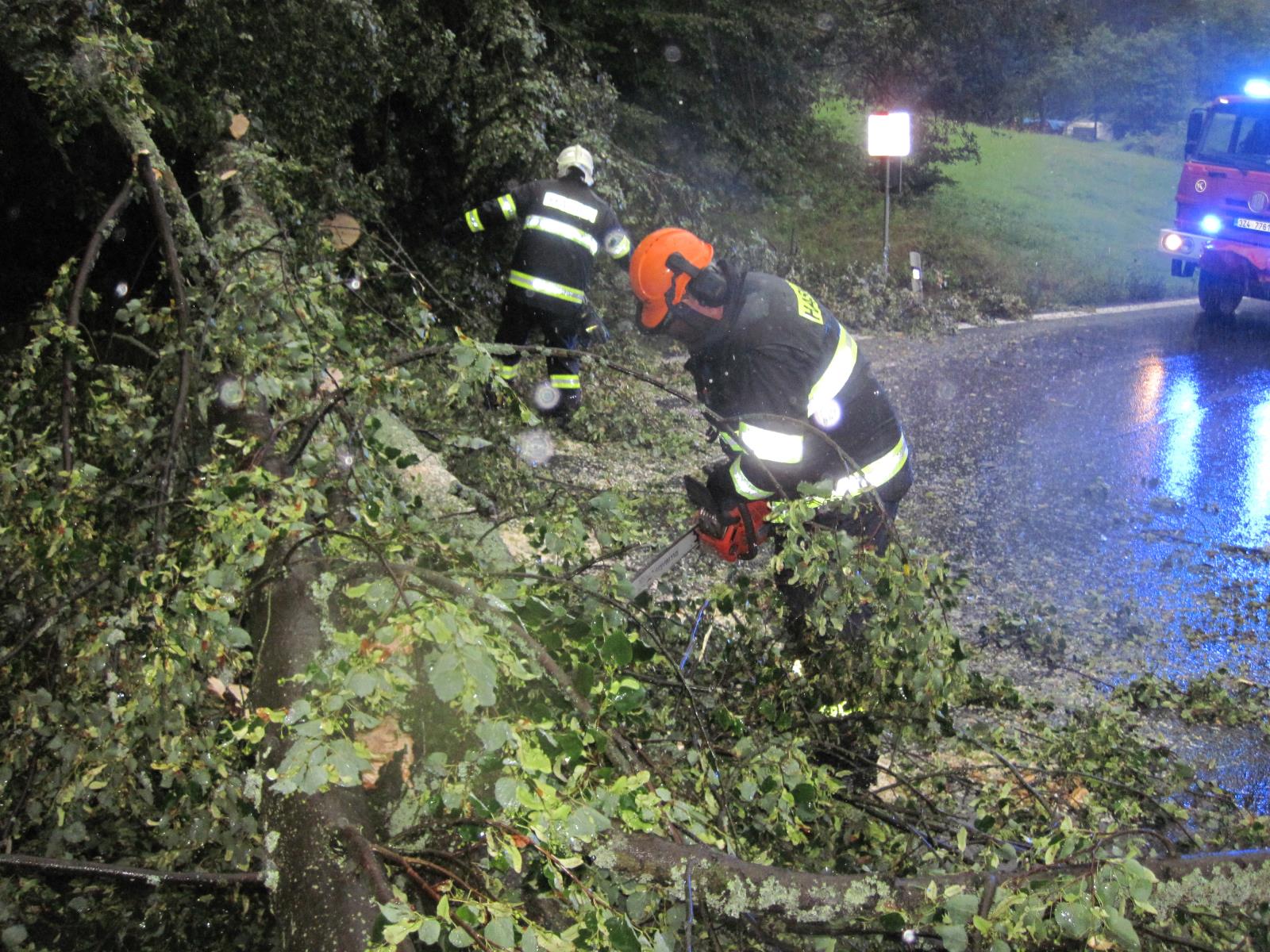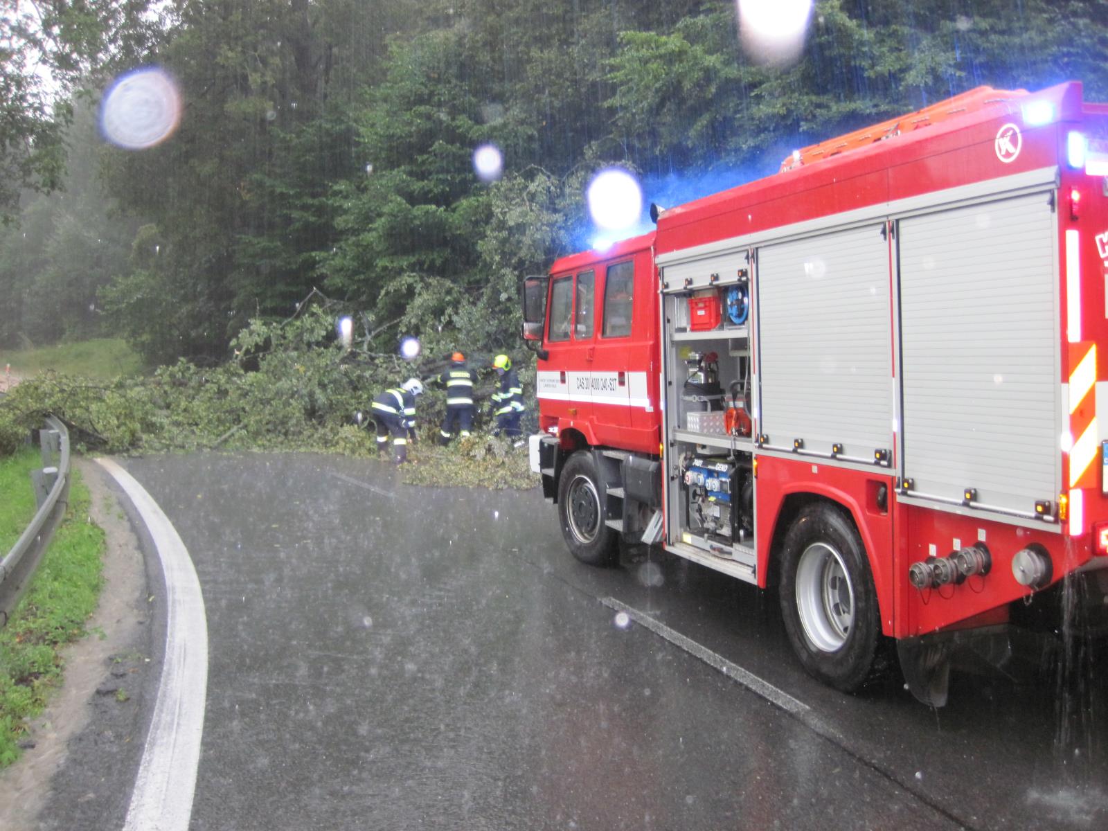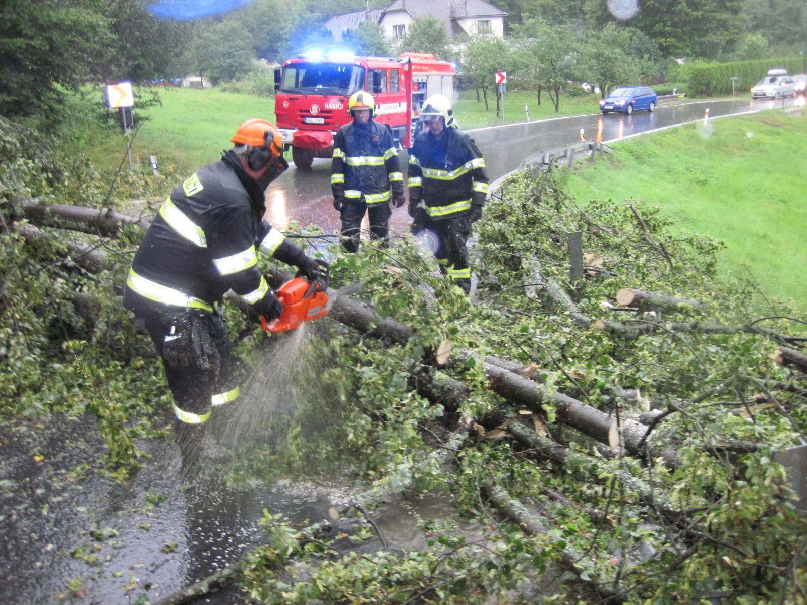 technika.jpgPo příjezdu na místo hasiči zjistili, že přes cestu jsou spadlé tři vzrostlé stromy, které obousměrně plně zablokovaly průjezd. Hasiči ihned s pomocí pil stromy rozřezali a odklidili mimo komunikaci. Celý zásah však velmi komplikoval a ztěžoval silný přívalový déšť.
