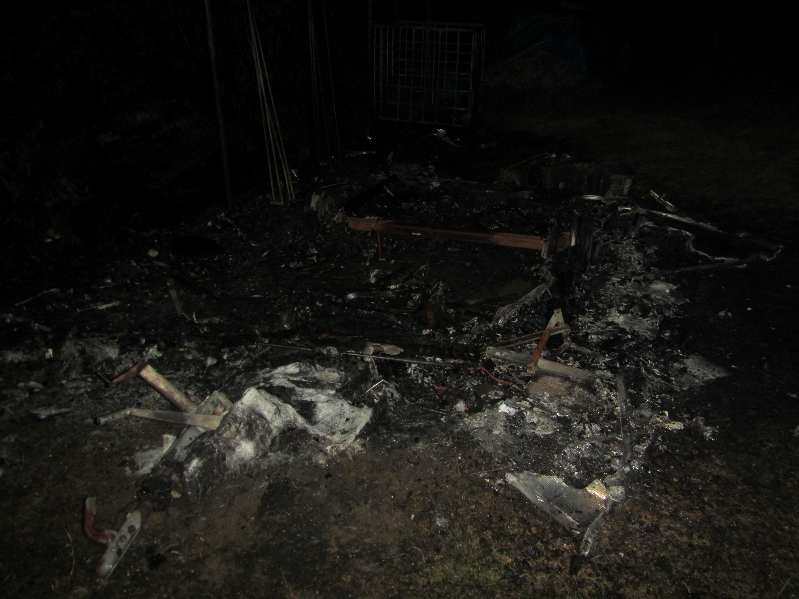 Požár byl uhašen jedním vodním proudem vody. Po uhašení byly v požářišti nalezeny dvě malé tlakové láhve o objemu 2 kilogramy a také zbytek podvozku od karavanu.