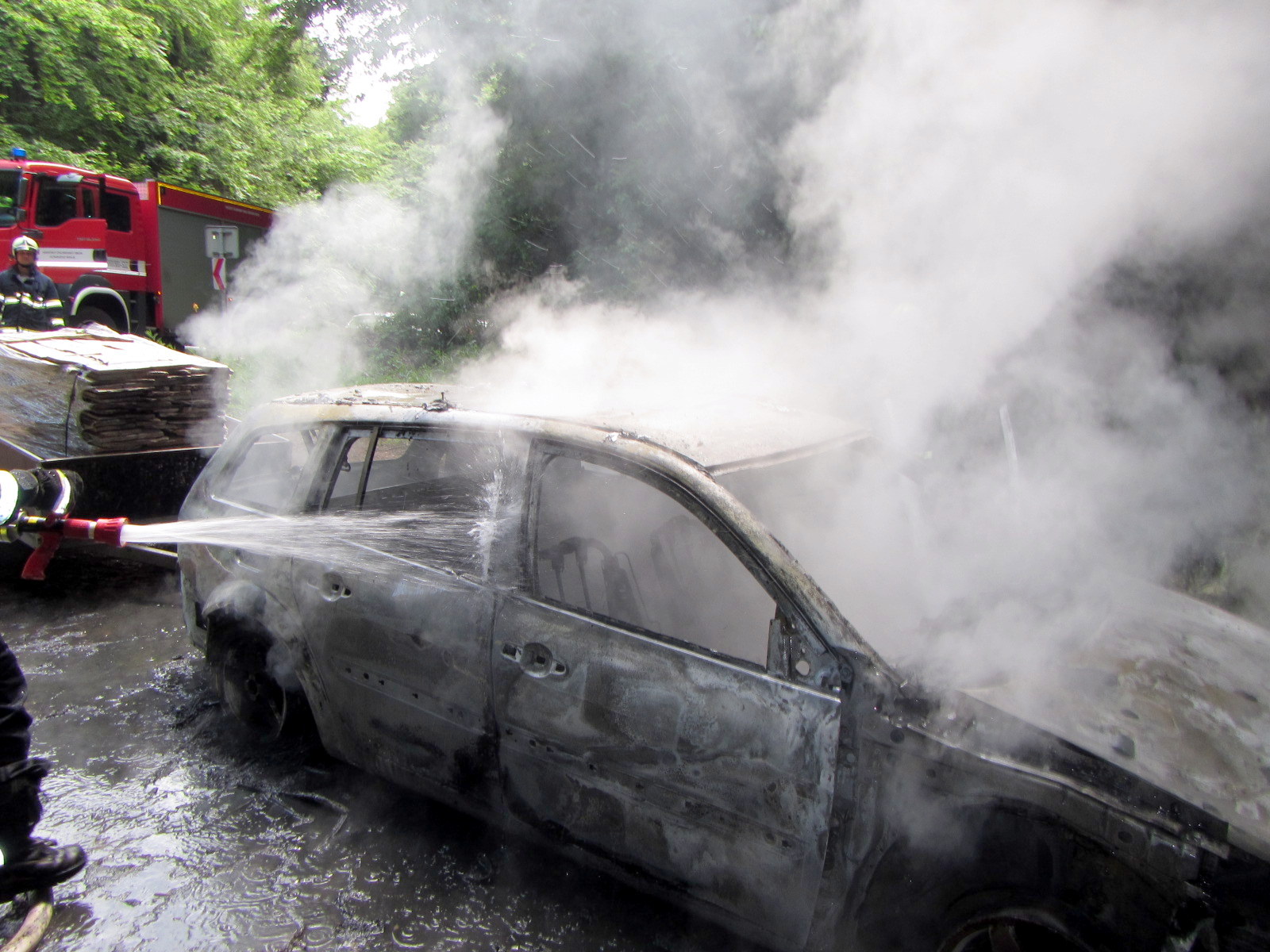 Před příjezdem hasičů se o uhašení požáru snažili občané pomocí ručních hasicích přístrojů, avšak neúspěšně. V době příjezdu první jednotky místních dobrovolných hasičů byl automobil kompletně v plamenech. Postupně byly nataženy dva útočné proudy C a požár byl během několika minut zlikvidován. Díky rychlému zásahu se podařilo zabránit rozšíření na přívěsný vozík.