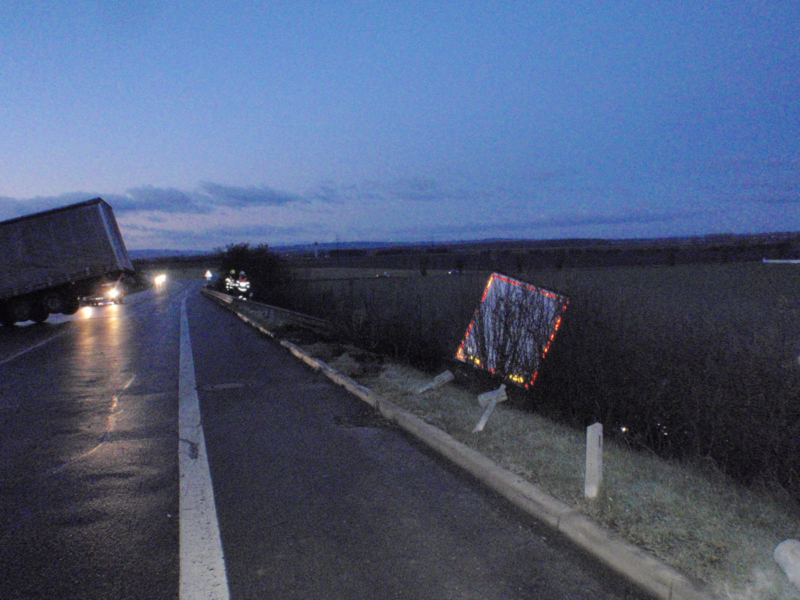 Hasiči průzkumem zjistili, že na silniční komunikaci na nadjezdu je náledí. V prostoru mezi nadjezdem a křižovatkou ve směru na obec Žalkovice, byly mimo silniční komunikaci dva nákladní automobily. Řidiči nebyli zraněni. Jeden nákladní automobil měl utrženou palivovou nádrž o velikosti 550 listrů nafty. Druhý blokoval návěsem jeden jízdní pruh. Z poškozené nádrže nafta vytékala do půdy a do vodoteče. Hasiči vodoteč přehradili a uniklou naftu zasypali sypkou sorbční látkou. Dále provedli protipožární opatření.