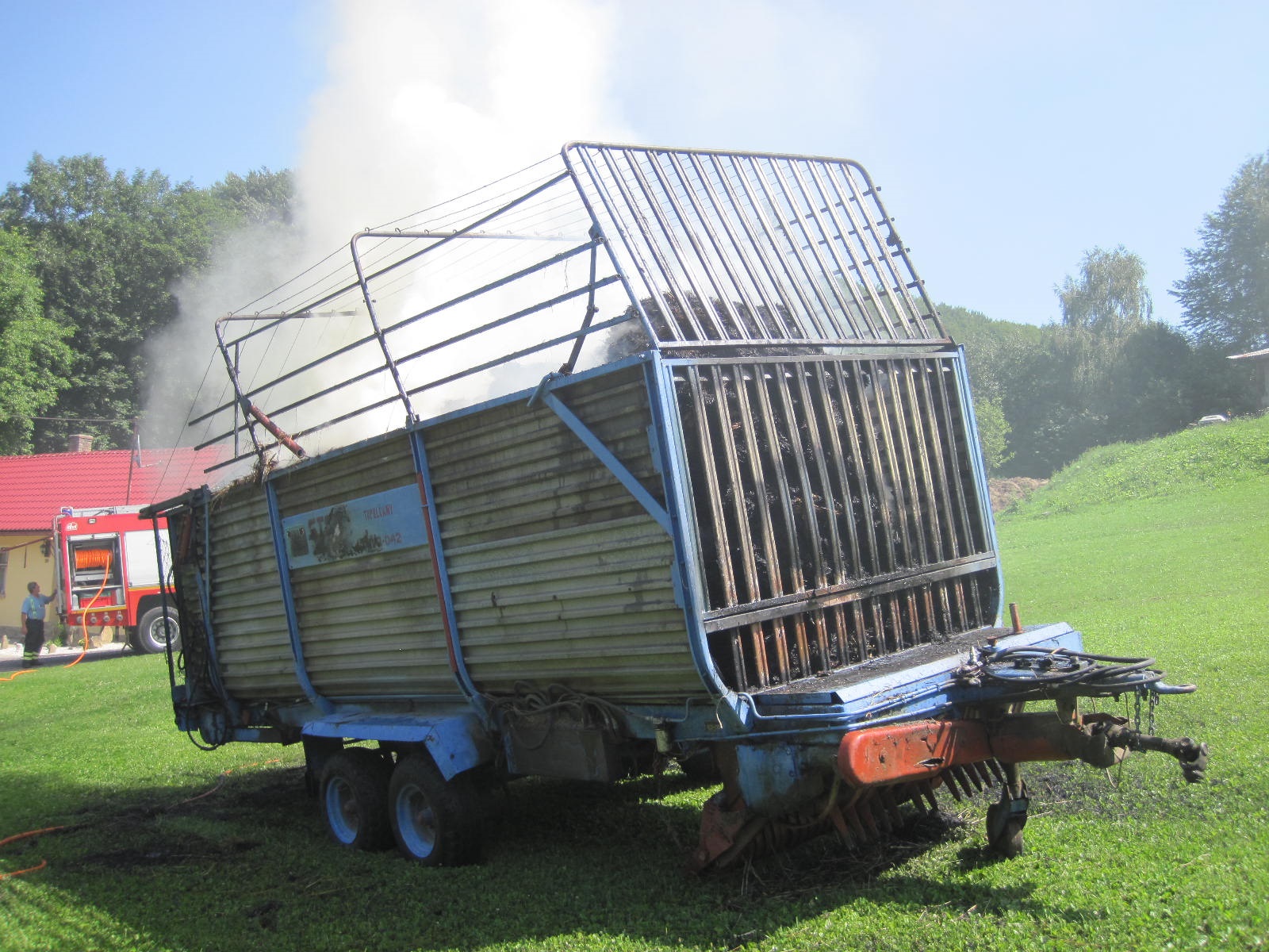 Na místě požáru sběracího vozu sena byli jako první dobrovolní hasiči. Ti požár dostali pod kontrolu s dvěma vysokotlakými proudy vody. Řidič následně vysypal doutnající seno na zem. Hromadu sena hasiči rozhrnuli a prolili vodou.