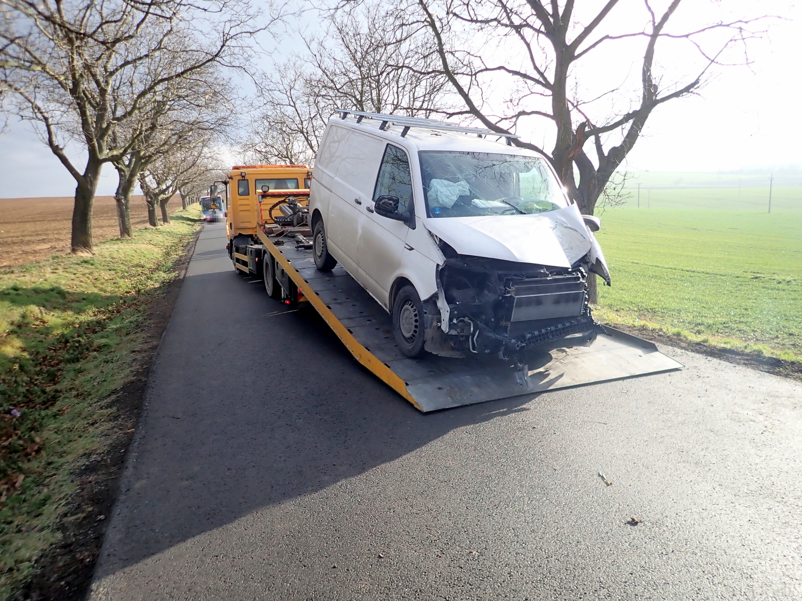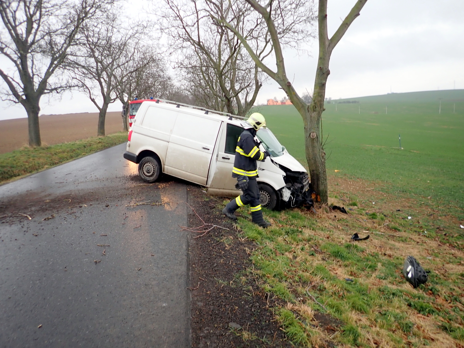 K další závažnější dopravní nehodě vyjely hned dvě jednotky profesionálních hasičů ze stanic Morkovice-Slížany a Kroměříž v 8:41 hodin. Nedaleko obce Dřínov narazil dodávkový automobil do stromu u komunikace. Ve voze se zranily hned tři osoby - dvě dospělé a jedno dítě. Všichni byli po prvotním ošetření odvezeni zdravotnickou záchrannou službou do nemocnice.  Po zajištění vozidla a dokumentaci nehody policií byl vůz naložen na odtahovou službu a byl proveden úklid komunikace. V 13:45 hodin se hasiči vrátili zpět na své základny.