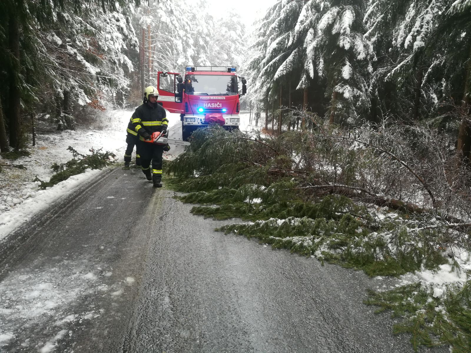 První zásah v tento den měli hasiči z krajského města. Vyjeli po jedné hodině v noci do Malenovic, kde odstranili strom z komunikace.