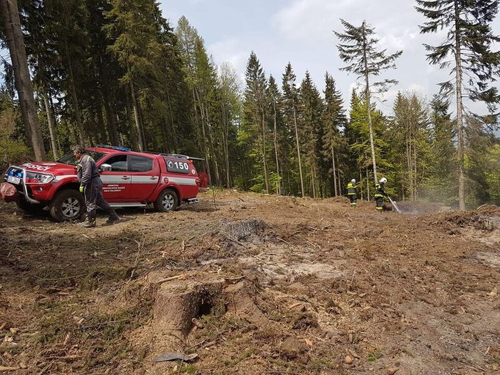 Na místo hlášené události vyjeli dobrovolní hasiči z Halenkova s terénním automobilem zn. Mitsubishi a čtyřkolkou. Díky této technice se hasiči dostali až na označené místo, kde už čekala hlídka policistů na koních. Rychlým průzkumem hasiči zjistili, že na ploše po lesní těžbě není jedno, ale více špatně uhašených ohnišť po pálení dřevního odpadu. K jejich uhašení hasiči nasadili vysokotlaký proud z terénního vozidla Mitsubishi. Vezená zásoba vody ale k důkladnému uhašení a prolití všech ohnišť nestačila, proto si velitel jednotky povolal ještě i cisternový automobil Tatra 815. Ten se ale ve velmi špatně přístupném a těžkém terénu až na požářiště nedostal a zůstal ve vzdálenosti asi 700 metrů. Hasiči tak k němu museli s terénním vozidlem pro vodu dojíždět.