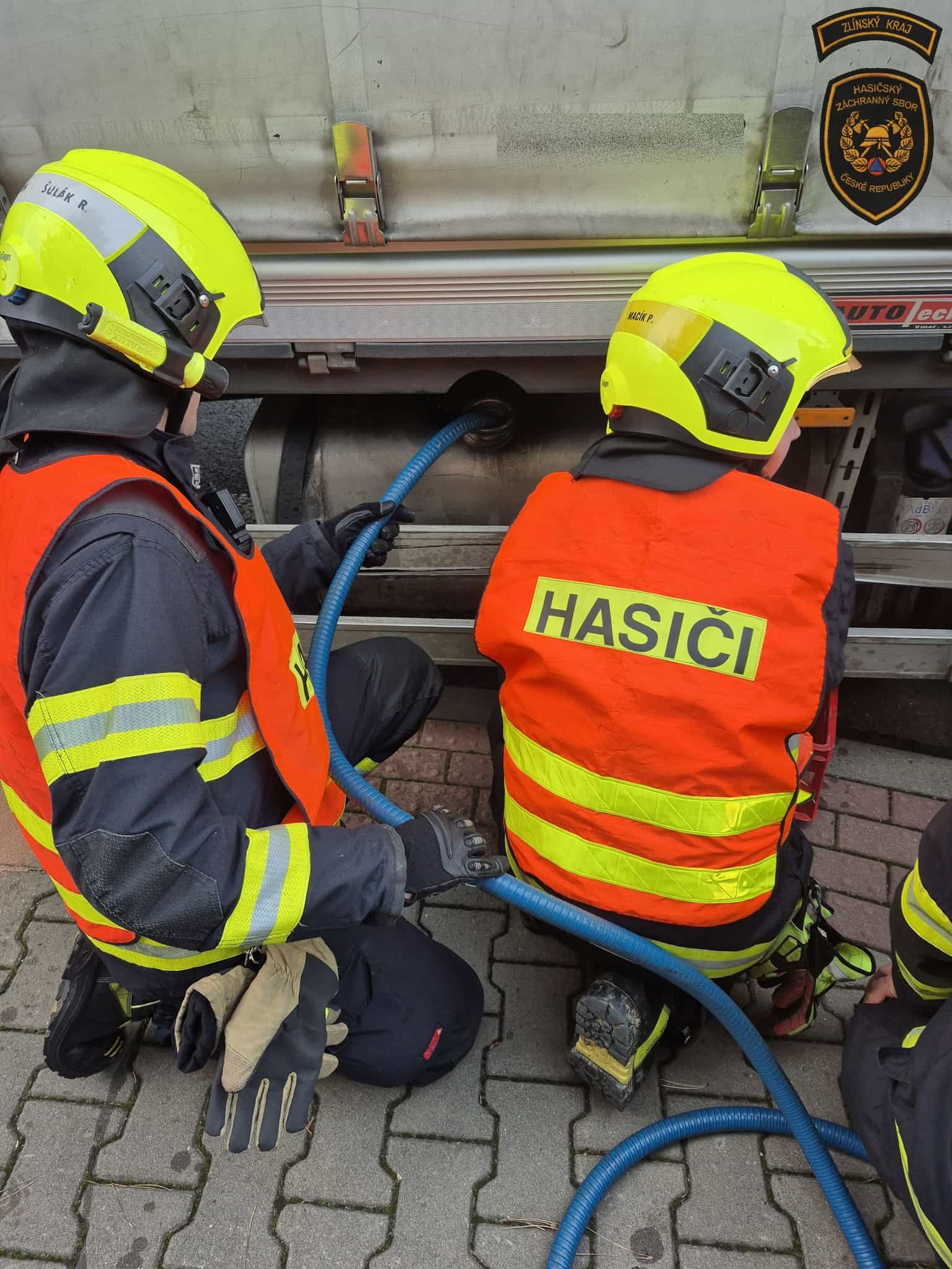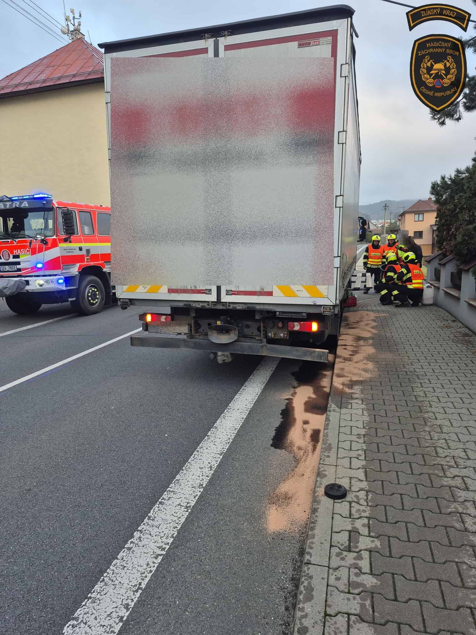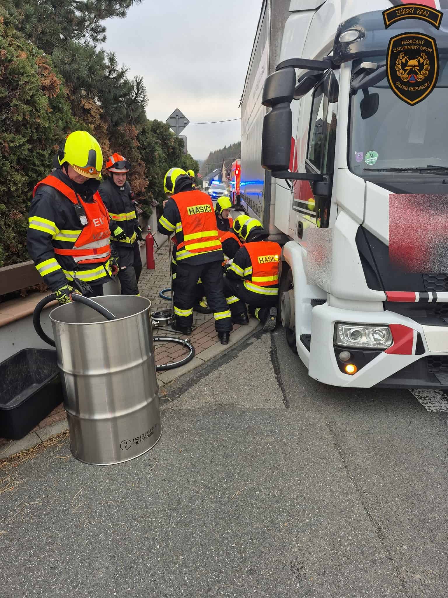 Profesionální hasiči ze Vsetína a dobrovolná jednotka z Vizovic zasahovali dopoledne u nehody osobního auta a kamionu v obci Jasenná. Náraz poškodil nádrž kamionu a způsobil výrazný únik provozních kapalin. Hasiči na místě provedli protipožární opatření, přečerpali zbylou naftu a zasypali uniklé látky sorbentem. Událost se obešla bez zranění.