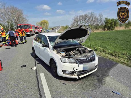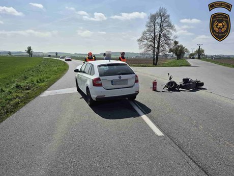 Střet osobního vozidla s motocyklem skončil zraněním dvou účastníků. Na místě zasahovali hasiči a zdravotnická záchranná služba.