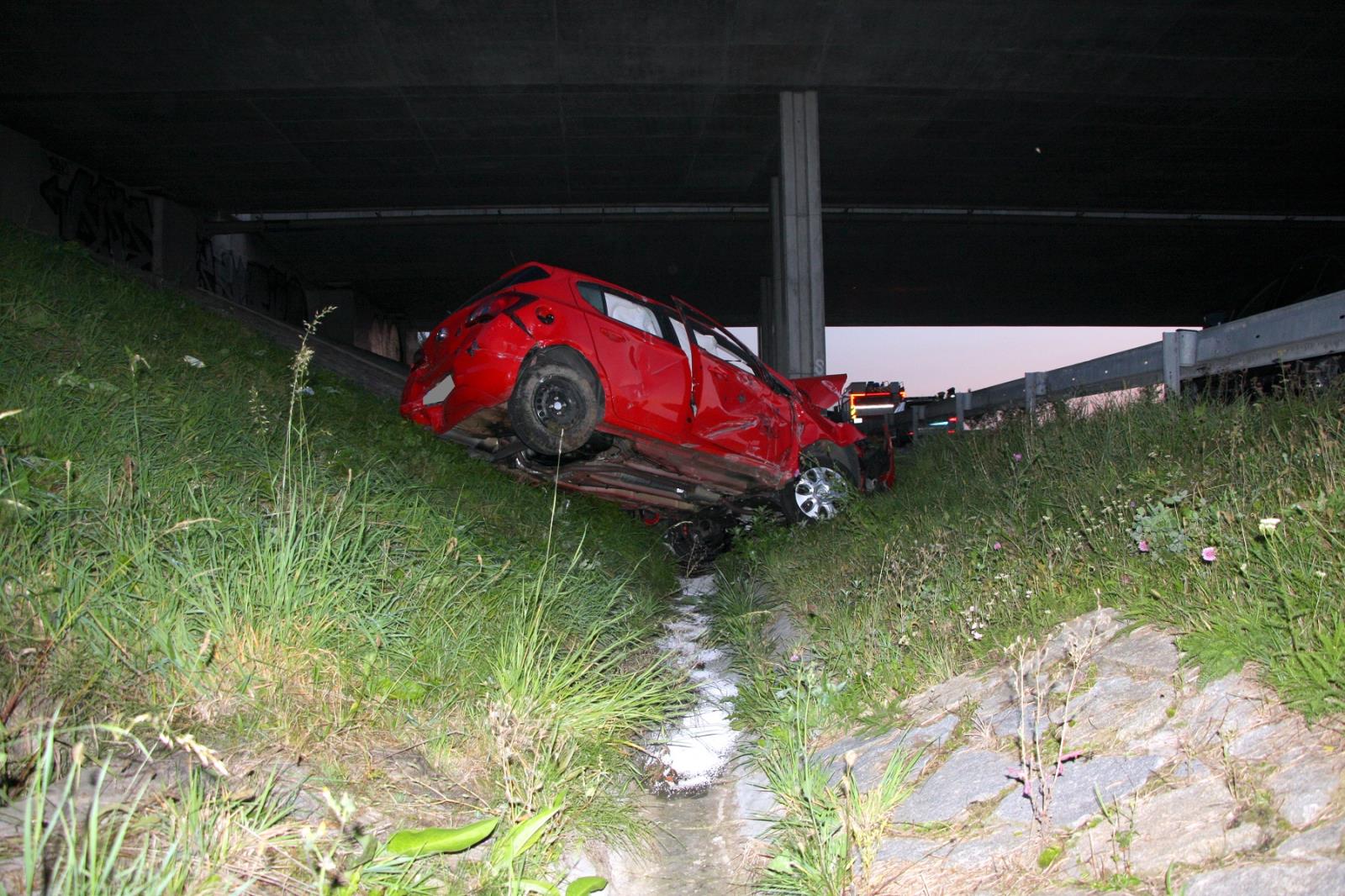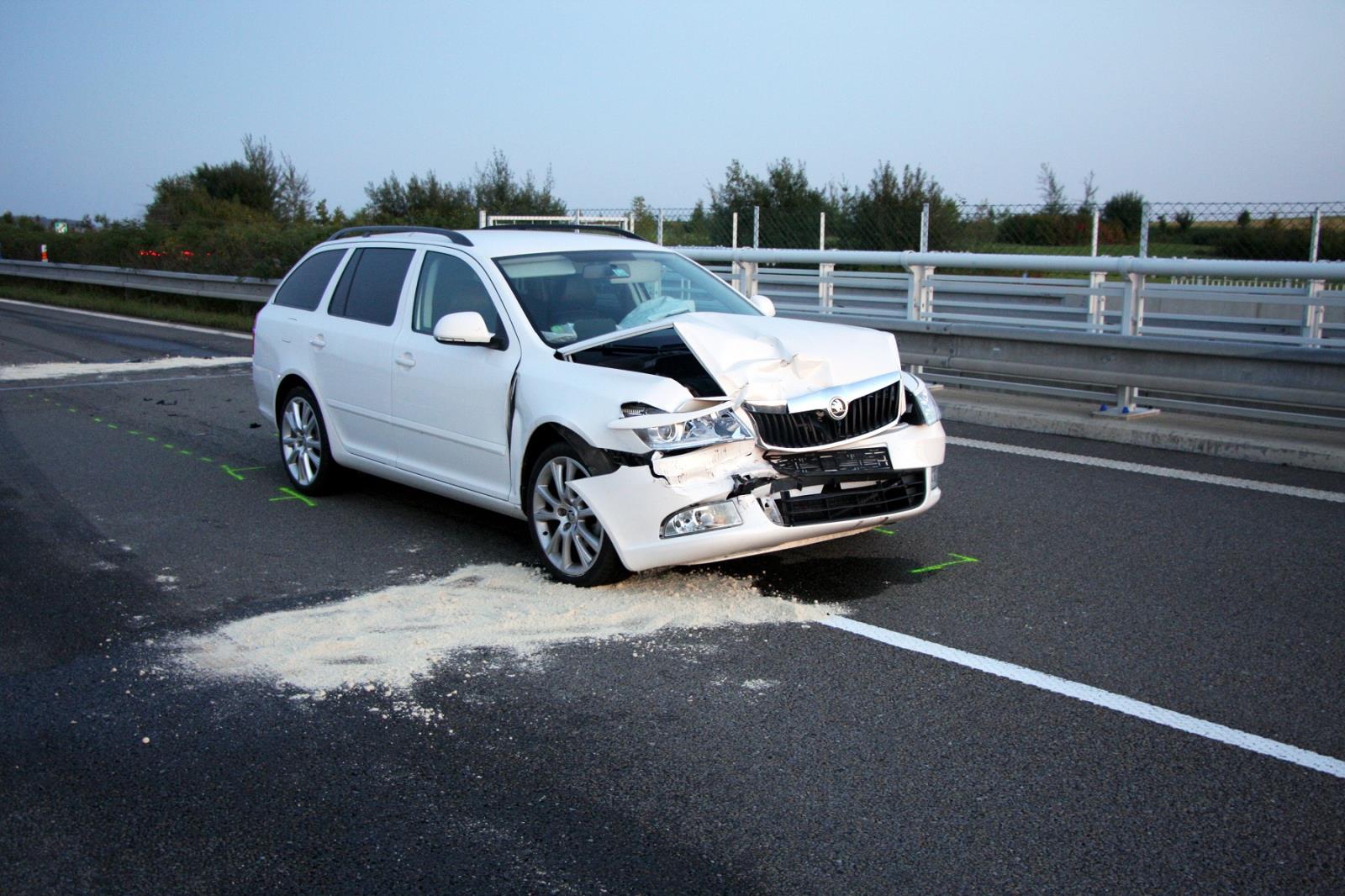 Po příjezdu a provedení průzkumu bylo zjištěno, že se jedná o vážnou dopravní nehodu se zraněním. Po střetu s vozem Škoda Octavia vylétla řidička automobilem Opel Corsa přes zábradlí mimo dálnici a skončila pod mostem. Po havárii zůstala ve vozidle zaklíněna. Hasiči provedli její vyproštění pomocí páteřové desky a s těžkým zraněním byla letecky transportována do nemocnice. Řidič vozu Škoda Octavia utrpěl šok a do své péče si jej převzala posádka zdravotnické záchranné služby. Další dva spolujezdci zraněni nebyli.