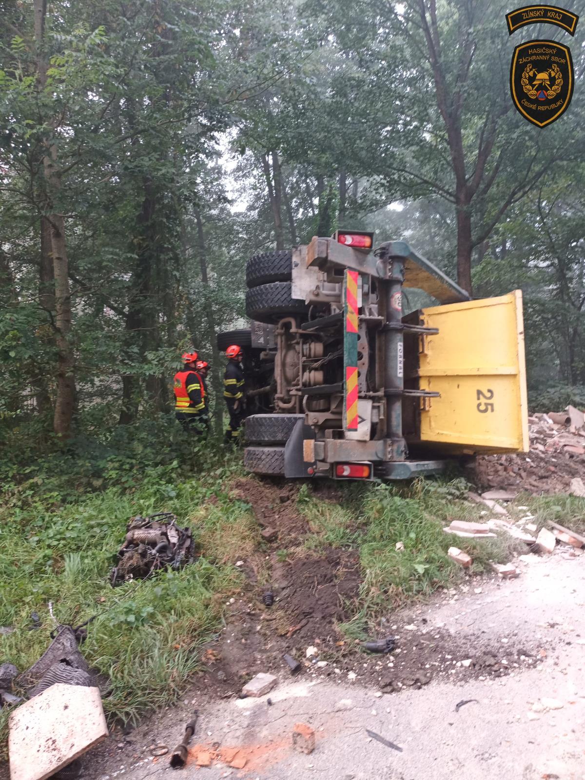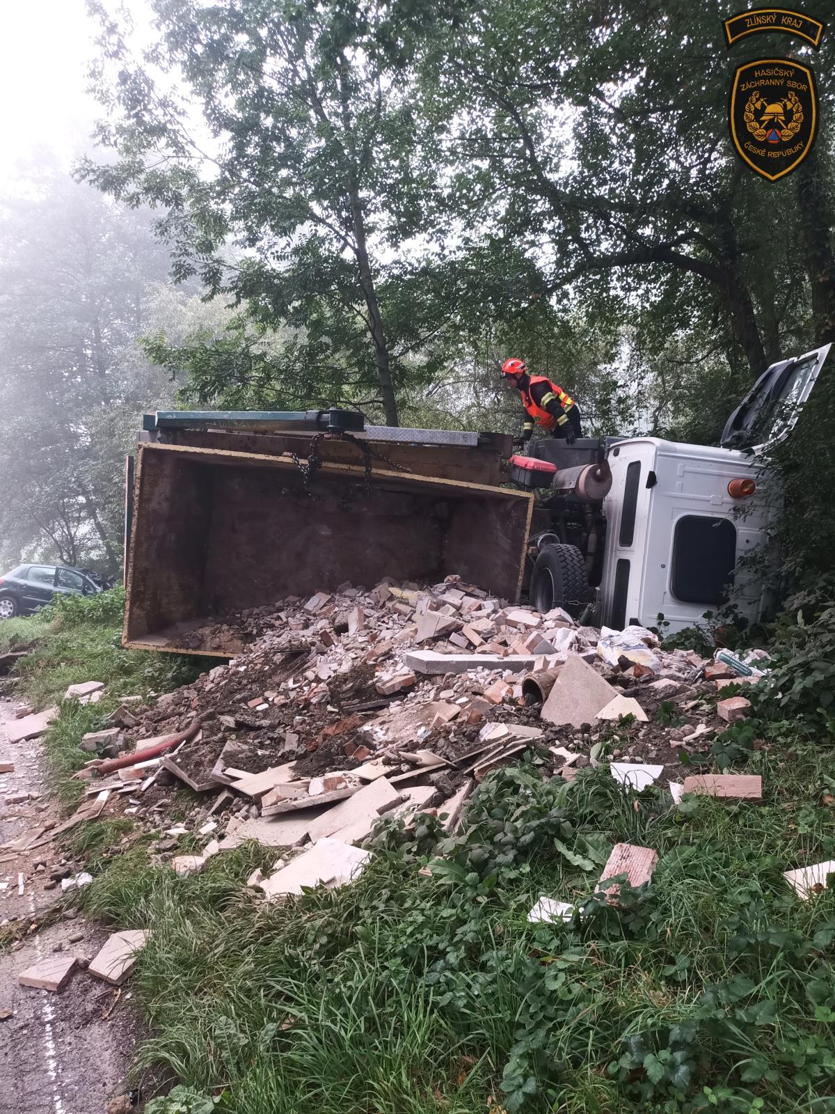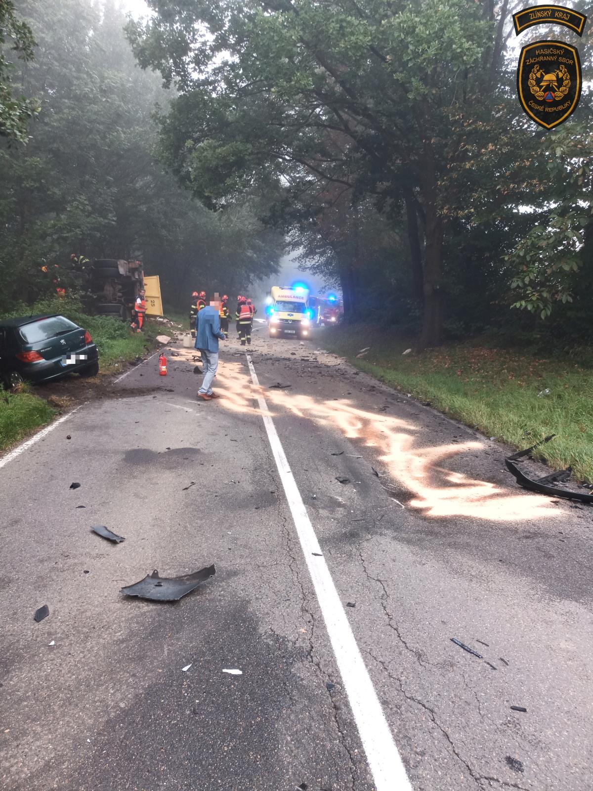 Vážná dopravní nehoda uzavřela na celé úterní dopoledne silnici ve Zlíně - Malenovicích ve směru na Salaš. Ke střetu vozidel došlo před osmou hodinou ranní. Nákladní vozidlo, vezoucí kontejner se sutí, skončilo mimo silnici na boku. Náklad se tak vysypal na několika metrech silnice. Osobní vůz taktéž zajel do keřů vedle cesty.