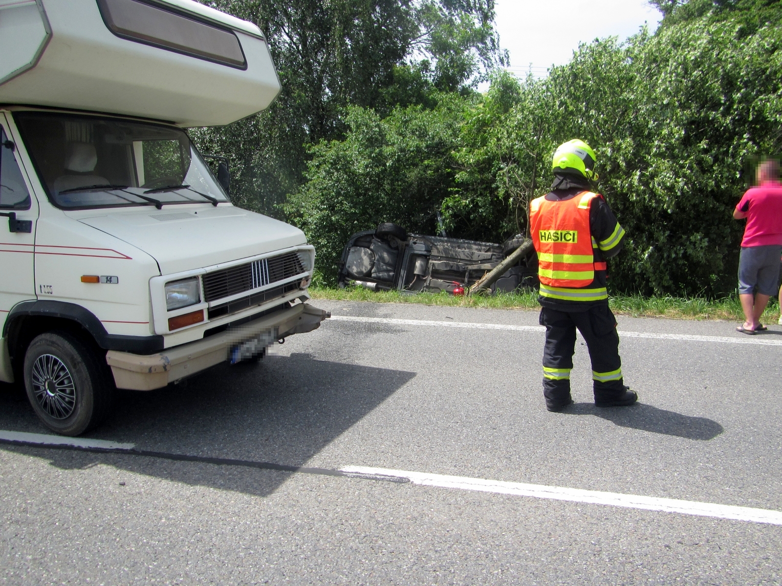 U nehody osobního vozu a karavanu zasahovali hasiči