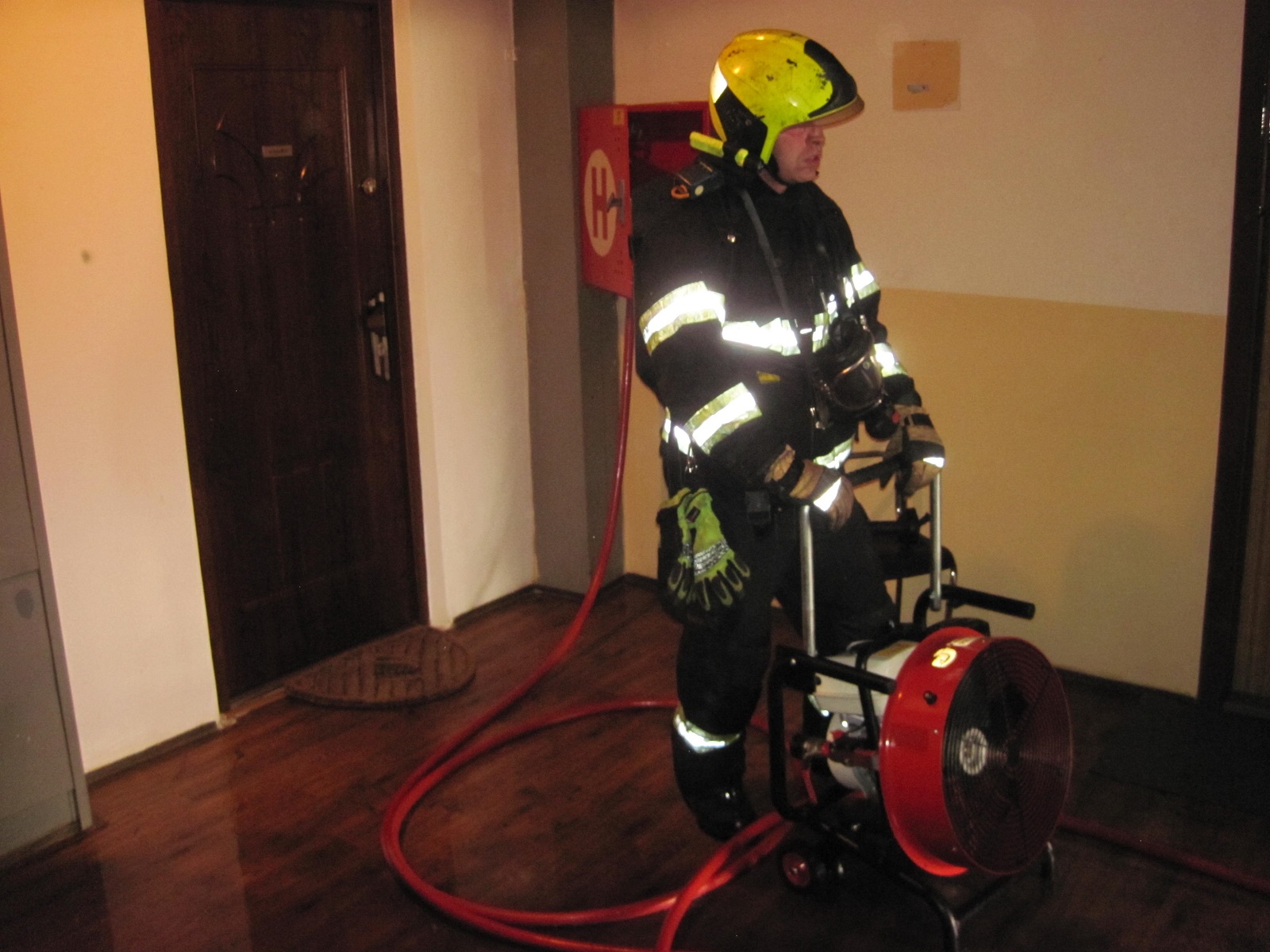 Hasiči po příjezdu zjistili, že dva příslušníci Policie České republiky vyrazili dveře hořícího bytu. Jeden z nich začal hasit jedním vodním proudem vody a druhý vběhl do hořícího bytu. Zde uviděl jednoho muže, který po chvíli byt opustil. Další prohlídkou uviděl na zemi ležet druhého muže, kterého už musel vyvést ven. Evakuace obyvatel domu také nebyla potřeba, protože opustili dům před příjezdem hasičů.