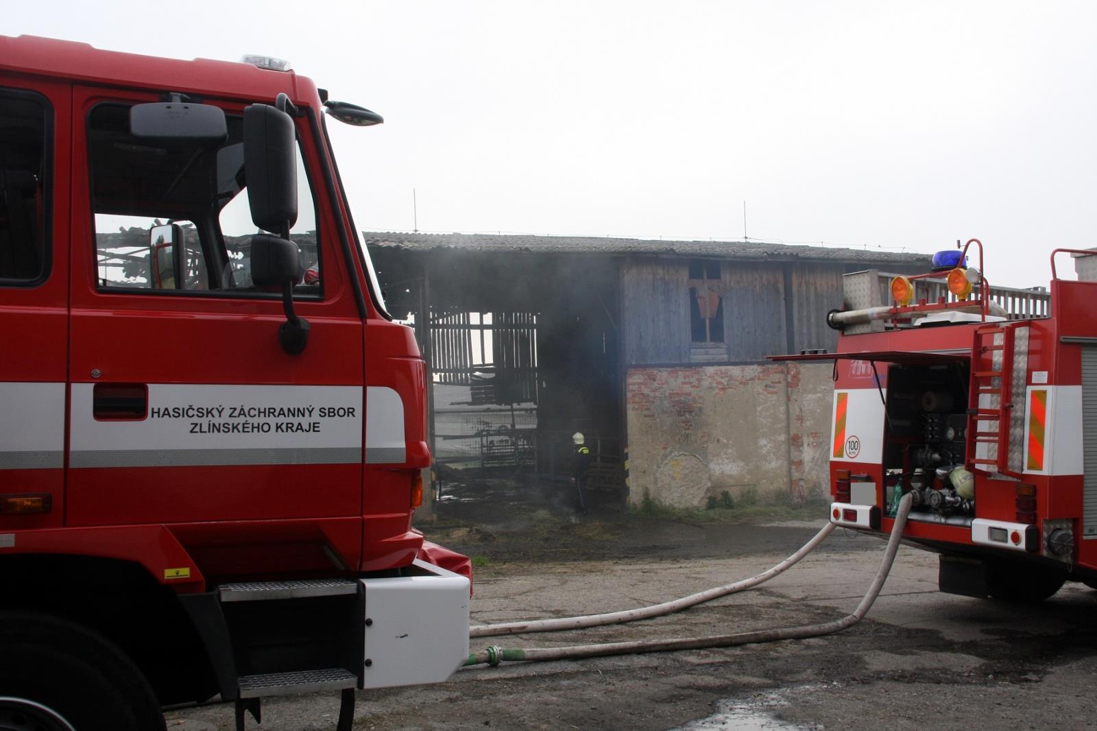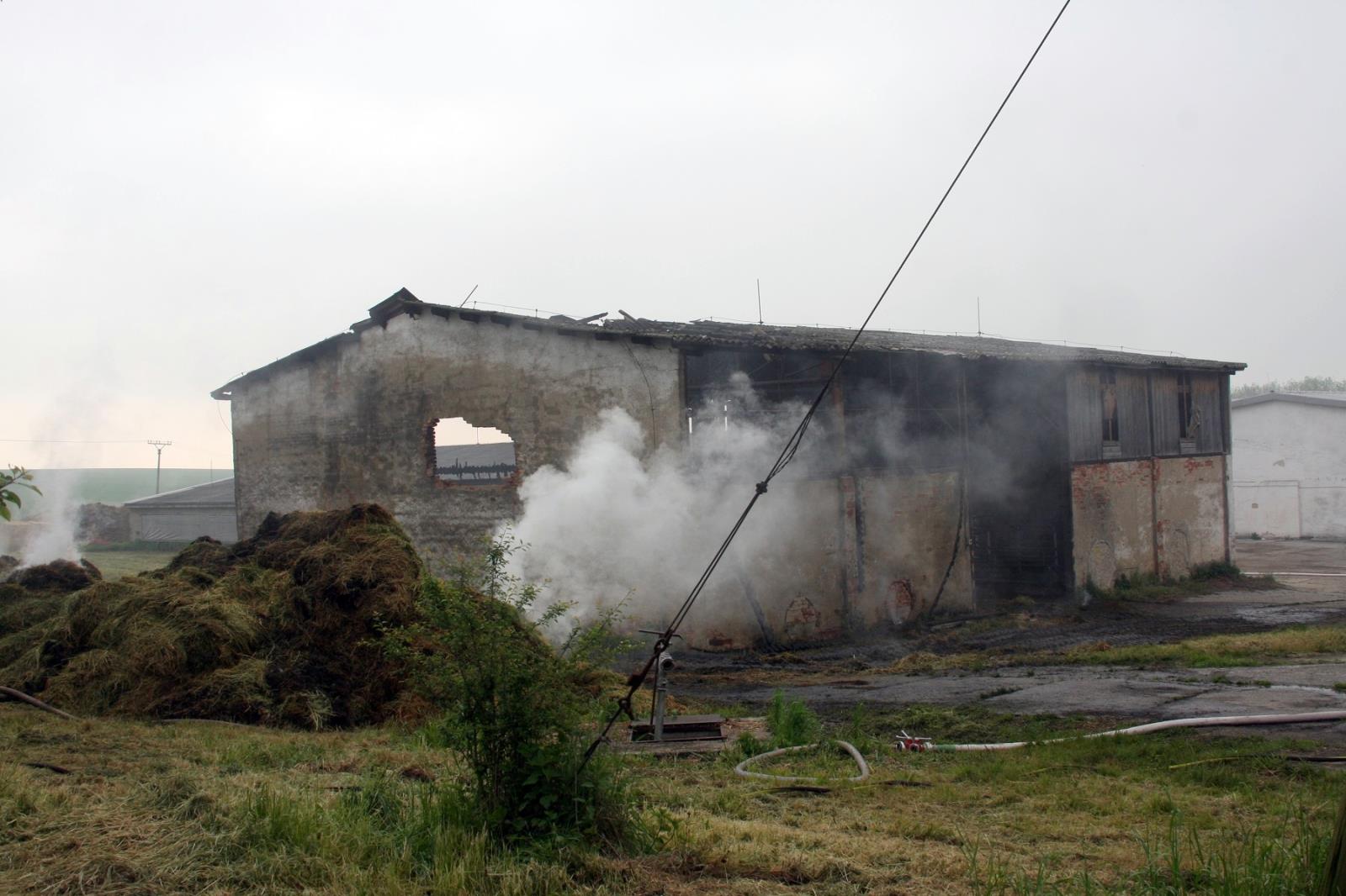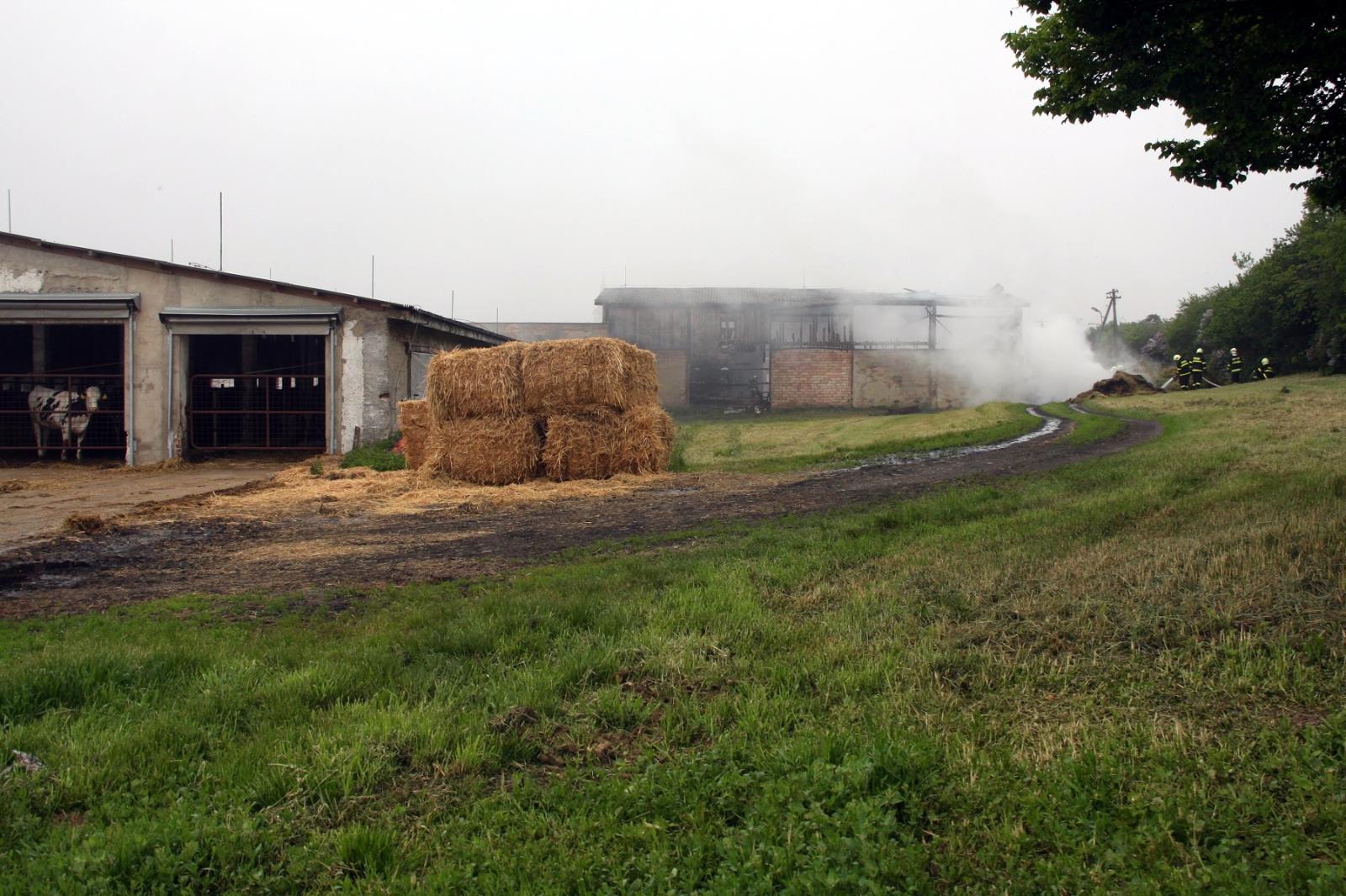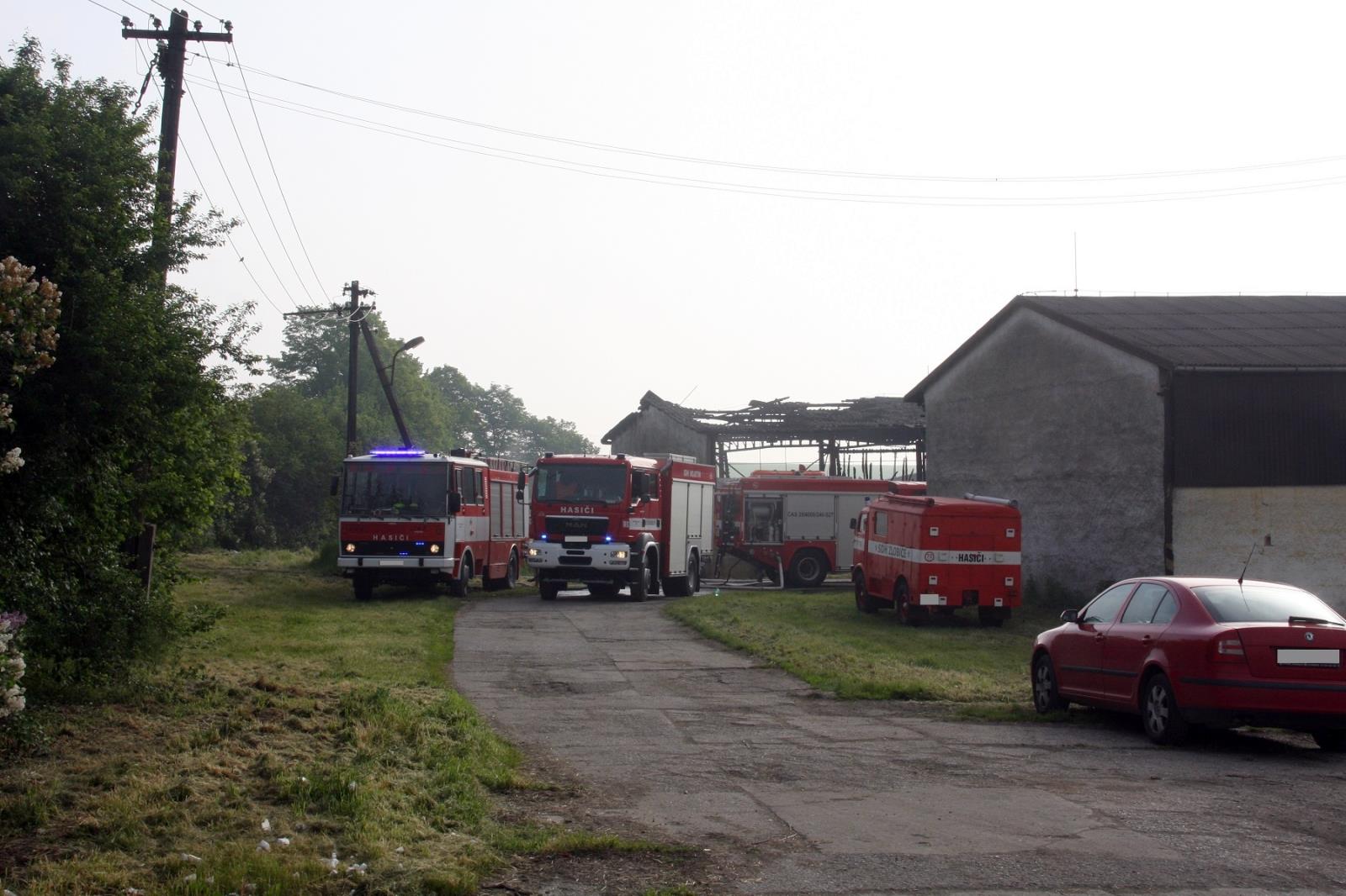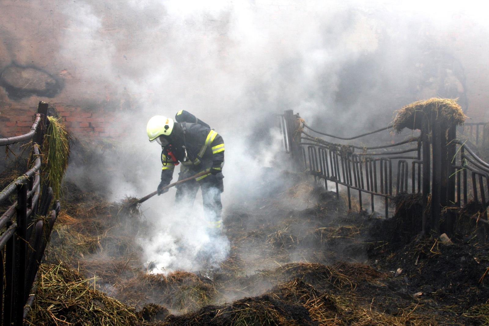 Jako první se na místo dostavili profesionální hasiči se dvěma cisternami. Už v době příjezdu byl požárem zasažen veškerý uskladněný materiál v hale o rozměru asi 20x15 metrů. V těsné blízkosti se nacházela další budova, ve které bylo ustájeno asi 200 ks dobytka. Hasiči okamžitě natáhli několik proudů a zabránili rozšíření požáru. Pomocí přetlakové ventilace se podařilo uchránit prostory ustájení i před škodlivými zplodinami hoření.