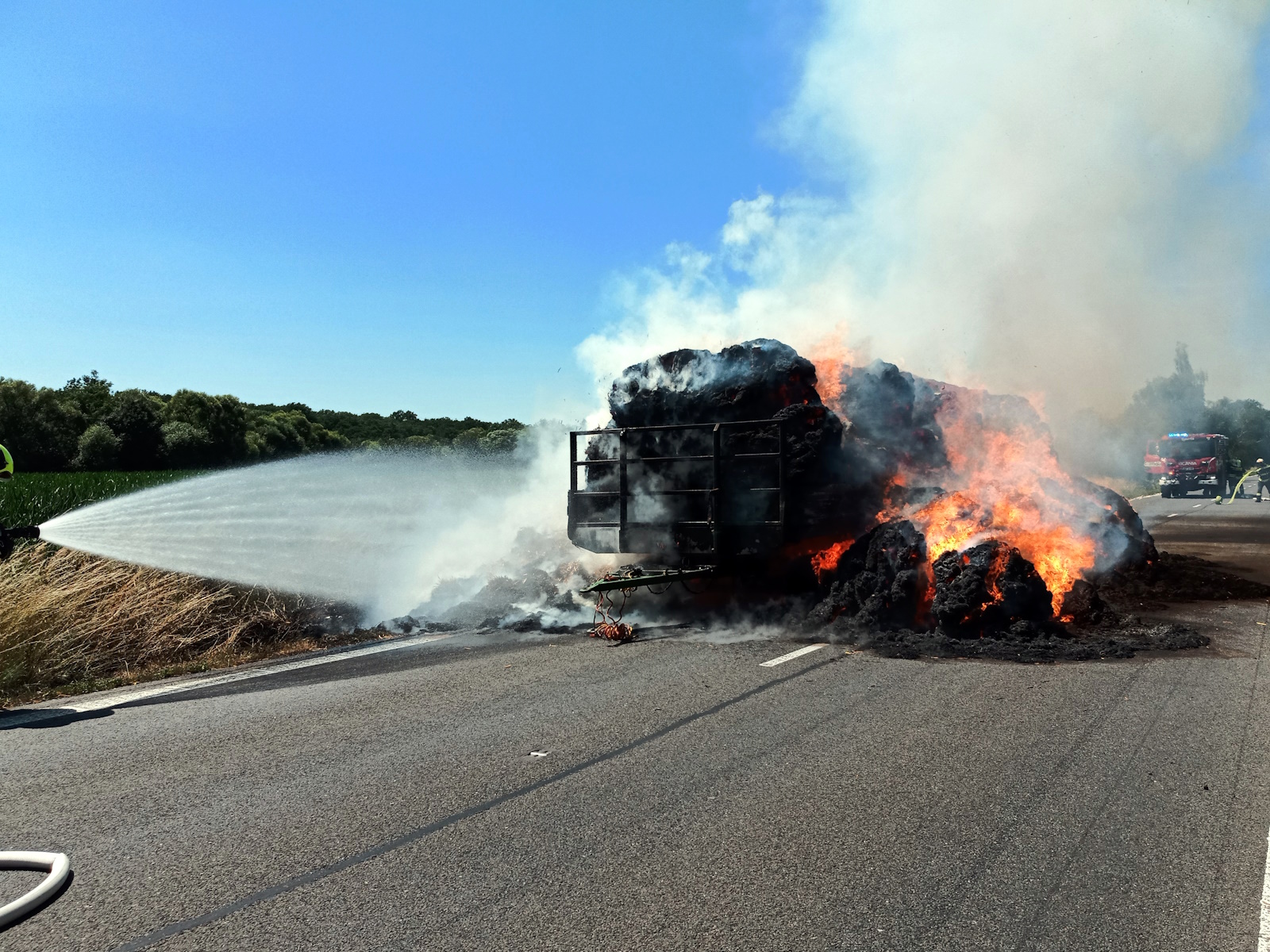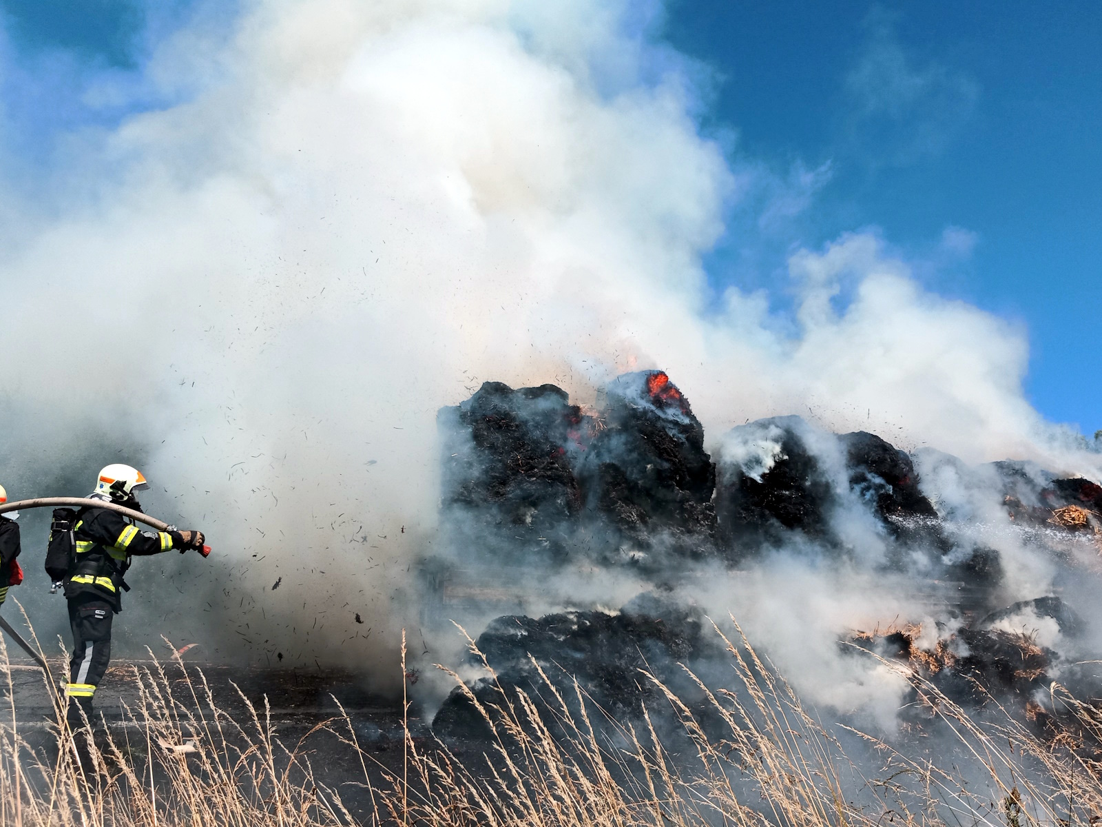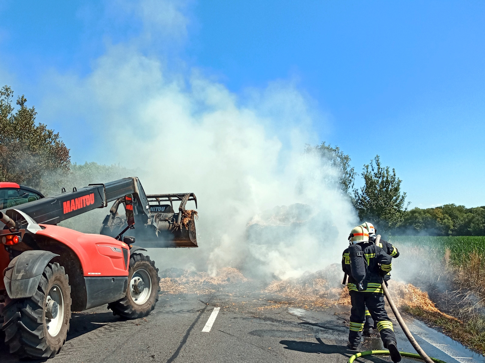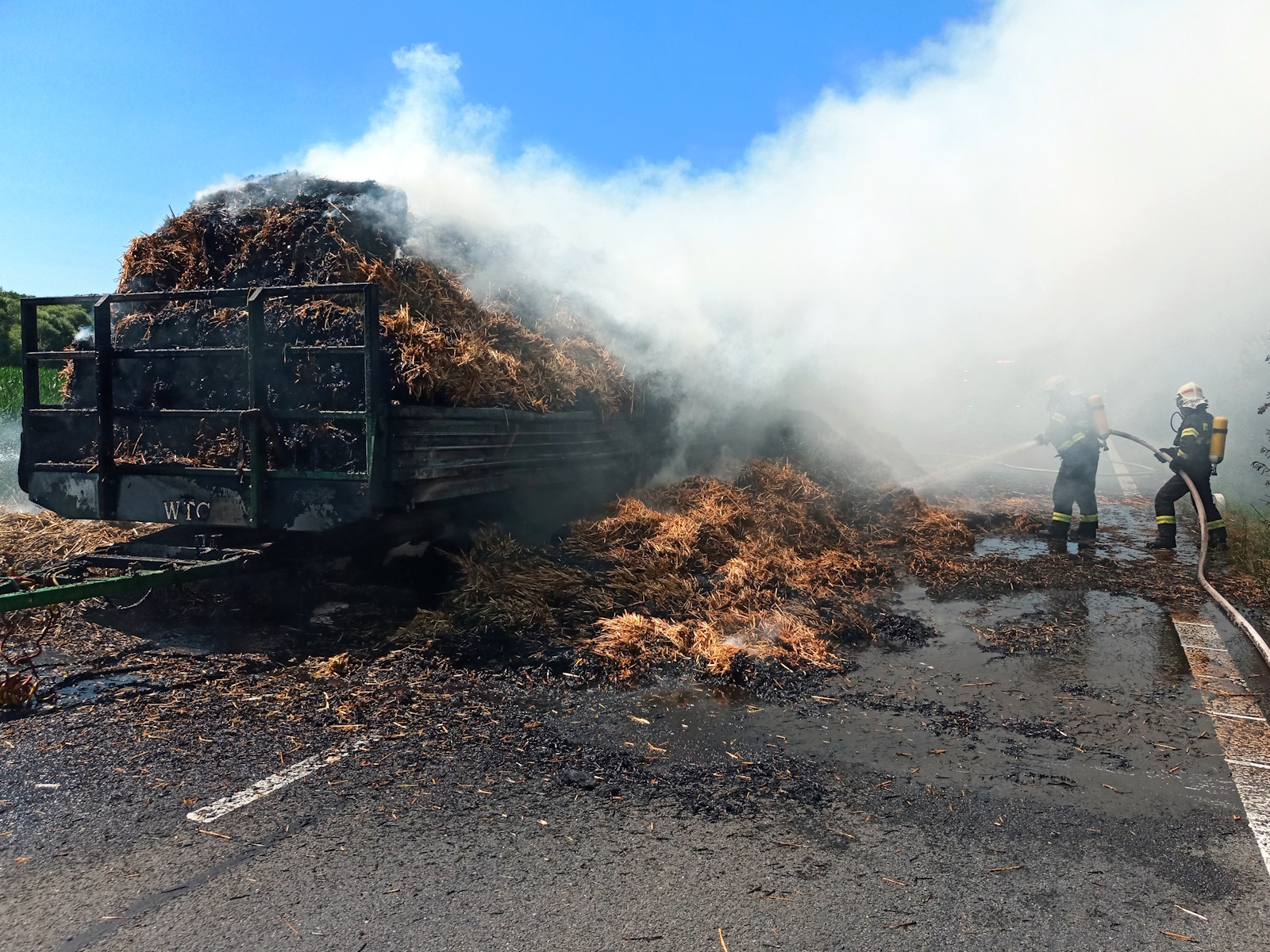 Po příjezdu byl potvrzen požár přívěsu s balíkovanou slámou. Řidič naštěstí traktor včas odpojil a odjel do bezpečné vzdálenosti. Hasiči okamžitě nasadili tři proudy a požár postupně lokalizovali. Na místo byly velitelem zásahu povolány také nakladače, kterými byl náklad postupně rozebírán a dále dohašován. Práci hasičům ztěžovaly extrémně vysoké teploty.