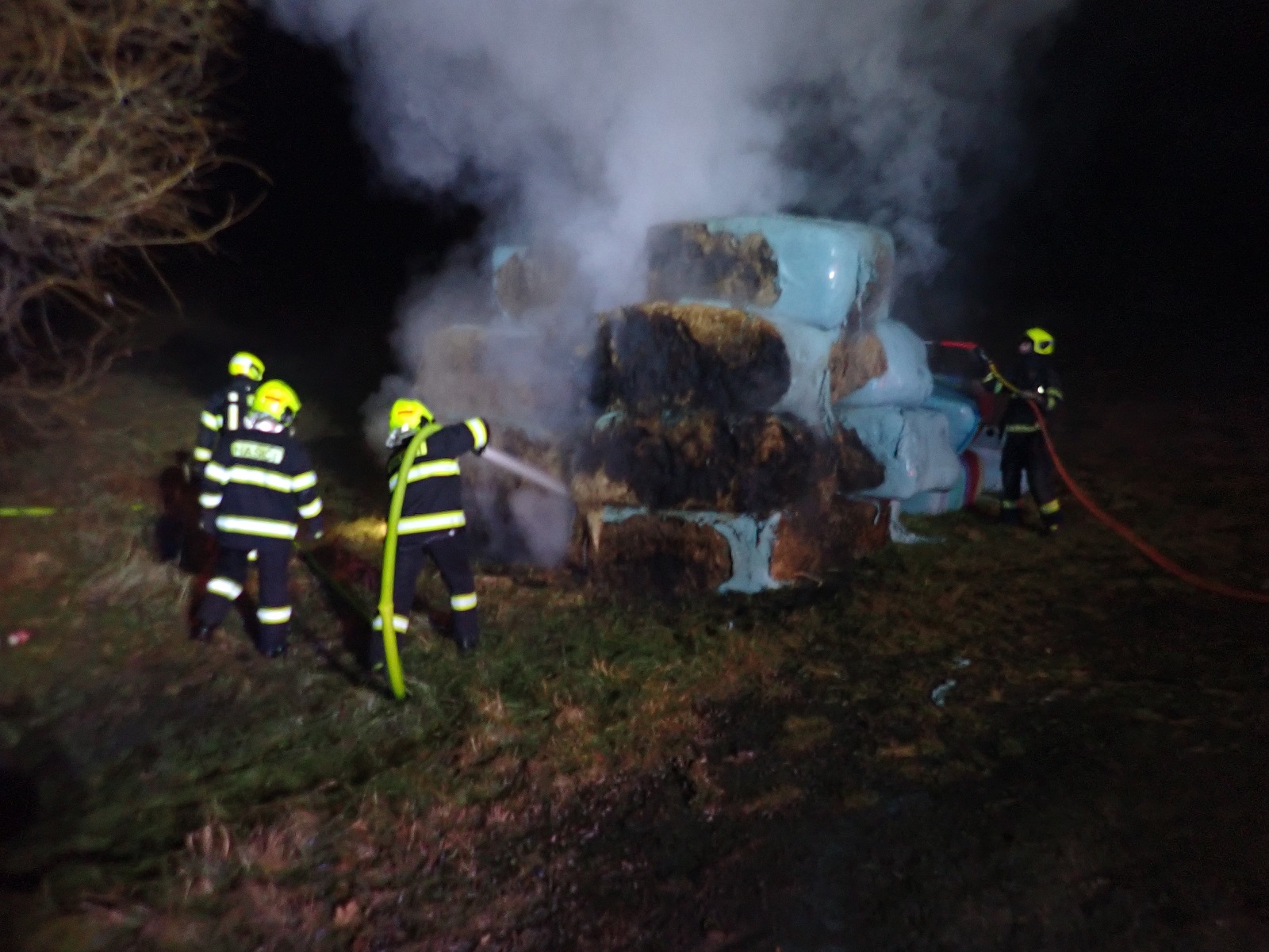 K požáru jsme museli jet opatrně, protože silnice byla místy namrzlá. Průzkumem byl potvrzen požár balíků poskládaných do malého stohu. K uhašení byly nasazeny dva vodní proudy vody. Stoh jsme rozebrali manuálně. Požárem bylo zasaženo deset balíků slámy. Uchráněno bylo patnáct balíků.