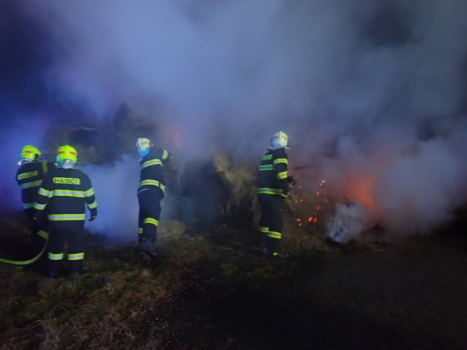 Hlášení, že hoří tři balíky slámy ve stohu, jsme přijali v 3:38 hodin. Požární poplach byl vyhlášen jednotkám profesionálních hasičů z Luhačovic a ze Zlína a jednotkám dobrovolných hasičů obcí Velký Ořechov a Hřivínův Újezd.