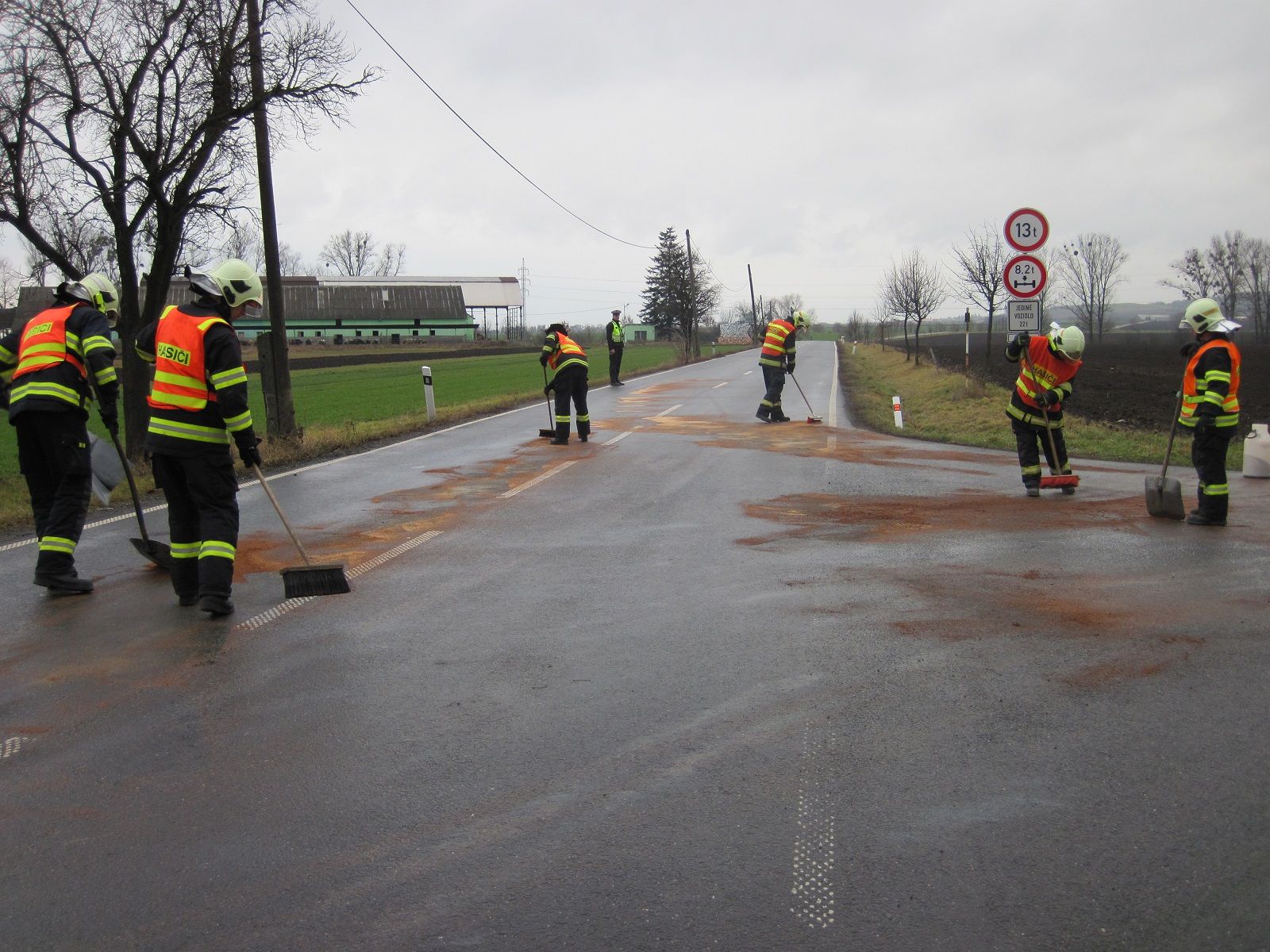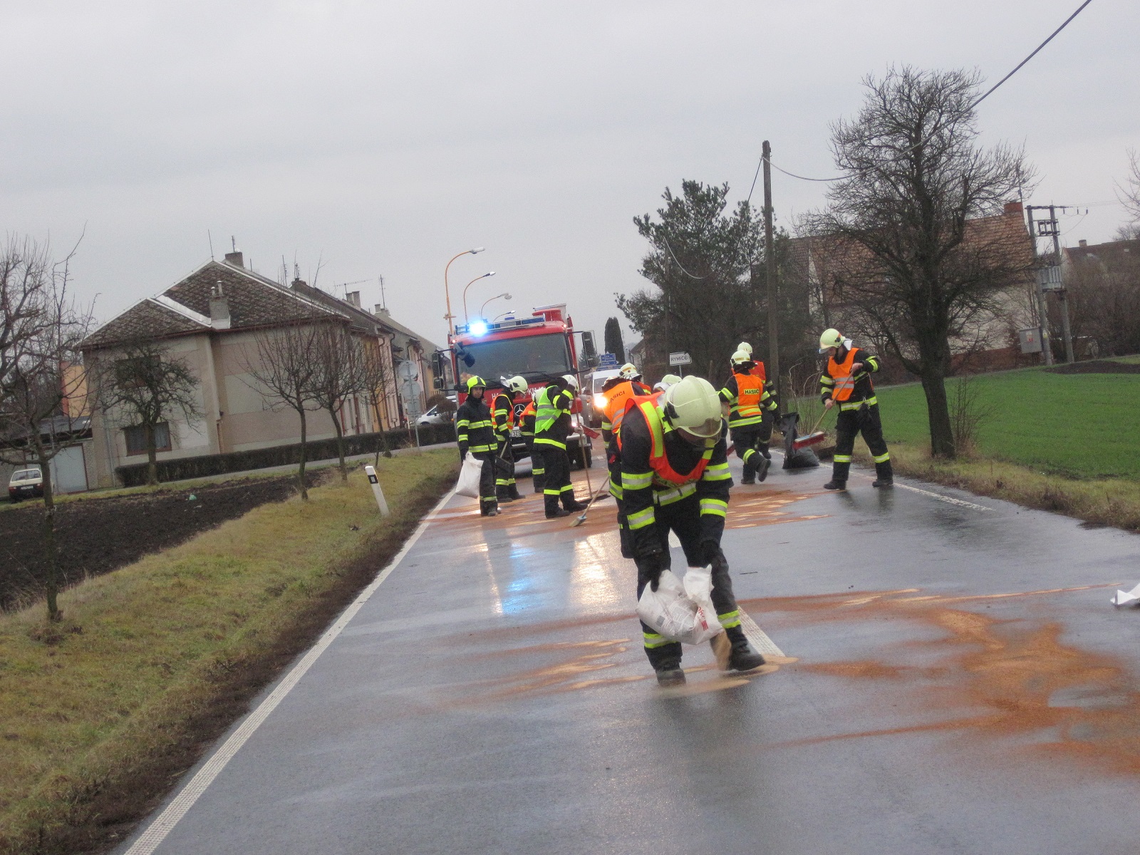 Šest jednotek hasičů odstraňovalo na Nový rok únik nafty na silnici č. 490 mezi Rymicemi a Starou Vsí na rozhraní Zlínského a Olomouckého kraje.